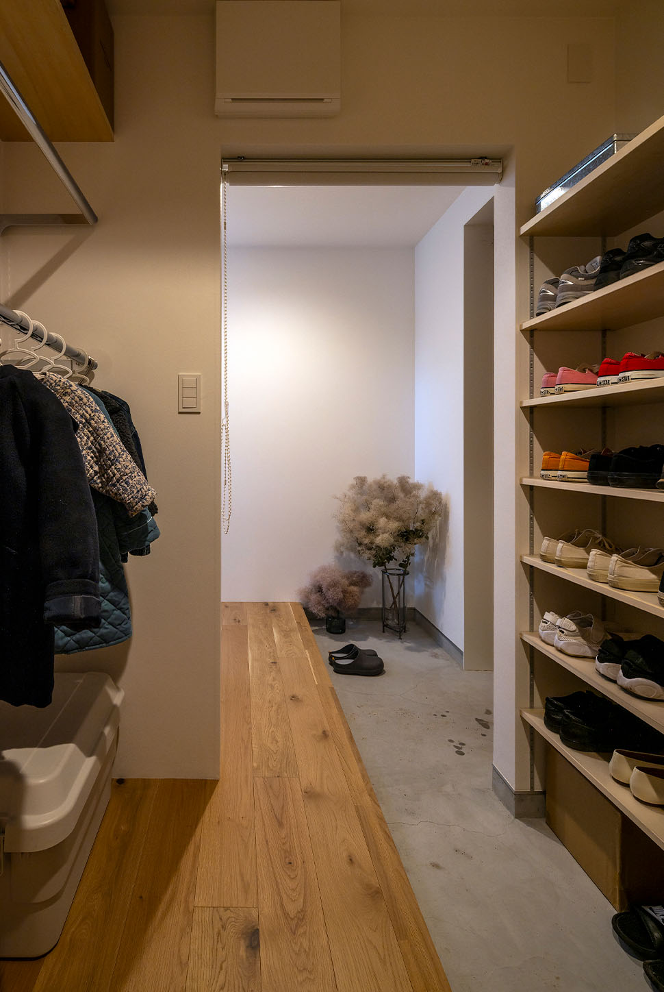 1階は吹き抜けと大開口があるLDKや水まわりで構成し、カーポートとリビングの間には内外をつなぐ中庭。「近々アスファルトにしてプールやバーベキューを楽しめるようにする予定です」と、家族の憩いの場を想定しています。2階には子ども部屋や寝室、Mさんの書斎、家族4人分の衣服をまとめたウォークインクローゼットを配置。朝目覚めると2階で着替え、1階で朝食や身支度を終え、モルタルの土間床が続くシューズクローゼットで外出準備を整えるといった毎日のルーティンを移動しながら効率的にこなす計画です。仕切りを必要最低限に抑えた1階や大きな吹き抜け、内外のつながりがもたらすのは、家族が伸びやかに過ごす毎日。「快適すぎて人をダメにする家って呼んでいます」と笑うMさんでした。
