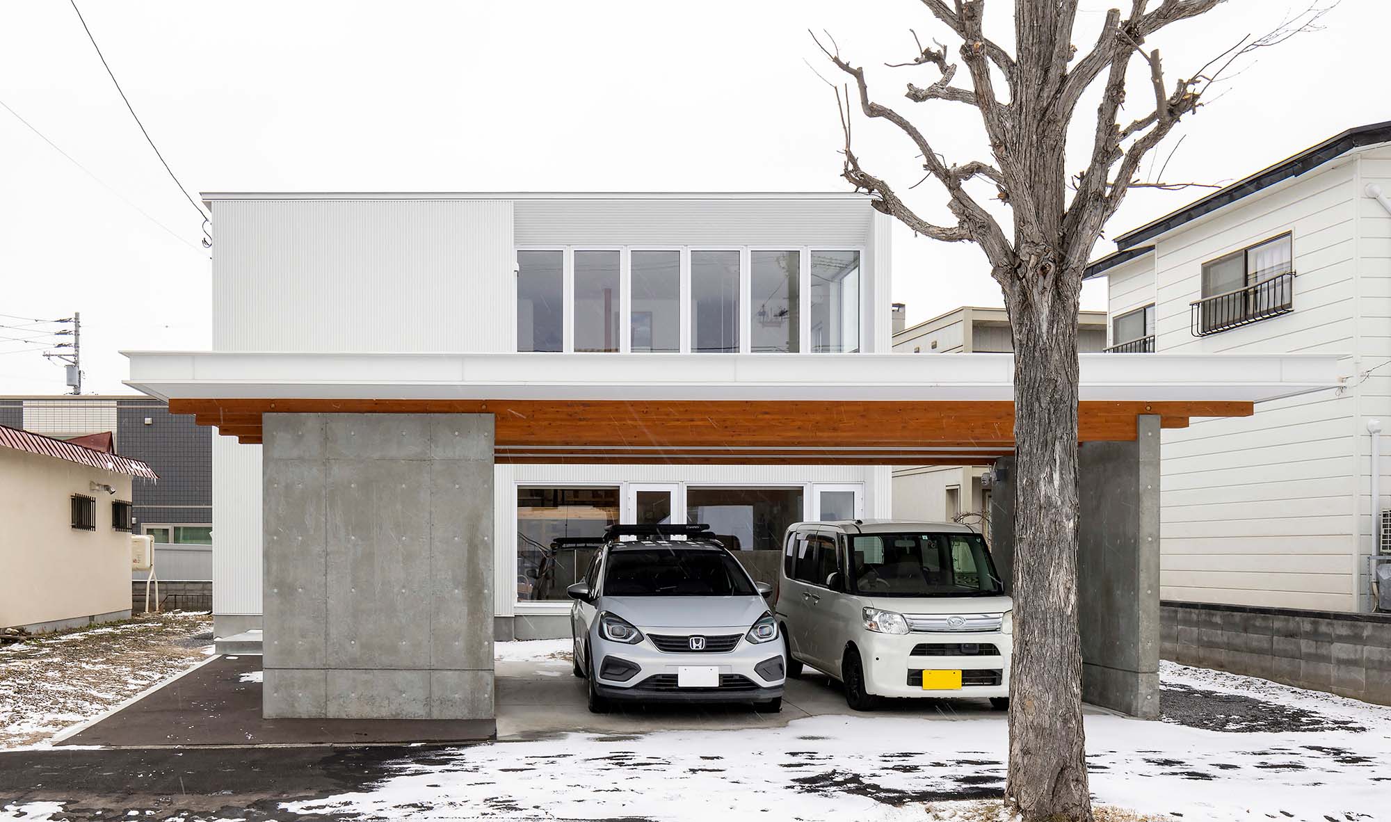 ここまではいいのですが、北側に寄せた家の玄関から道路に至るルートを頑張って除雪しないといけないという問題が発生します。そこをひと工夫して、カーポートの屋根を、物置を介してアプローチ側にはね出して、雪避け庇である雁木のような場所をつくり、極力除雪を楽にしています。