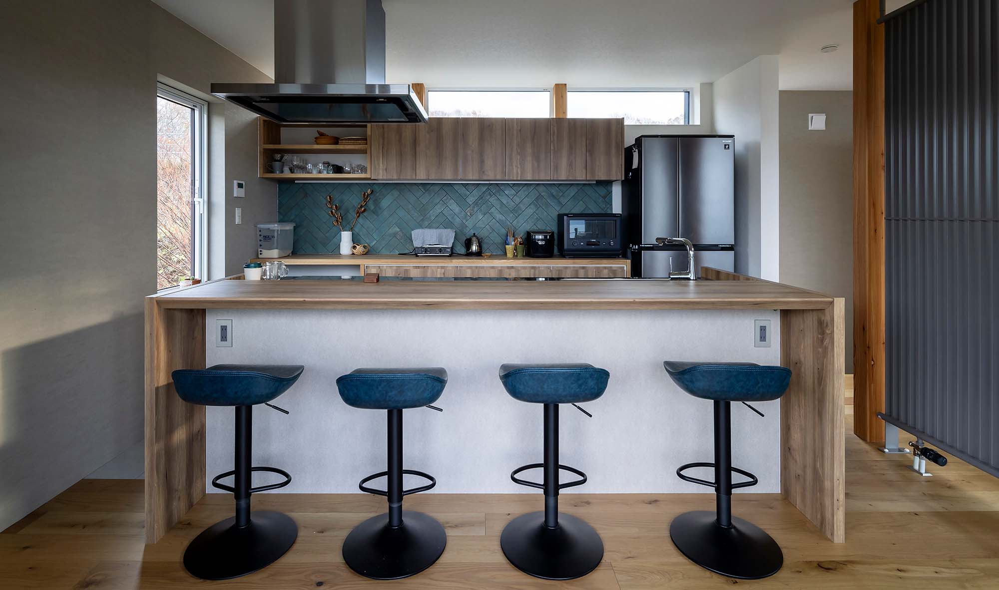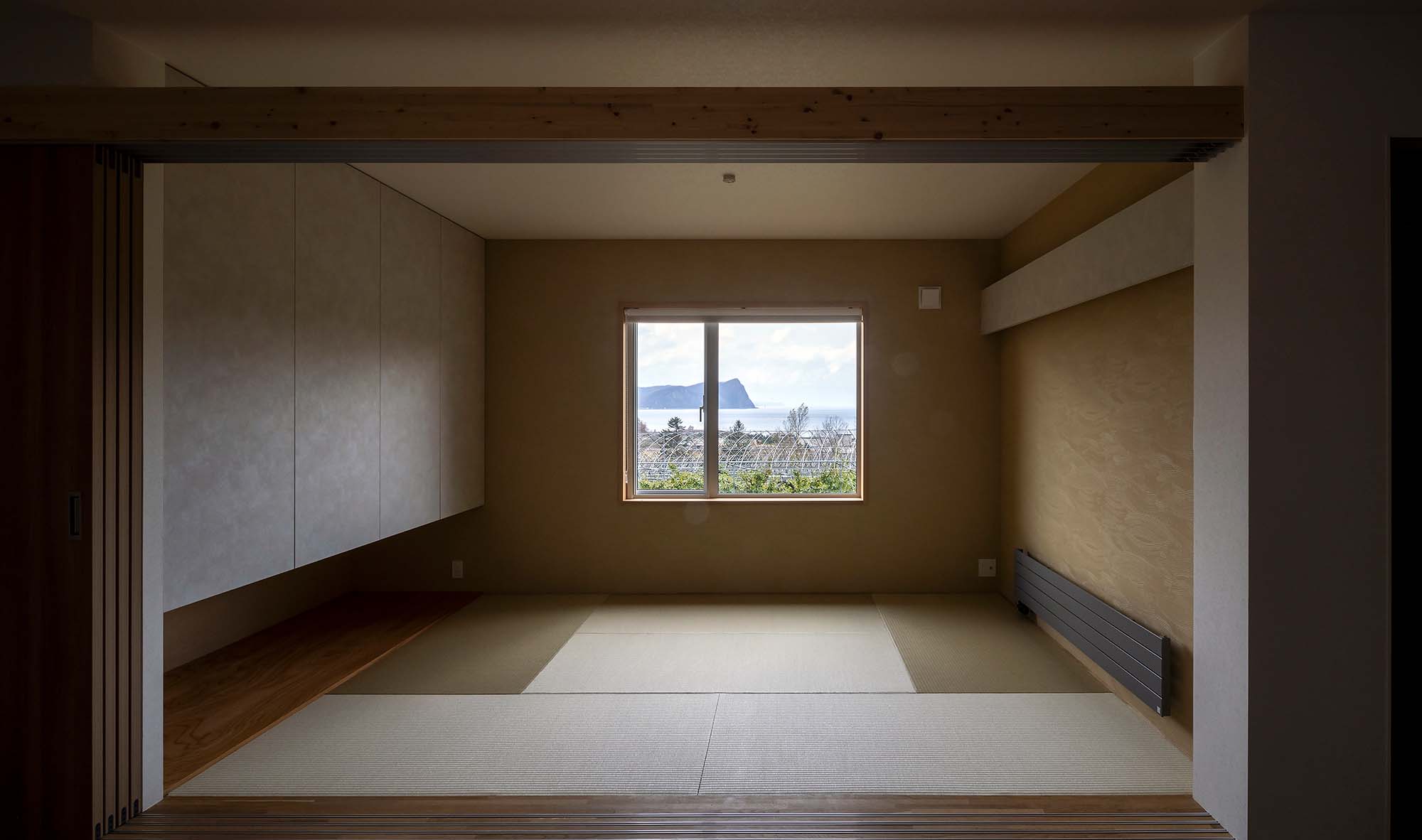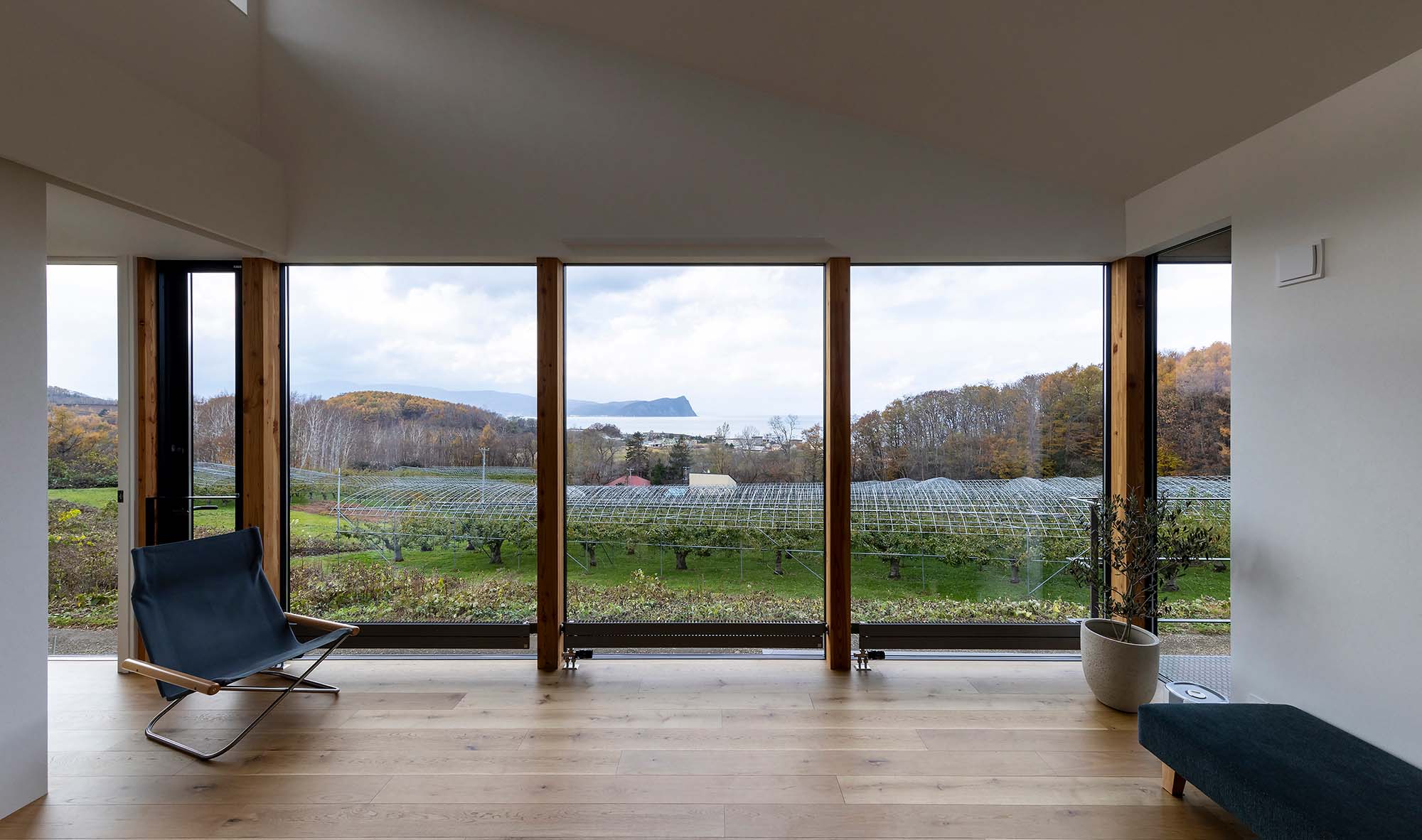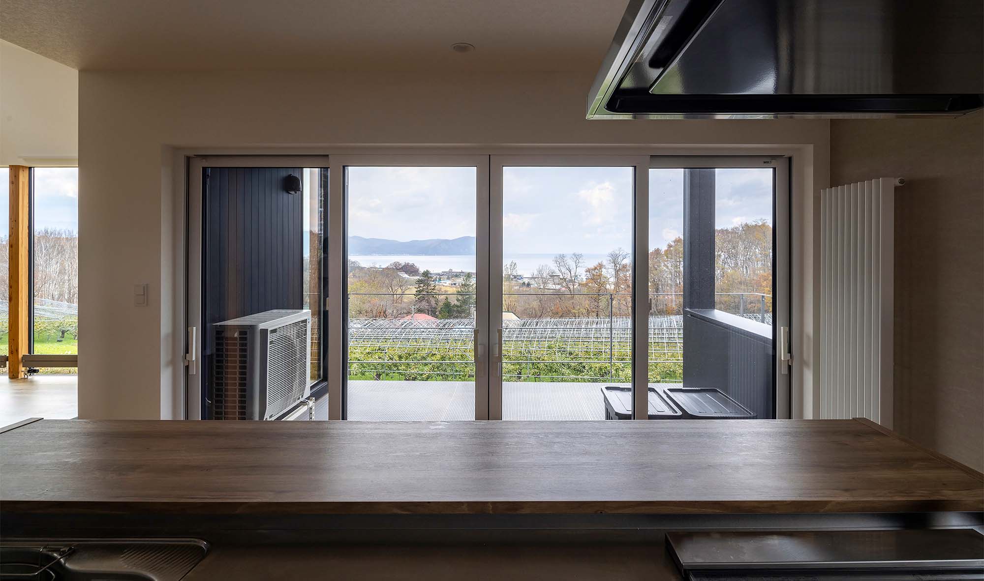 圧巻なのは海に向かって開く2階の大開口。余市湾に佇むシリパ岬をダイナミックな窓に映すリビング・ダイニングはこの家のハイライトです。「このロケーションを見た社長がリビングは2階にするべきだと提案してくださいました」と、敷地が持つ唯一無二の魅力を最大限に引き出した計画でした。