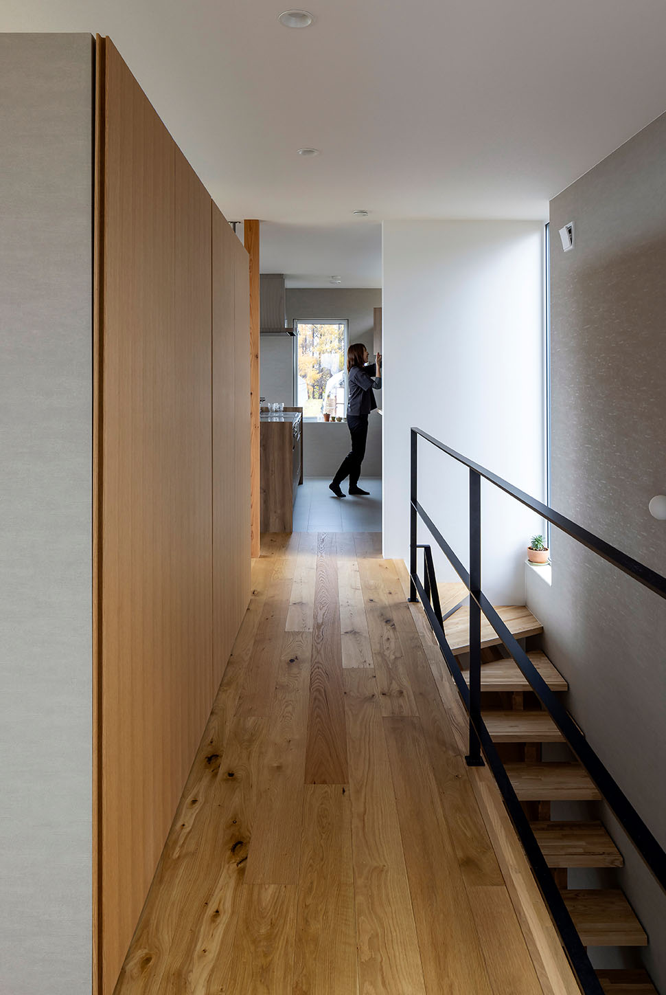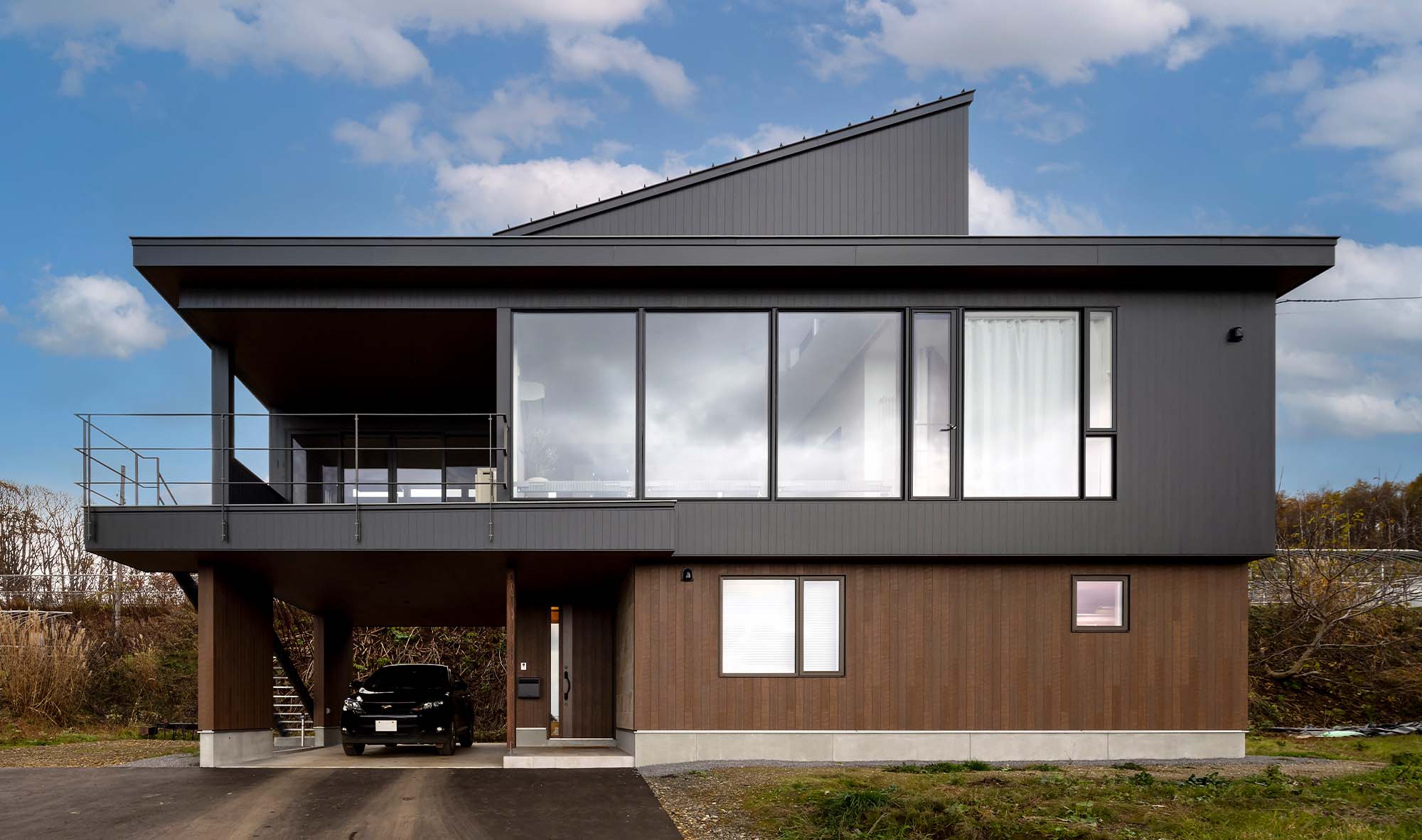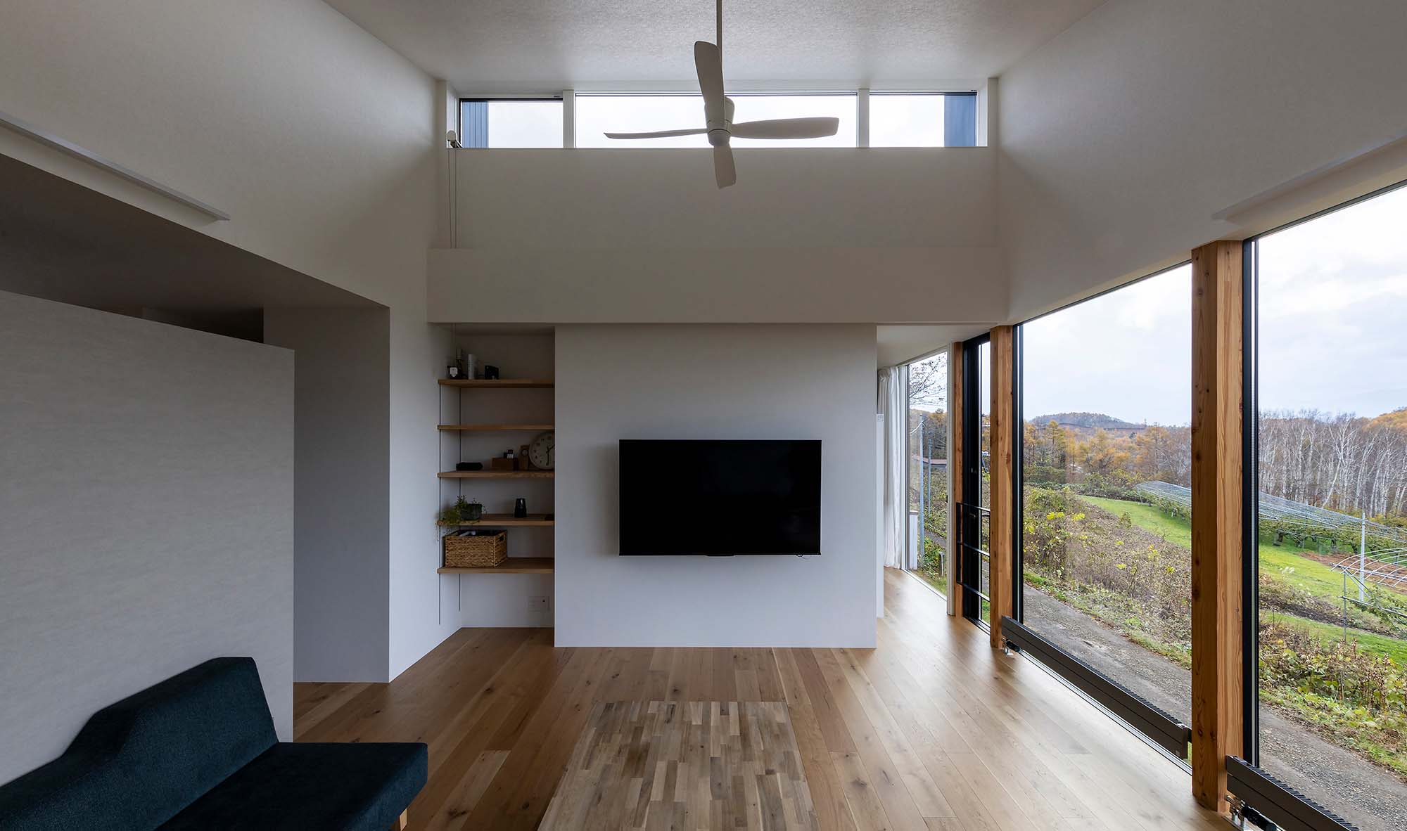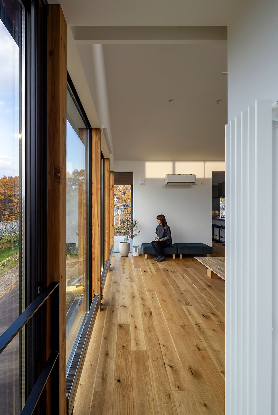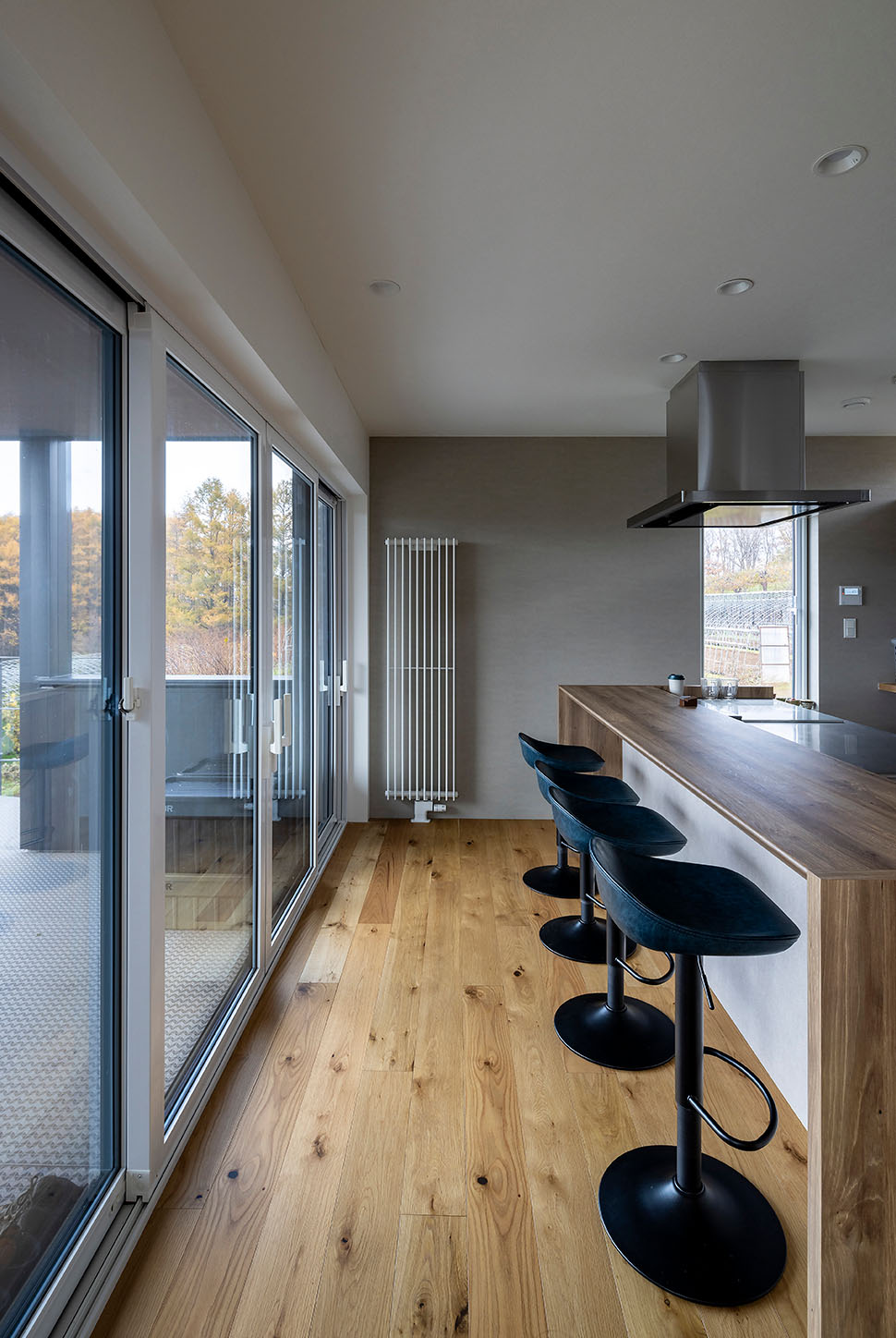 圧巻なのは海に向かって開く2階の大開口。余市湾に佇むシリパ岬をダイナミックな窓に映すリビング・ダイニングはこの家のハイライトです。「このロケーションを見た社長がリビングは2階にするべきだと提案してくださいました」と、敷地が持つ唯一無二の魅力を最大限に引き出した計画でした。