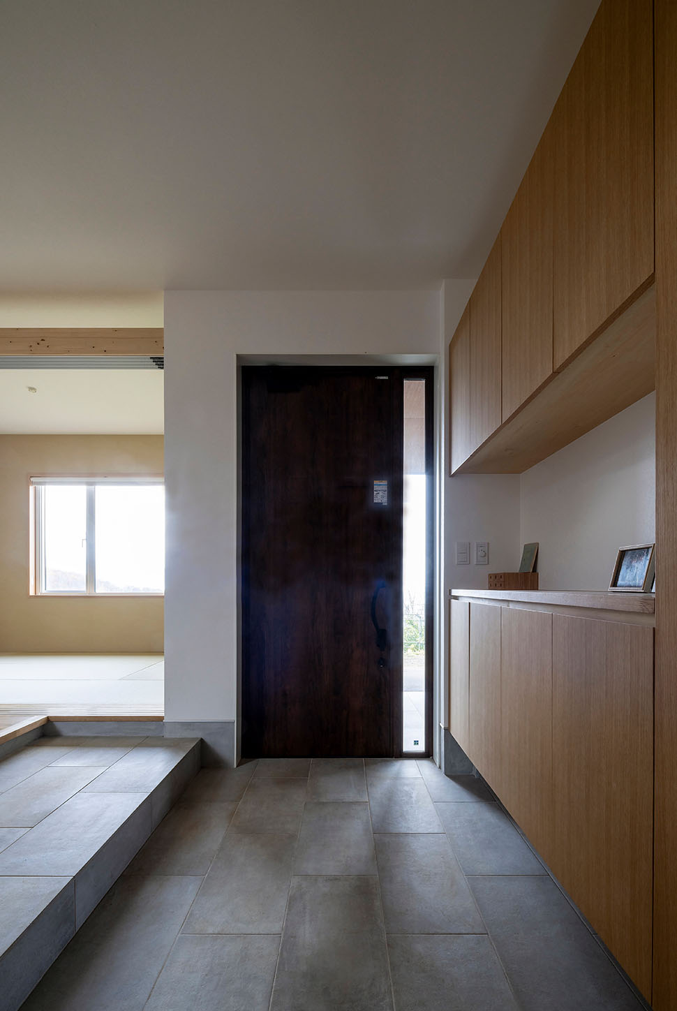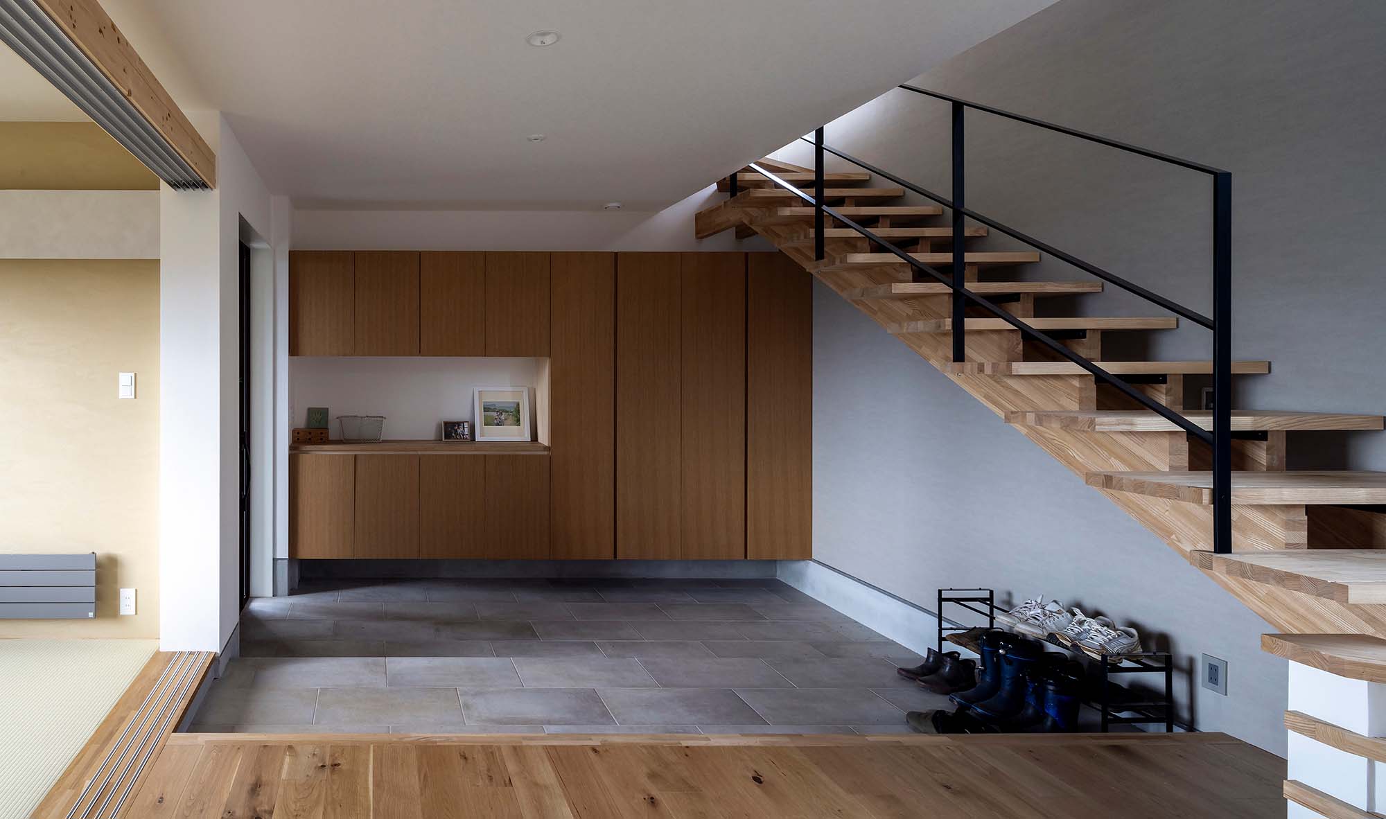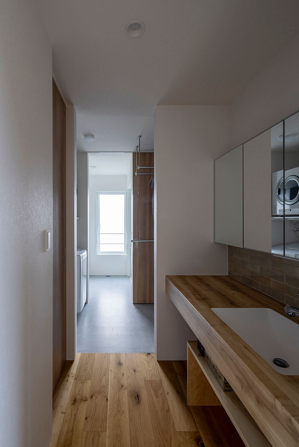 階段ホールとリビングの間に設置した暮らしの雑多なものを受け止める大容量の造作収納や、洗う・干すが完結できるスロップシンクを備えた広いランドリールーム、畑の様子をいつでも確認できるように位置を検討した窓計画など、農作業と家事を両立する多忙なNさんご一家の暮らしを新居がアシストしてくれます。