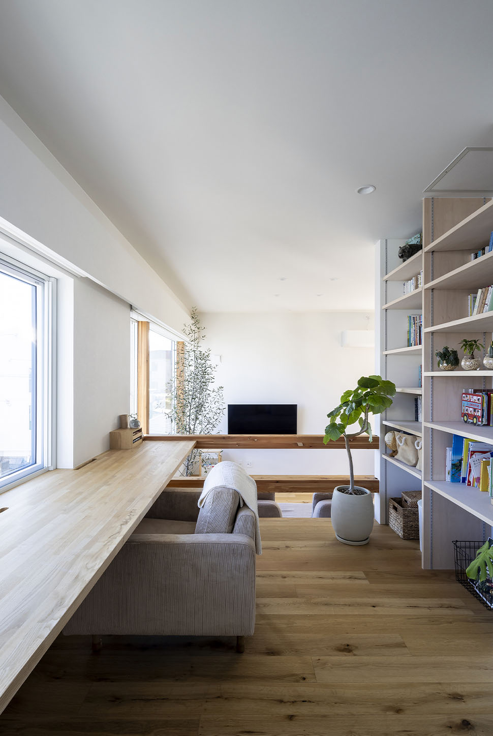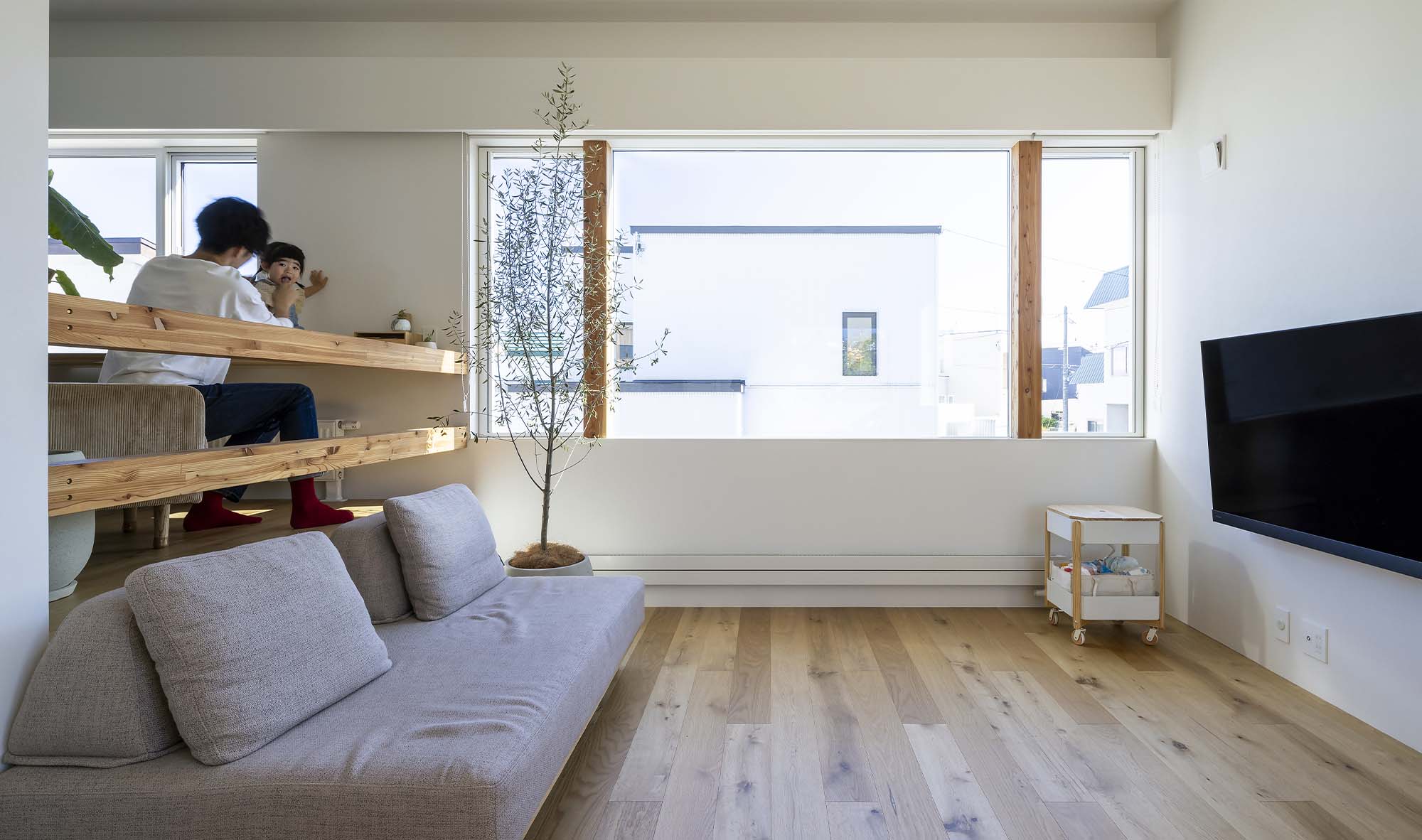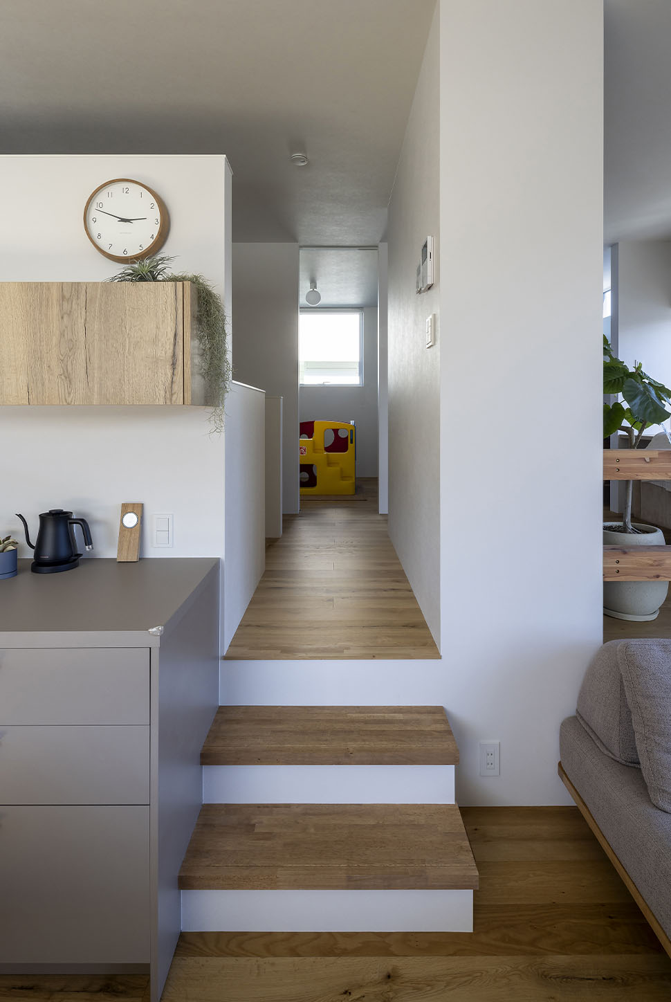 玄関土間とフロアをステップでつないだ室内は、1階に寝室や水まわりなどプライベートを集約し、見晴らしの良い2階にLDKを配置。当初、大きな吹き抜けが欲しいと希望していましたが、土地条件や必要な部屋数の確保を考えると実現が難しかったというMさんご夫妻。しかし検討を重ねる中で見えてきたのは「どうして吹き抜けが欲しいのかと考えたら、それは家族が集う場所が開放的でありたいと考えていたからでした」という心地よさの本質でした。