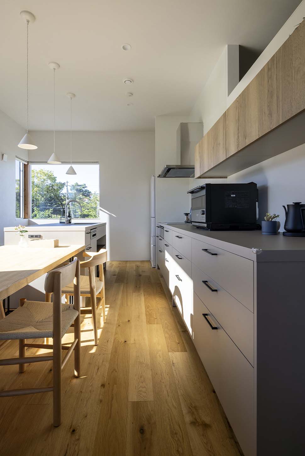 天井高を感じるダウンフロアのLDKはその最適解。窓の向こうに見える木々と相まって開放感を感じる空間は想像を超える心地よさがありました。床レベルの差は室内移動をリズミカルにし、「上がったり、下がったり、家で過ごす時間を娘ともどもめいっぱい楽しんでいます」とMさんご一家の暮らしをより豊かなものにしています。