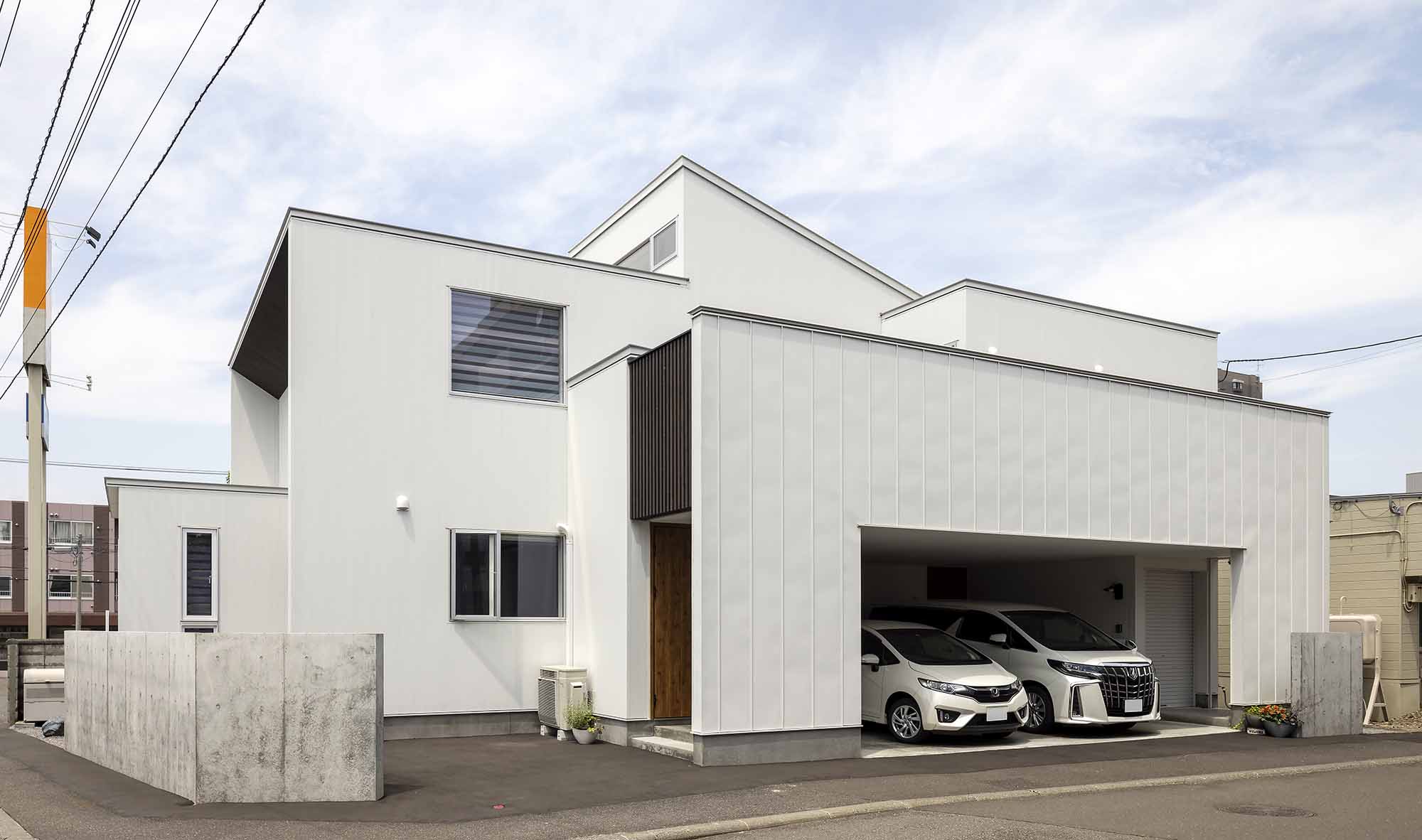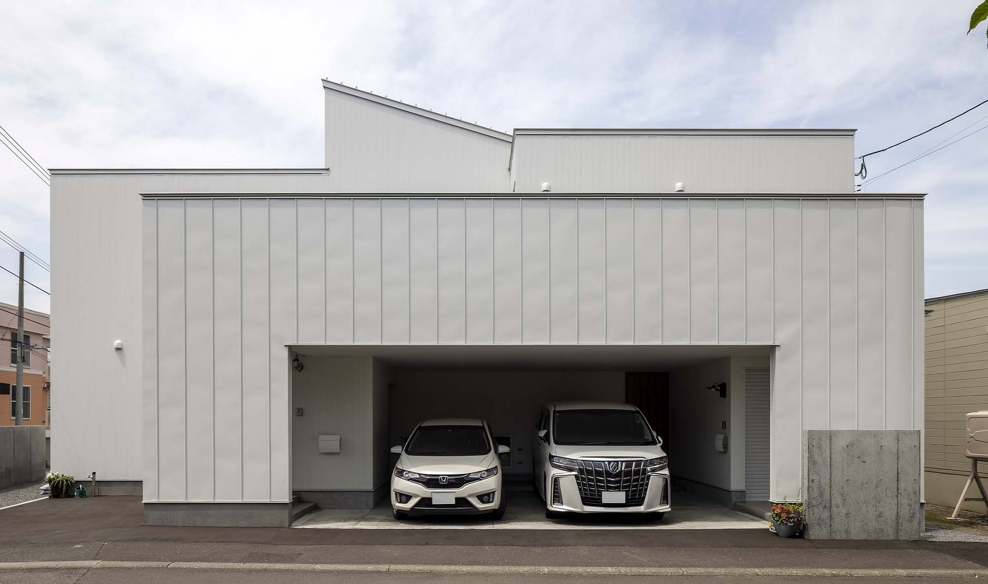 大きな吹き抜けのある親世帯は、1階にLDKや水まわり、仏間、寝室を集約した平屋的な暮らしが可能な住まい。玄関に趣味の生け花を飾る棚を設けるなど、暮らしを楽しむ工夫もなされています。2階廊下でつながる子世帯は、外からの視線を配慮し、旧居同様に2階をLDKに。吹き上げの天井とカーポートの上を活用したバルコニーが、視線を伸ばす開放的な空間です。
