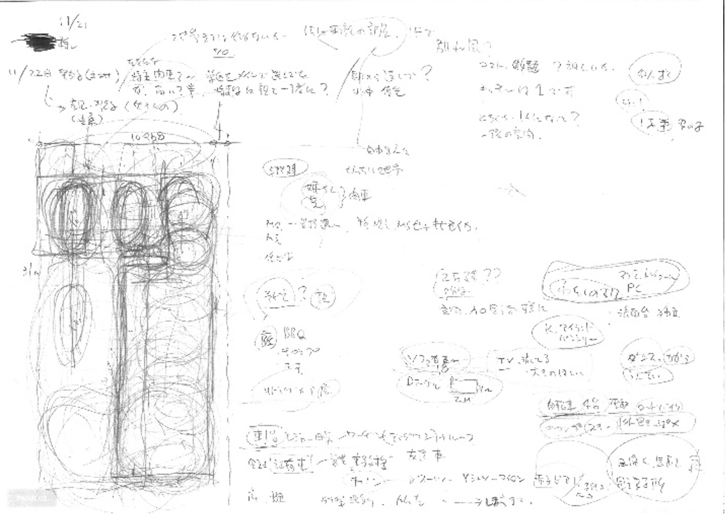次に、敷地の図面を見せていただき、間口が10.9メートルしかないのに、奥行が33メートルもあることにまたびっくり。これはもう「平屋」しかないな!と、要望のヒアリングをしている最中からゾーニングが浮かんできて、ご提案を進めていきました。
