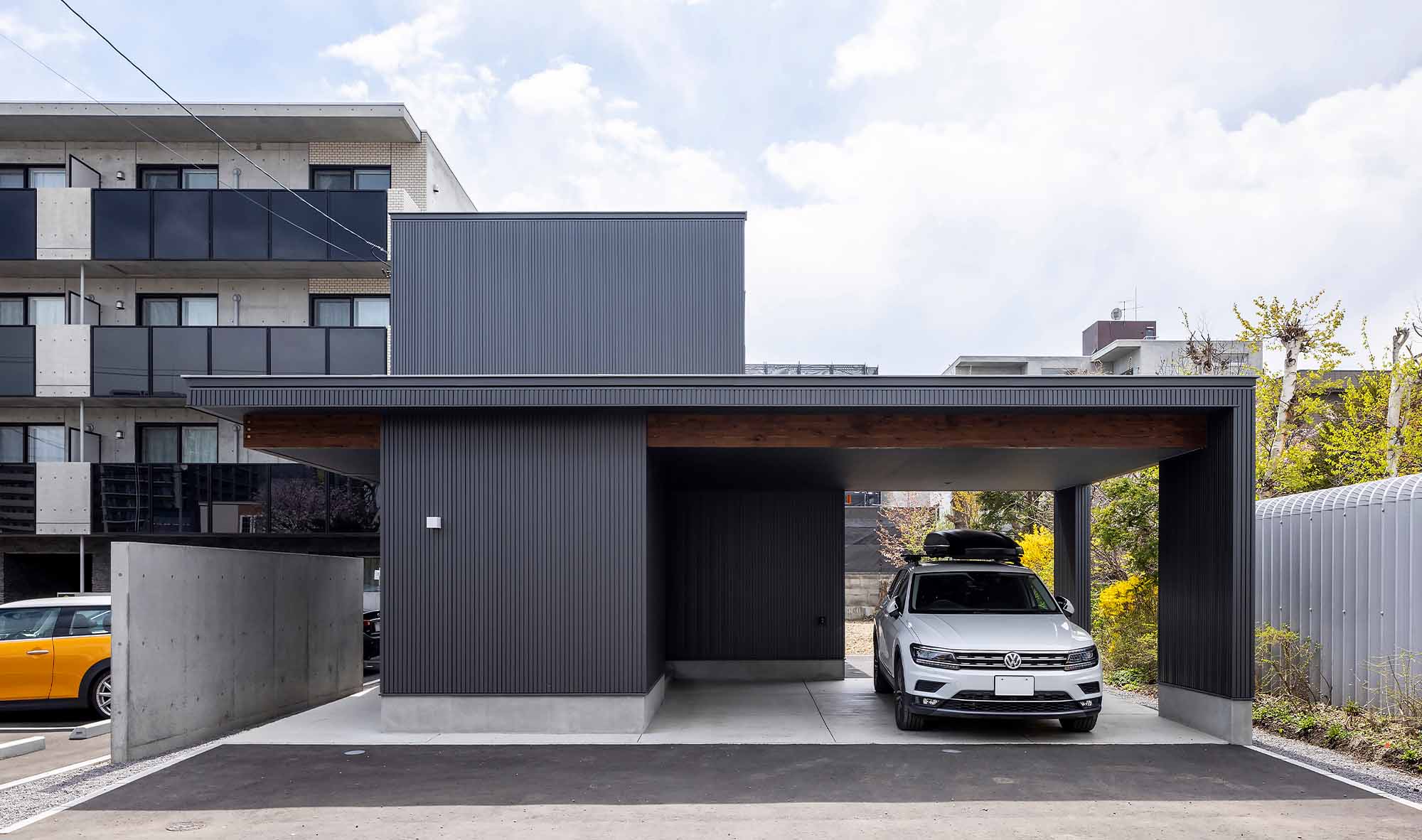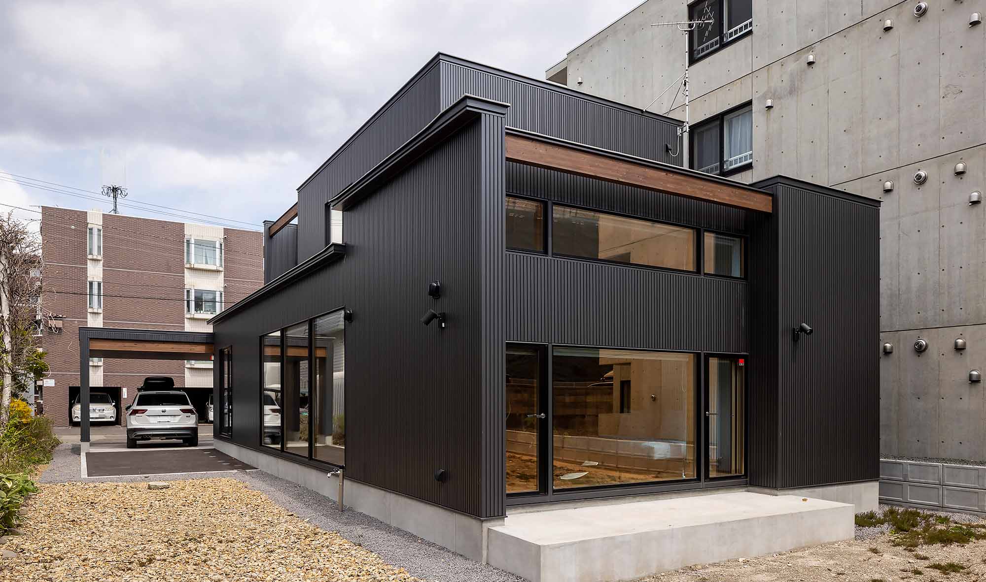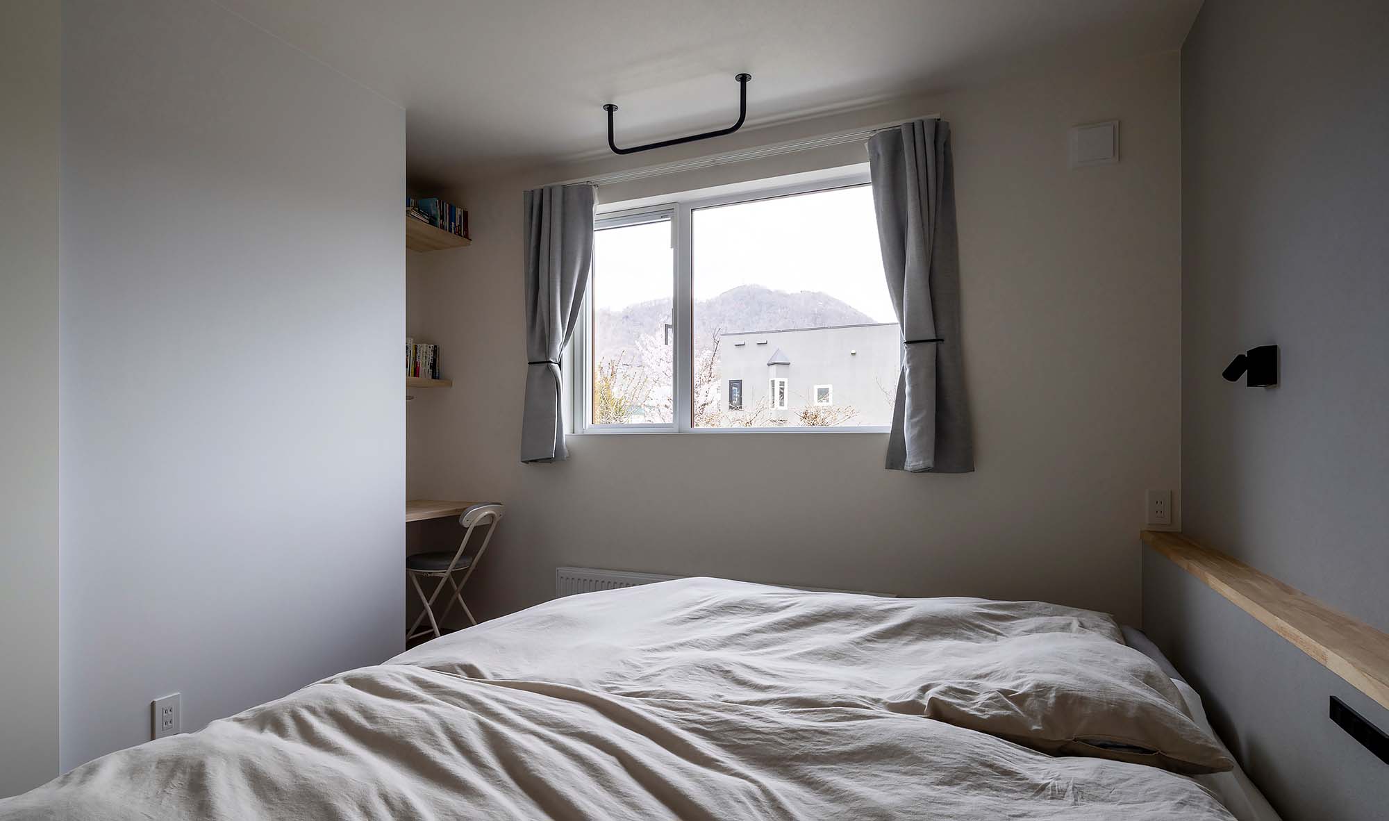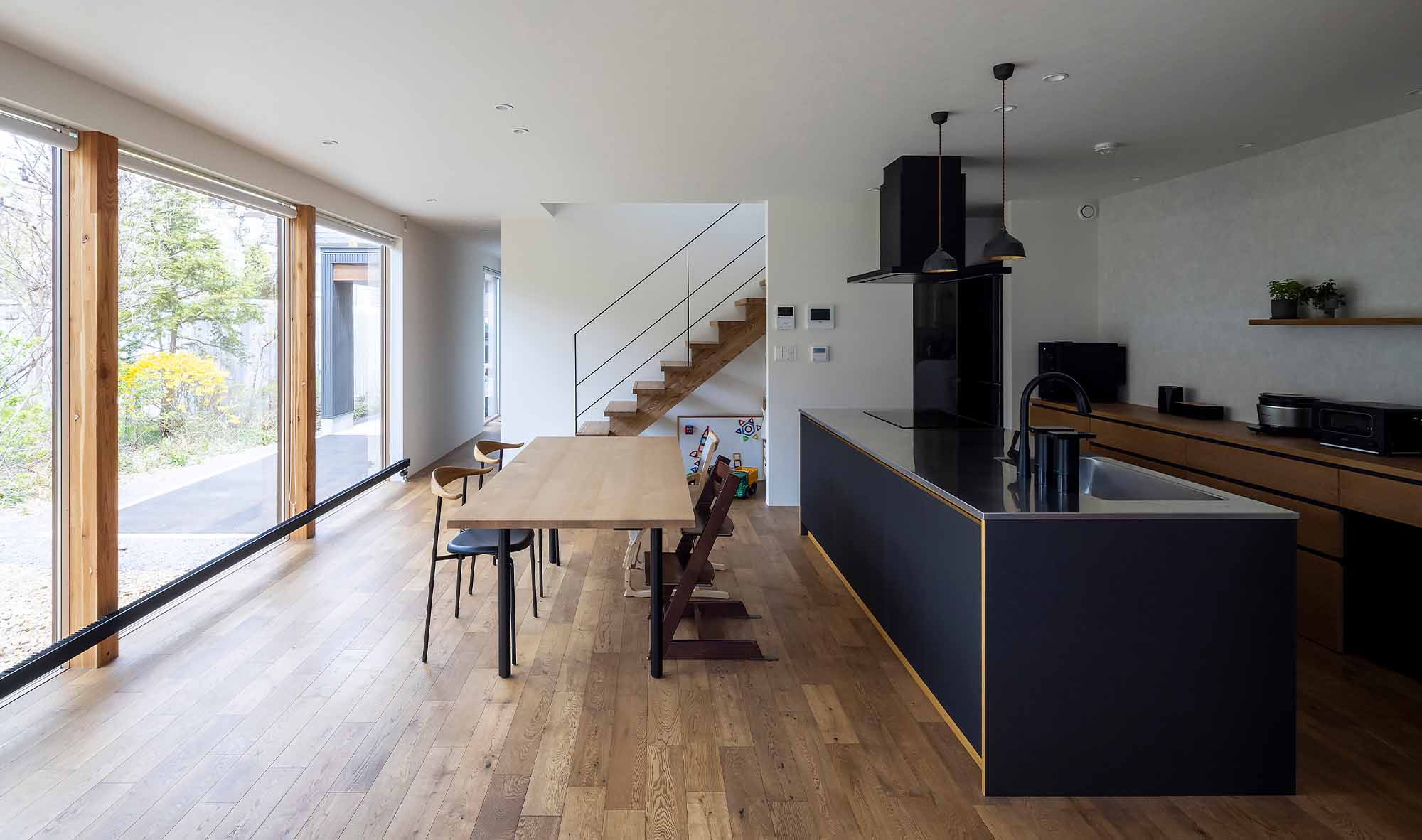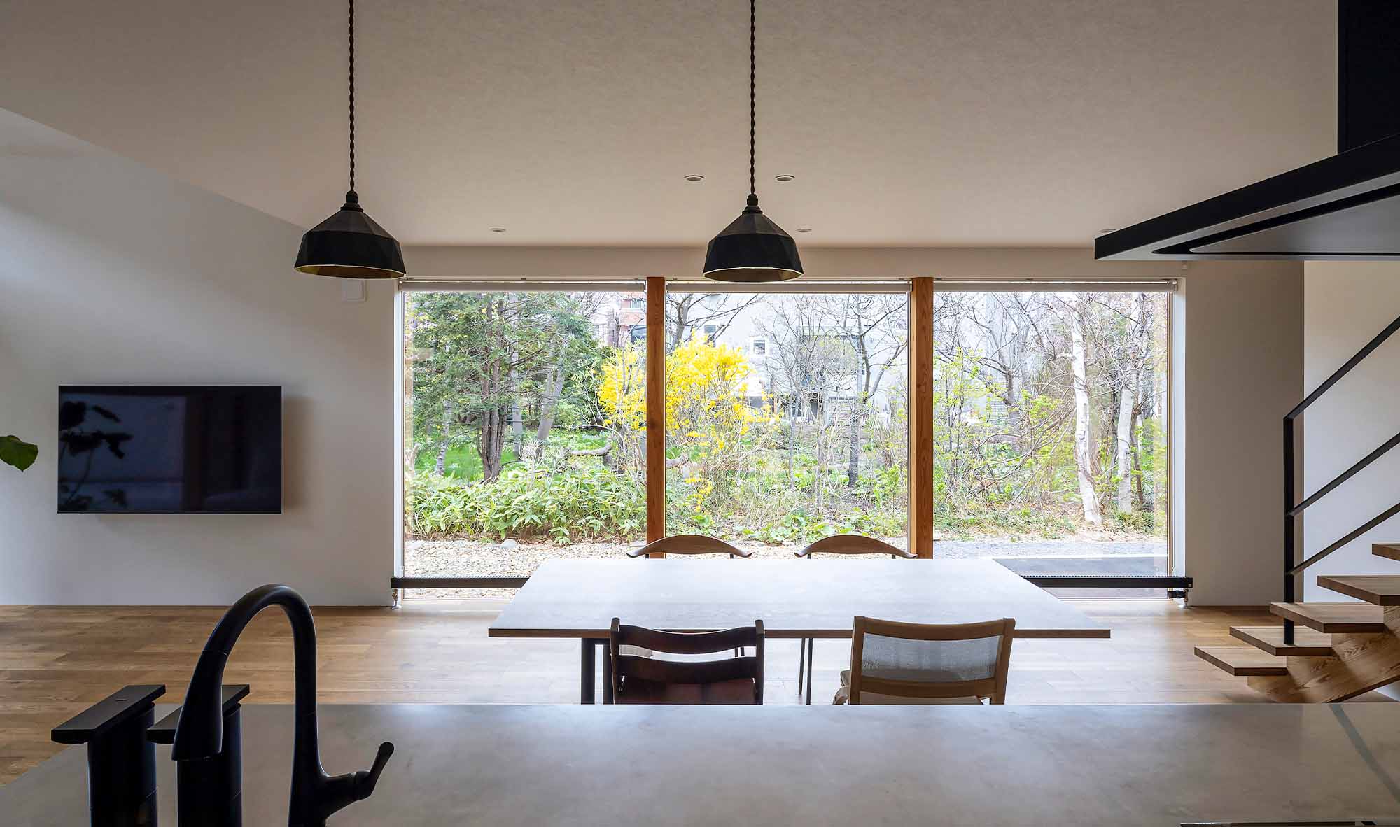 札幌市内の閑静な住宅街。ダイニングの大きな開口の先に映るのは、隣家が丹精を込めて育てている美しい庭です。「満開の桜も見える素晴らしい景色です」と、Mさんご一家が新居で初めて迎える春は想像以上に豊かなものでした。