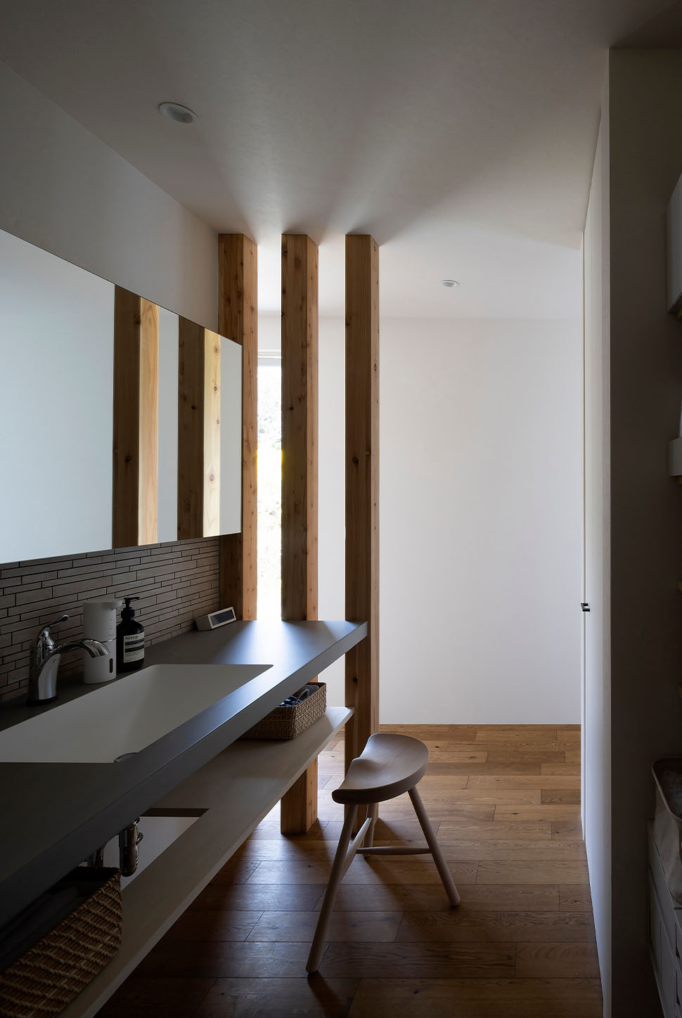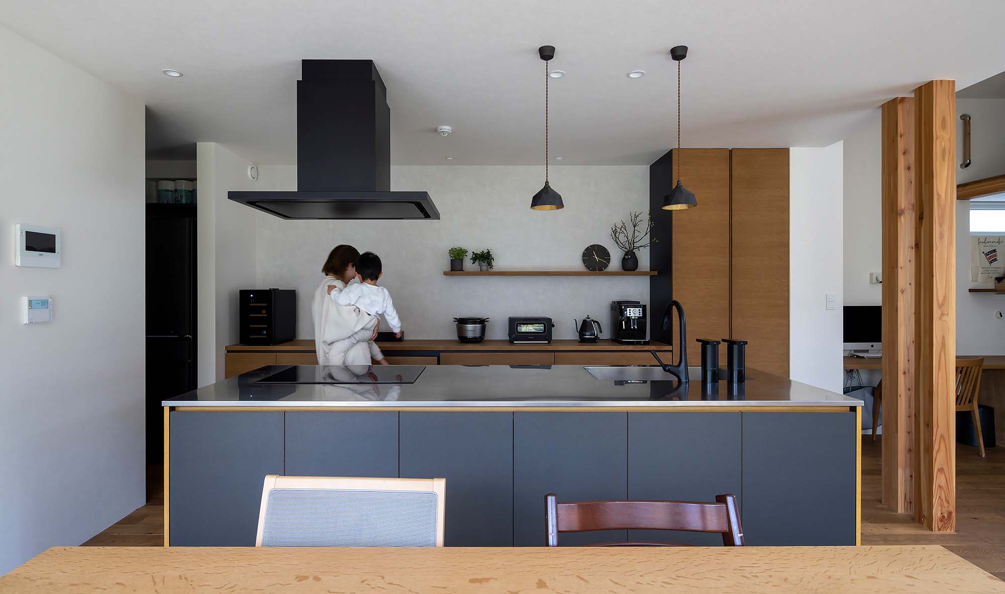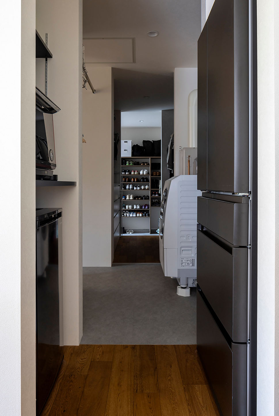 奥さんが最も重視したのが動線です。「帰宅時の手洗い、食事の支度、洗濯や収納をこなす効率の良い動きを実現できるようにイメージしました」と奥さん。キッチンを中心に多方向にアクセスできる8の字動線をベースに、奥さんの日々の習慣を考慮しながら整理しました。マンション暮らしは手狭ながらも1フロアで過ごせる便利さがあったということから、生活に欠かせない要素を1階に集約した平屋感覚のレイアウトも日々を一層快適にしています。