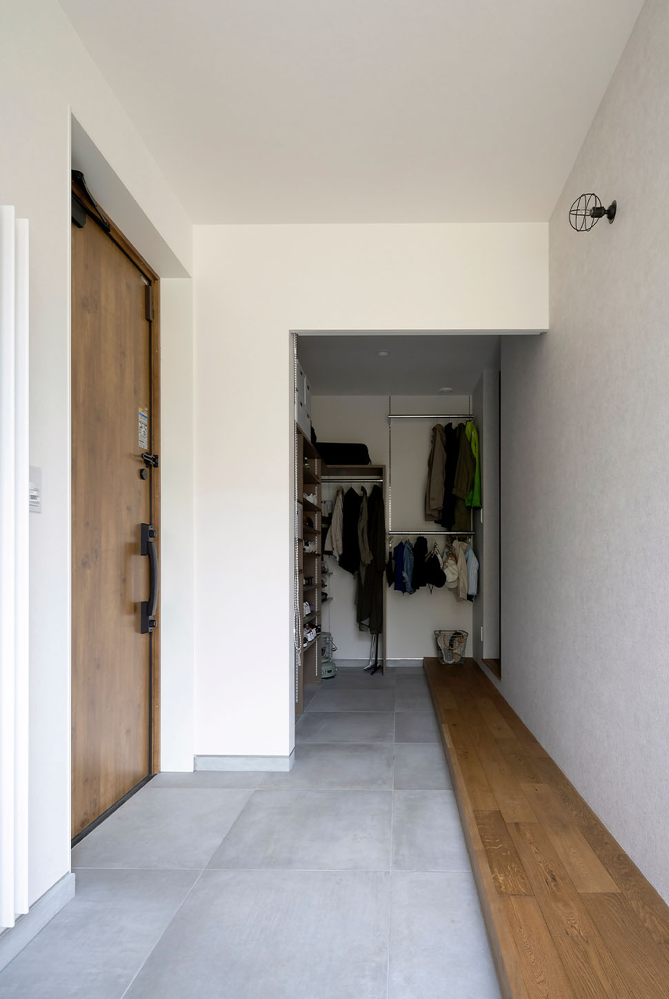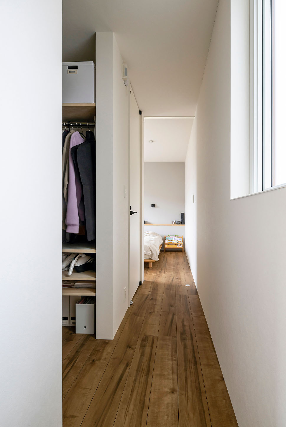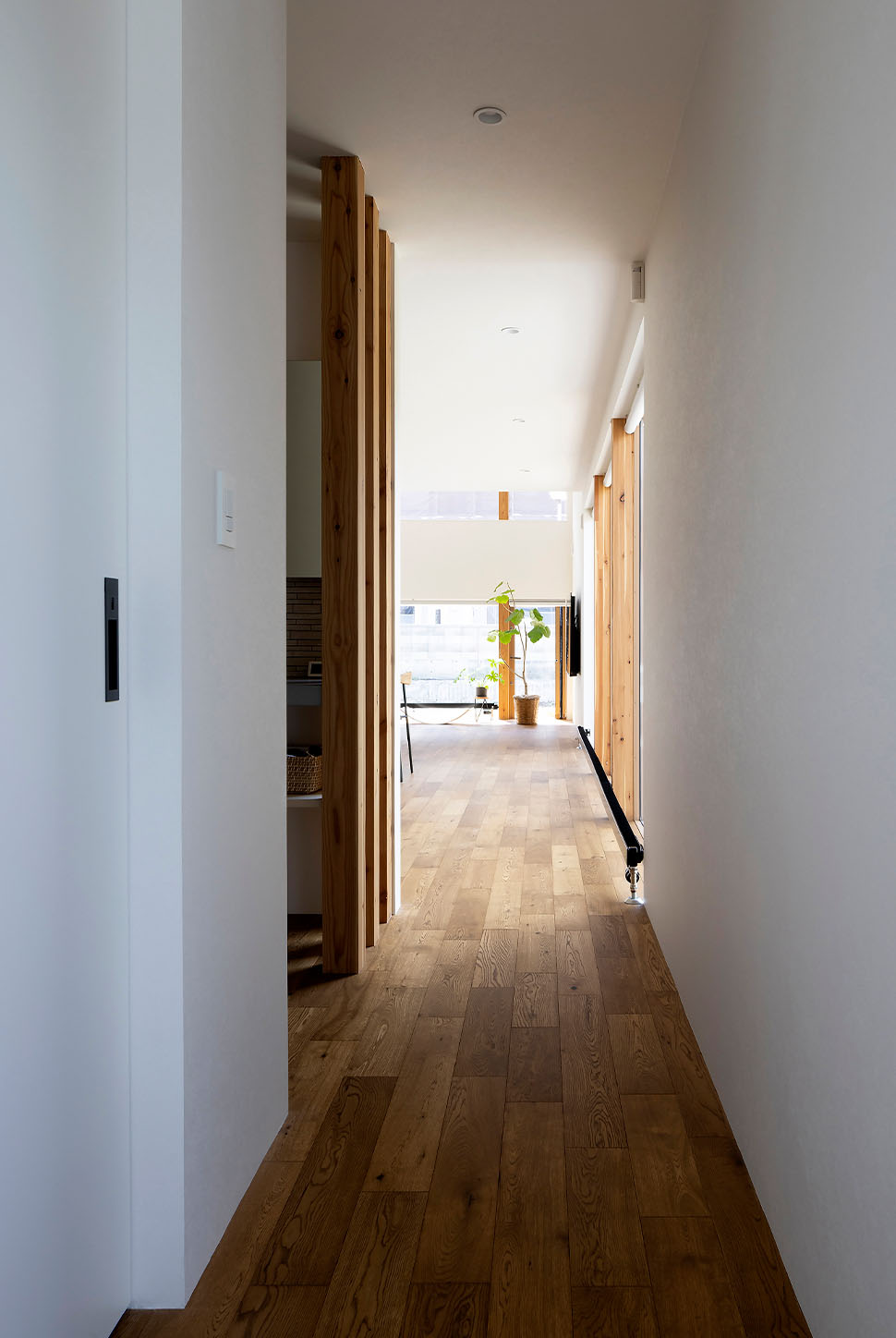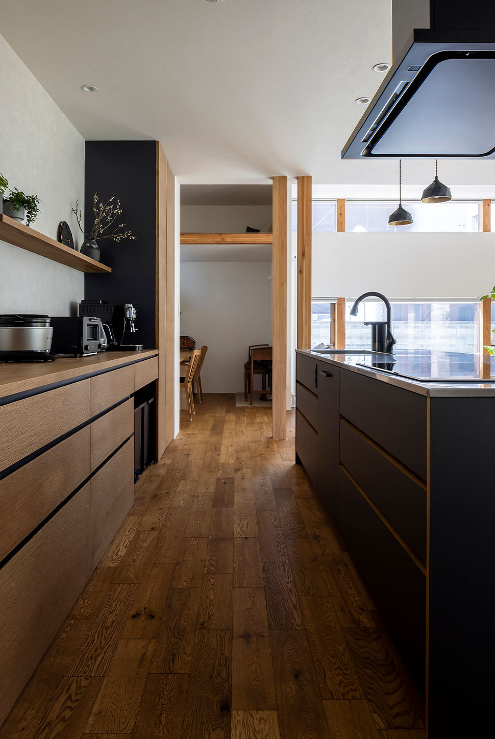 奥さんが最も重視したのが動線です。「帰宅時の手洗い、食事の支度、洗濯や収納をこなす効率の良い動きを実現できるようにイメージしました」と奥さん。キッチンを中心に多方向にアクセスできる8の字動線をベースに、奥さんの日々の習慣を考慮しながら整理しました。マンション暮らしは手狭ながらも1フロアで過ごせる便利さがあったということから、生活に欠かせない要素を1階に集約した平屋感覚のレイアウトも日々を一層快適にしています。