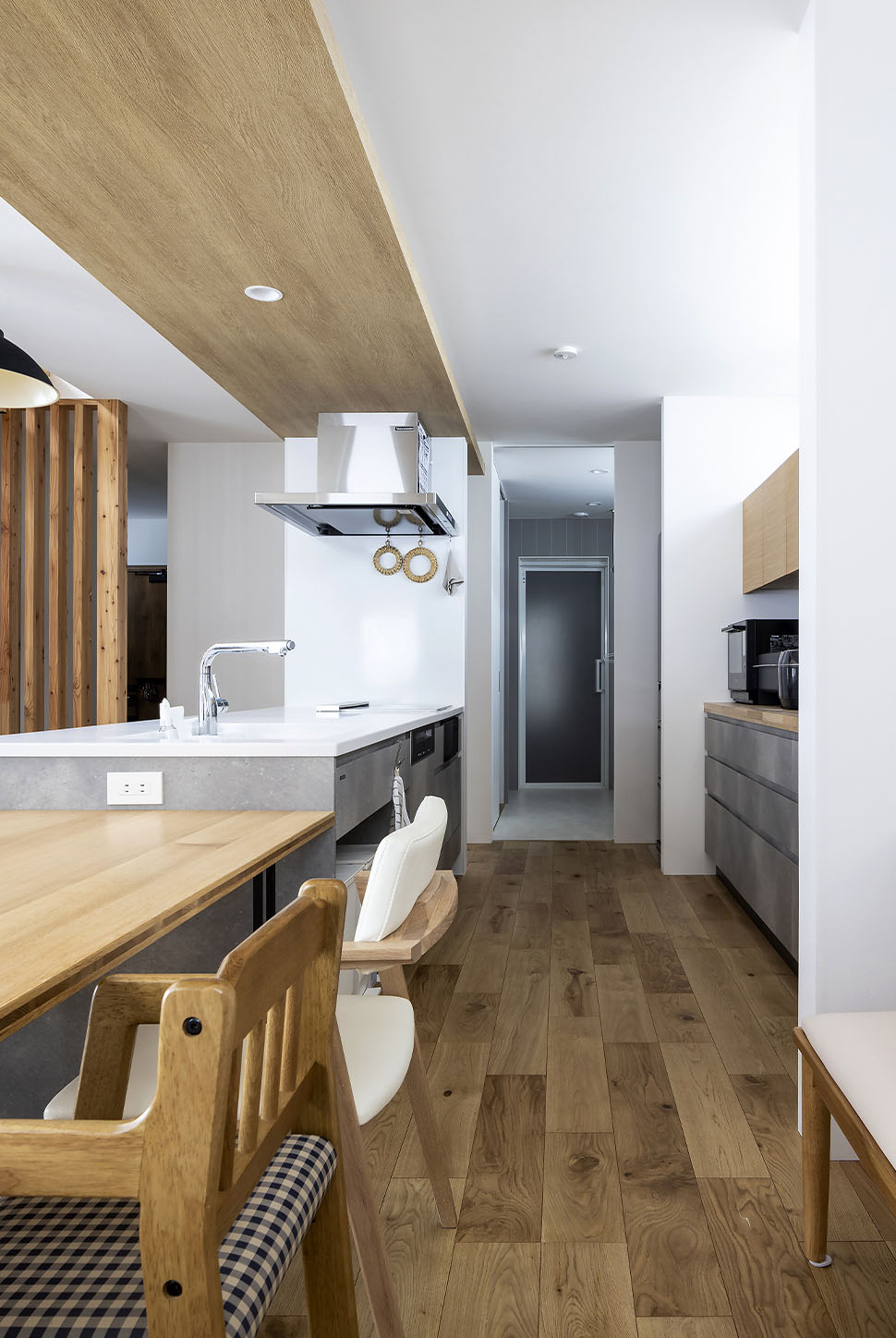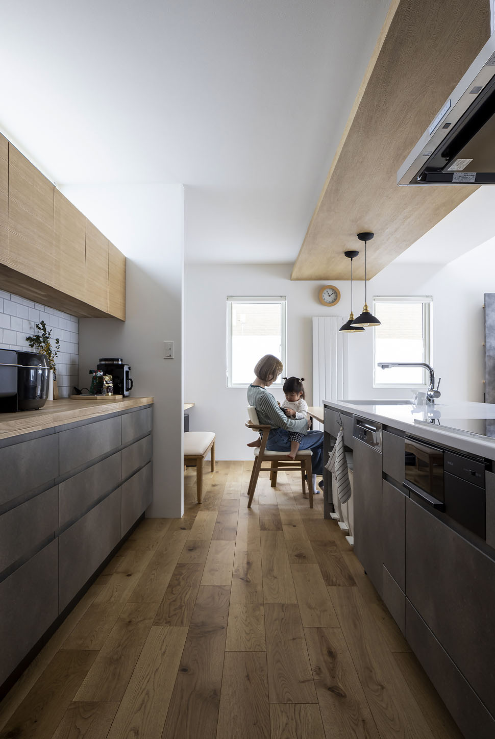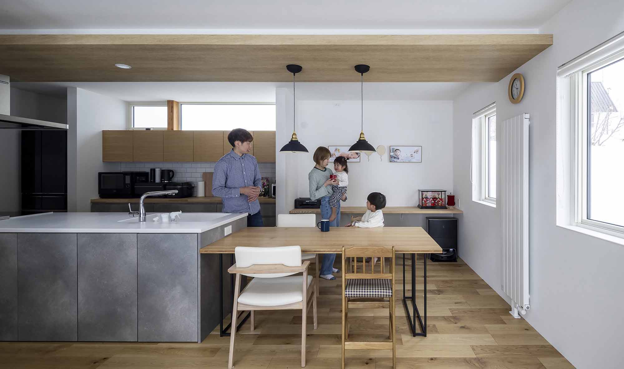 完成した新居は色数を抑えたシンプルな美しさと、日々の暮らしが簡潔になる機能性が同居した効率の良い家。玄関ホールからファミリークローゼット、ユーティリティ、キッチンとつながる回遊式の間取りなど、使い勝手の良さが忙しい日常を優しくアシストしてくれます。「子どもたちが日々伸びやかに家の中を駆け回り、広々としているけれど、日々の動作は簡潔で、私自身も家事の効率が上がりました」と、笑顔で話す奥さんでした。