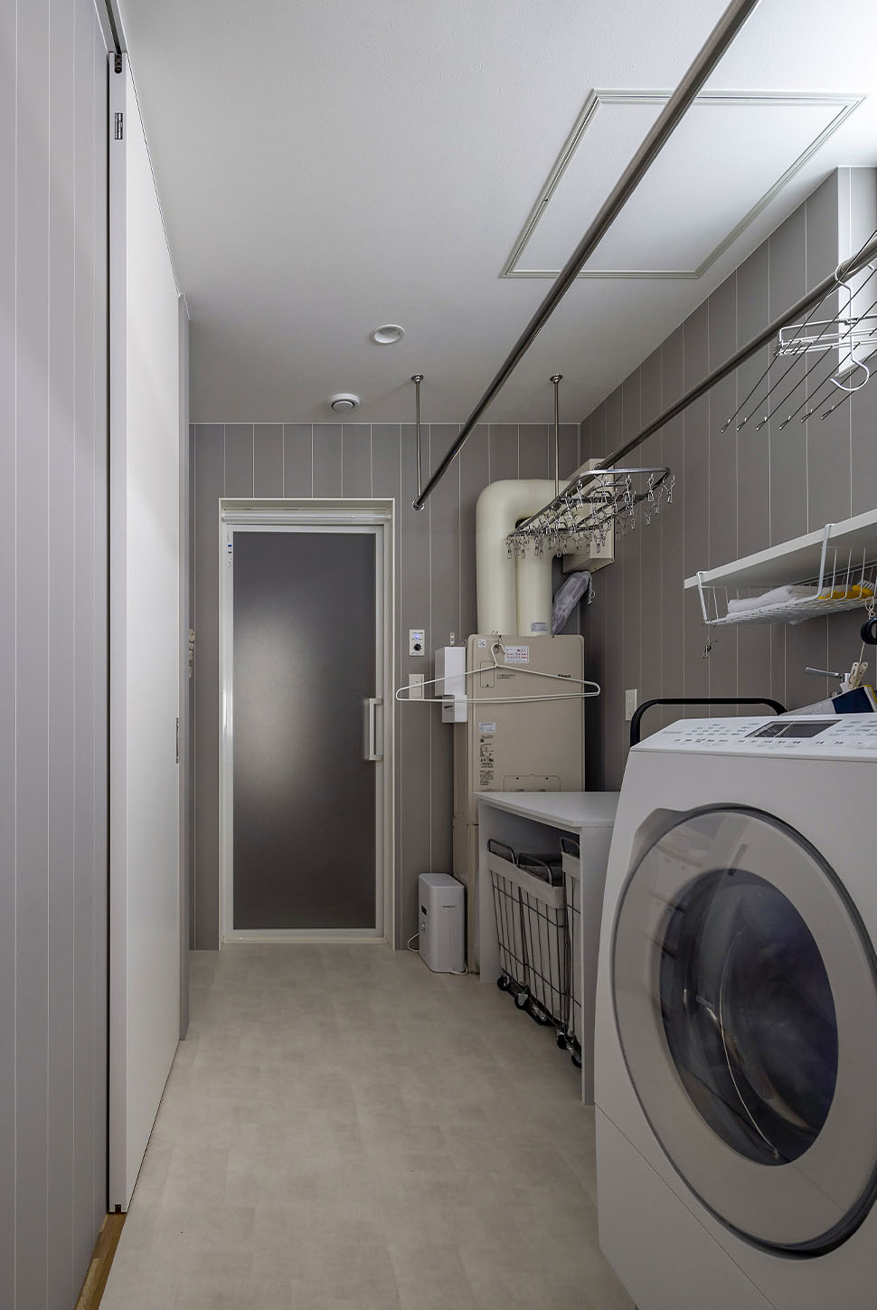 家づくりの中で印象に残っているのは、洗面台の配置を悩んだ際のミライエホームからの「歯磨きはずっと鏡を見ながらしていますか?」という問いかけ。「水回りをまとめると、入浴時に洗面台が使いずらく非効率。玄関とユーティリティの二ヵ所に洗面台を設けようかと悩んでいたところ、ミライエホームからそう言われてハッとしました」とKさん。テレビを見たり、後片付けをしたり、常に何かをしながら歯を磨いていた習慣に気づき、洗面台は玄関ホールのみに。その分ユーティリティに広さを確保しました。
