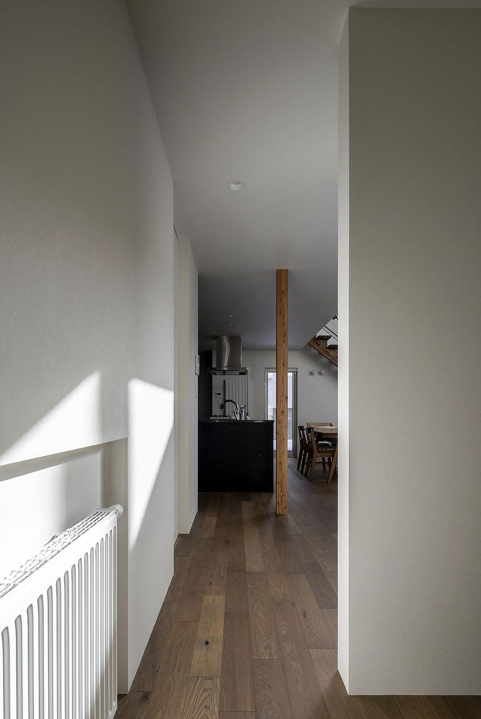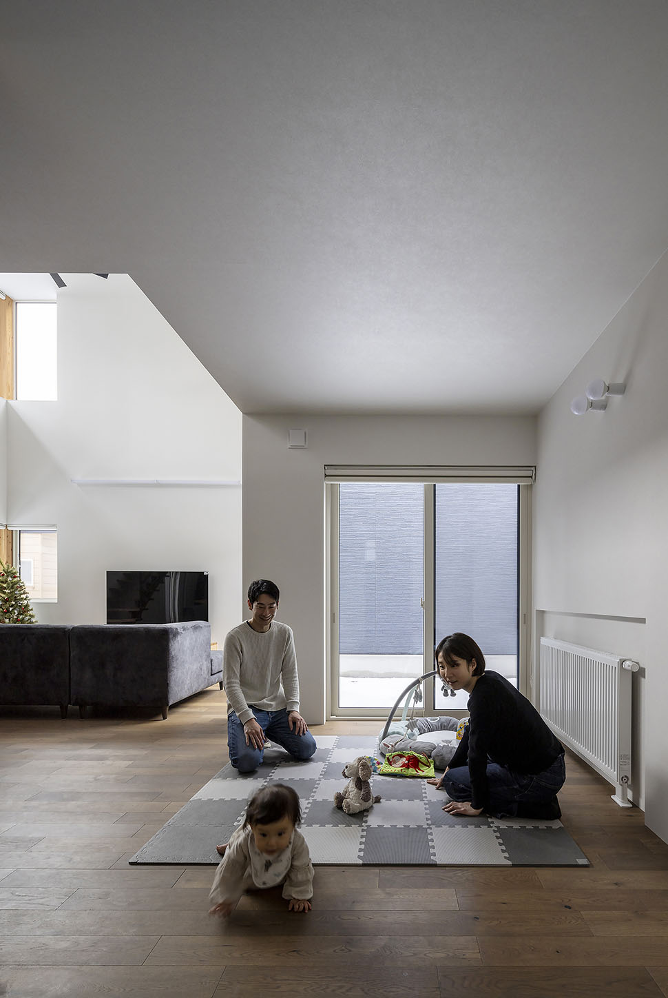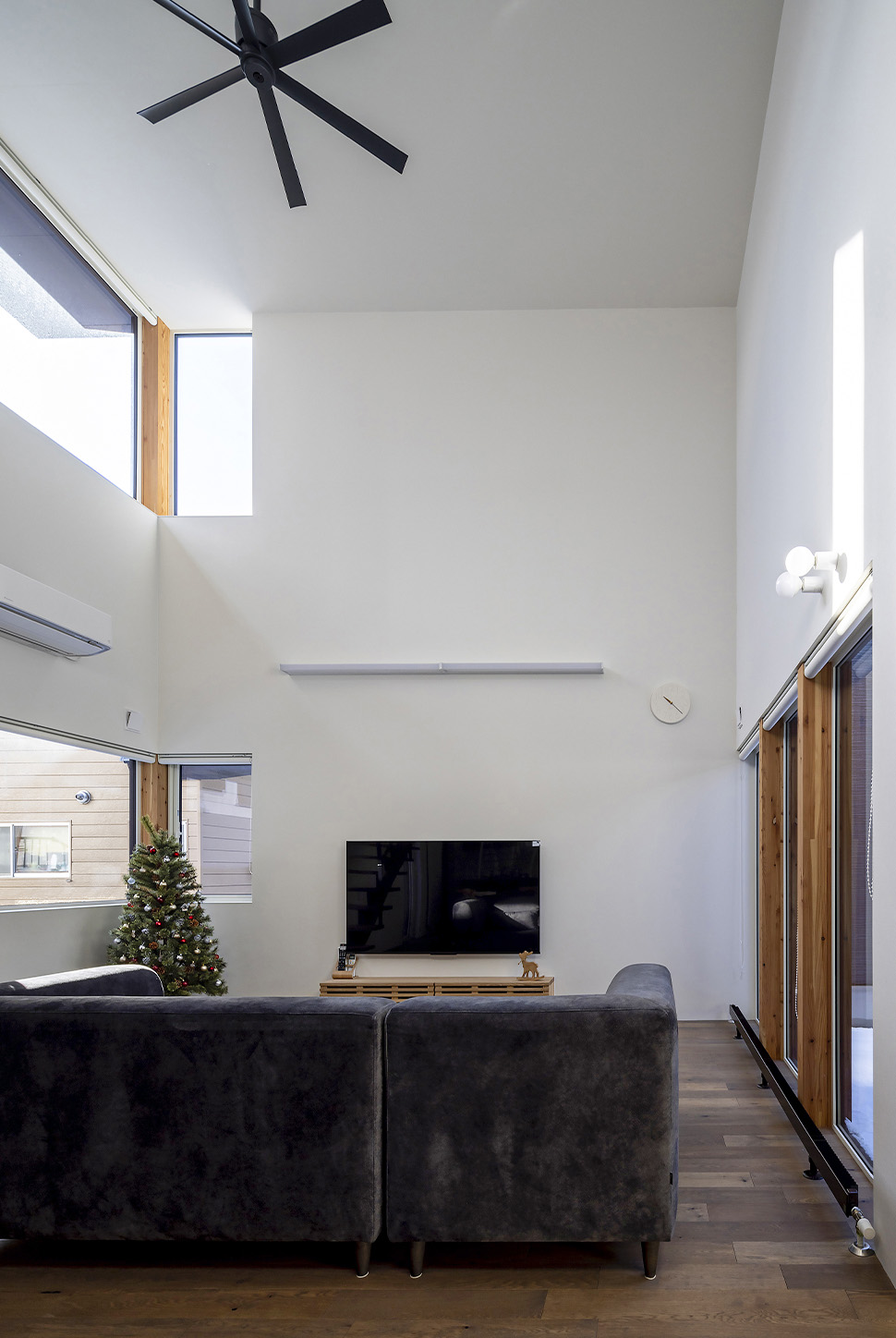 完成した新居は、2階は子ども用のフリースペースと寝室のみにとどめ、吹き抜けにたっぷりボリュームを割いた住まい。隣接する住宅が気にならない高い位置に設けた南東のFIX窓から取り込んだ光を、吹き抜けを介して1階のLDKへと届けるプランです。