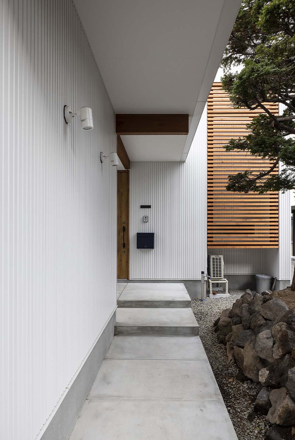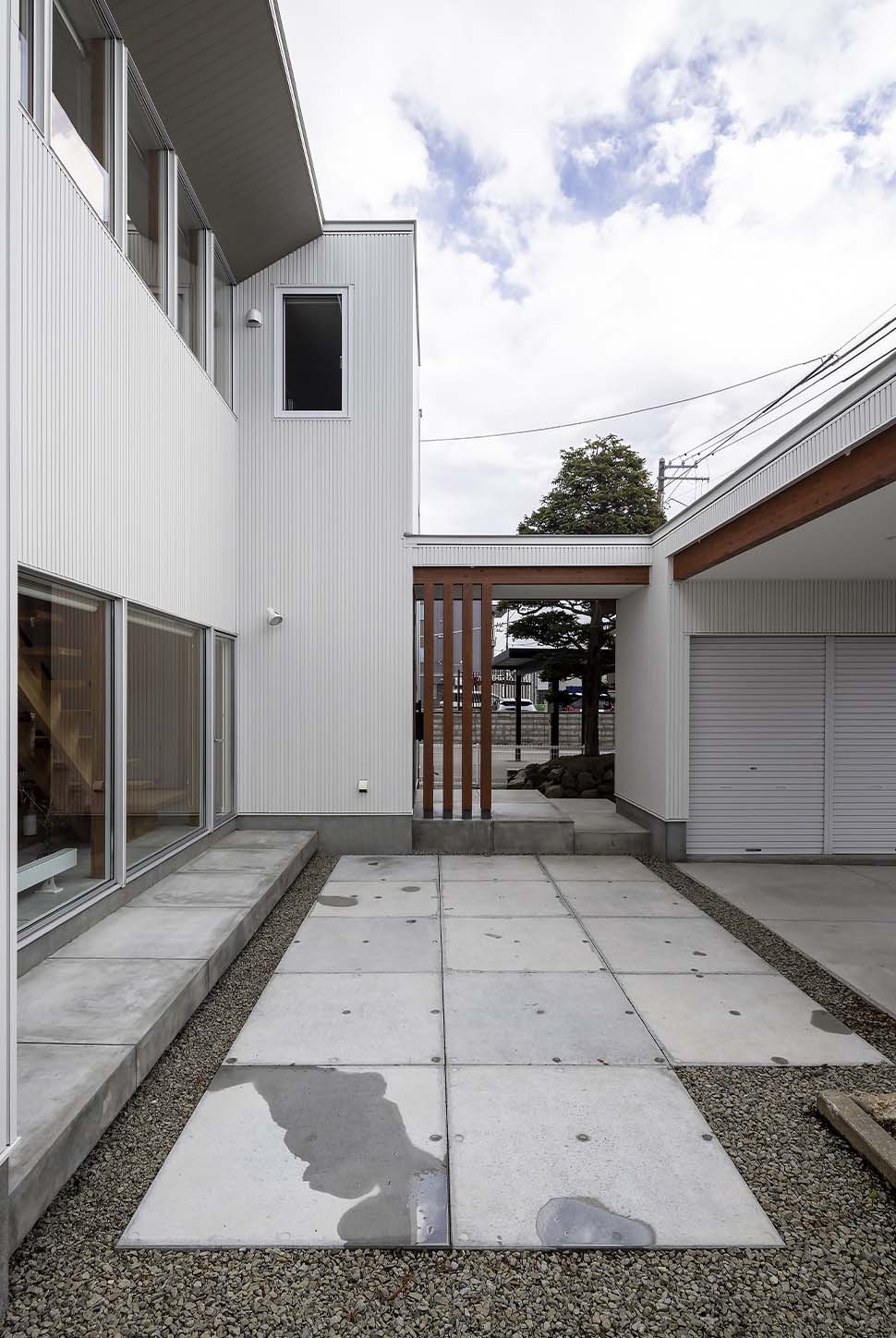 庭先には以前のサンルーム的要素を担う、コンクリートテラスを設置。内と外の行き来を自由に促す土間を設けて、より快適にBBQが楽しめるよう整えています。また、往来の視線を避けるためにカーポートを設置して、車の出し入れで目隠しできるように配慮もなされています。旧居で大切にしていた暮らしの習慣や楽しみが、よりブラッシュアップされた住まいとなりました。