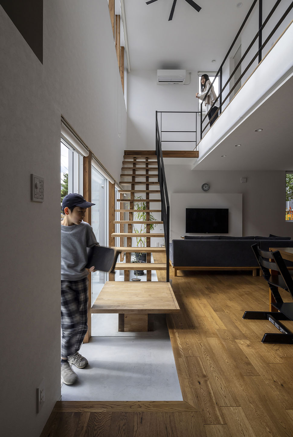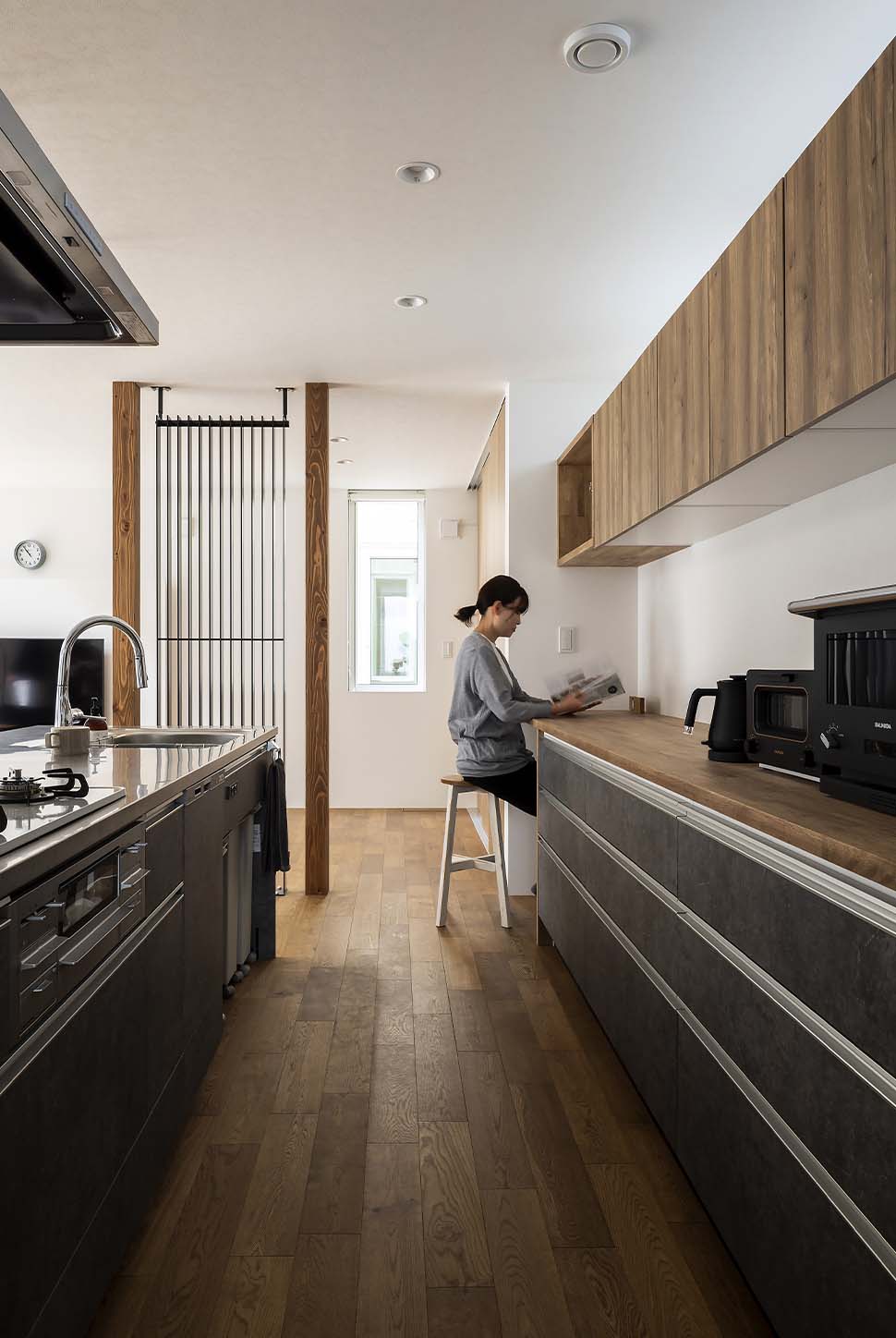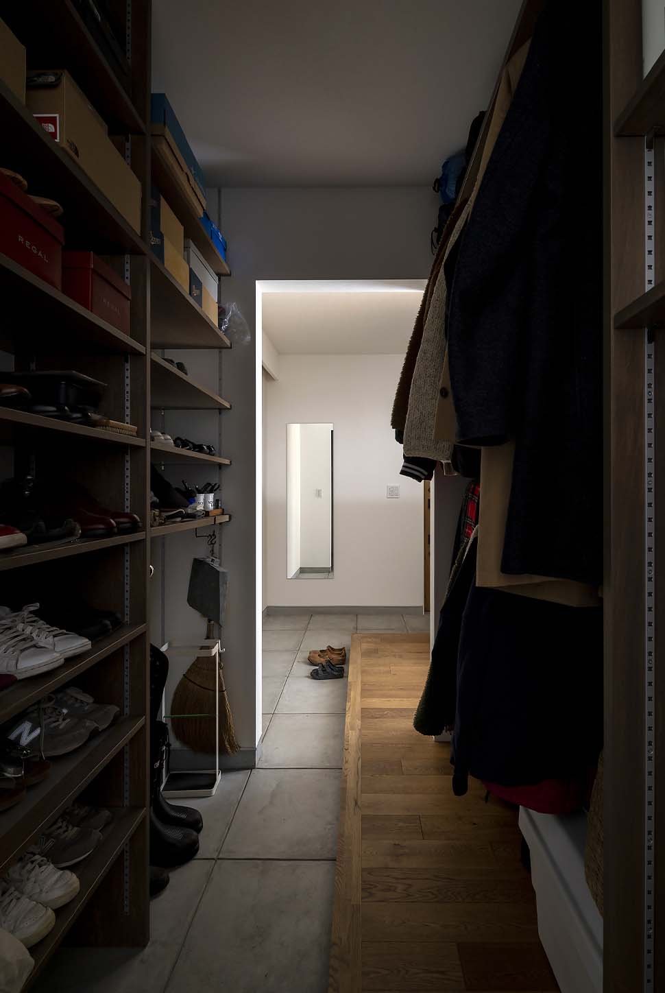 新たな住まいは、こうした旧居の暮らしやすさや家族の習慣を内包しながら、これまで以上に快適に刷新。庭に面した南向きの窓際に土間をつくることで、内と外の行き来をスムーズに。土間とフラットにつながる庭のコンクリートテラスは、BBQ道具を置くなどかつてのサンルームの役割を果たしています。仕切りのない開放的なLDKの一角に、大容量の収納を設けたスペースを配置。旧居のリビング横の部屋が担っていたものを整然と受け止める場所になっています。「洗練されたデザインの中に、私たち家族の暮らしやすさが詰まっています」と笑顔で話す奥さんでした。