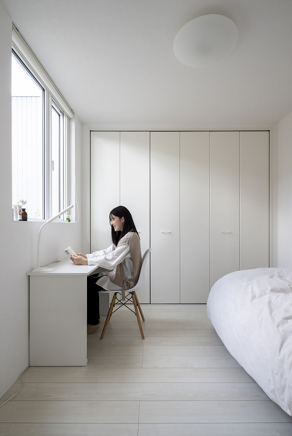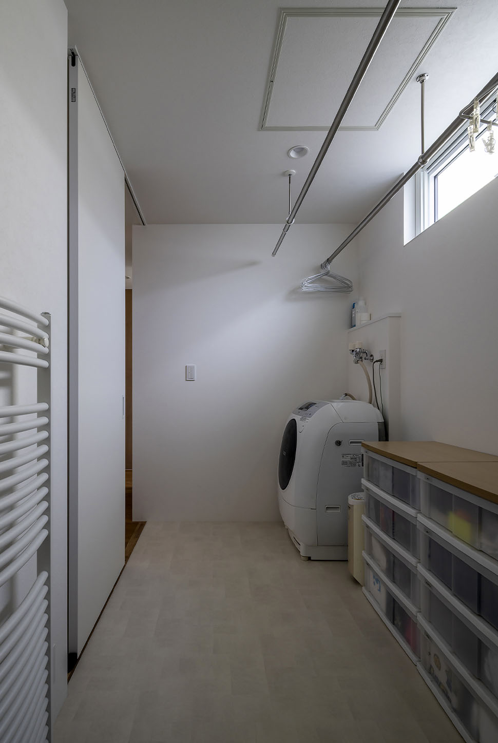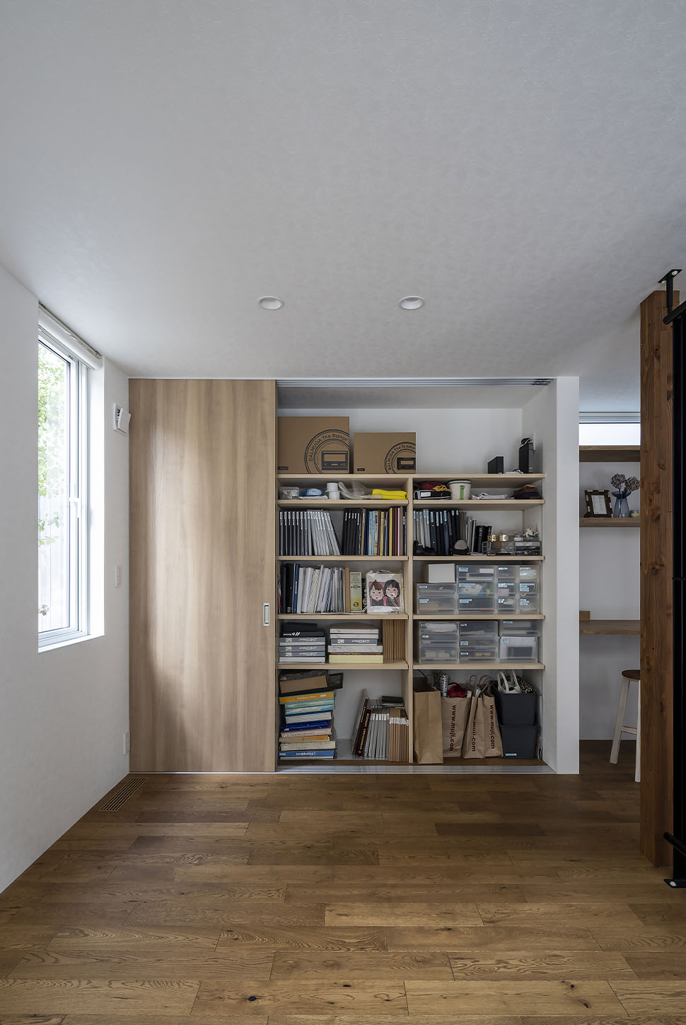 リビング横には、旧居時代にさまざまな用途を担っていた暮らしの諸々を受け止める余力のある領域として、仕切りのない居室を設置。大容量の収納を設置して、日常生活に必要な雑多なものを集約しています。この空間は、整理整頓が得意な奥さんの収納技術がうまく生かされていて、ラベリングや仕分けによりご自身の手でより一層使いやすさを叶えています。