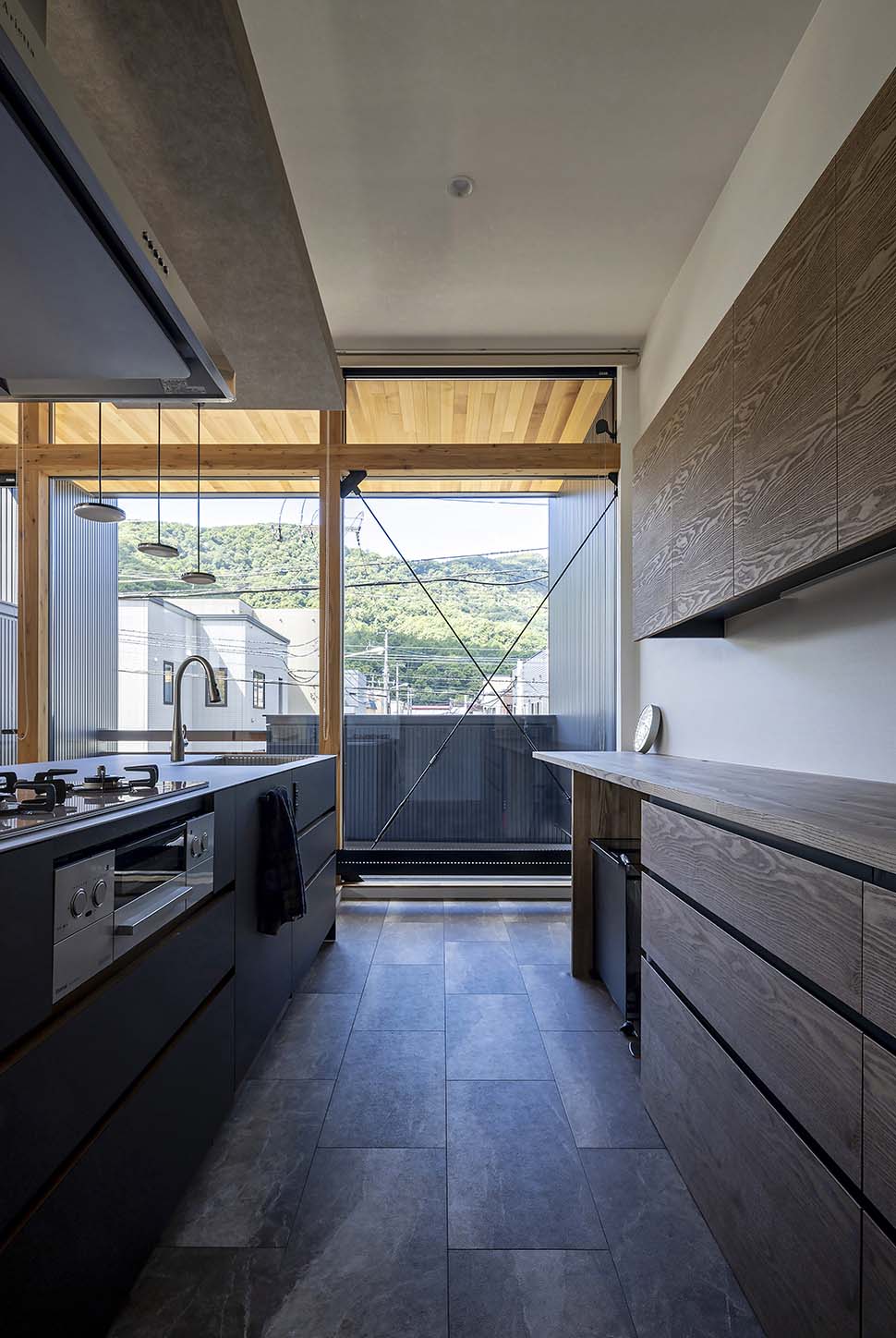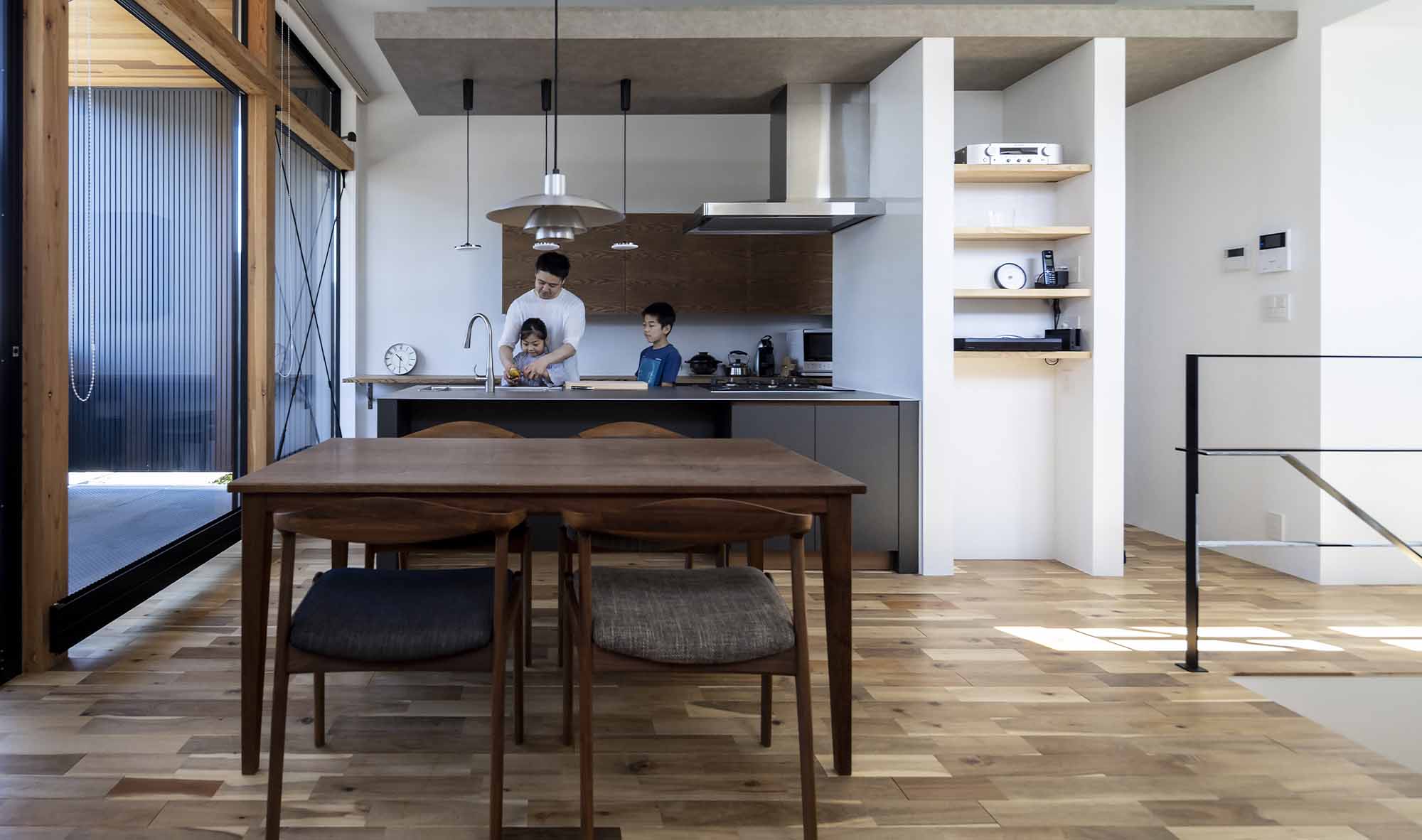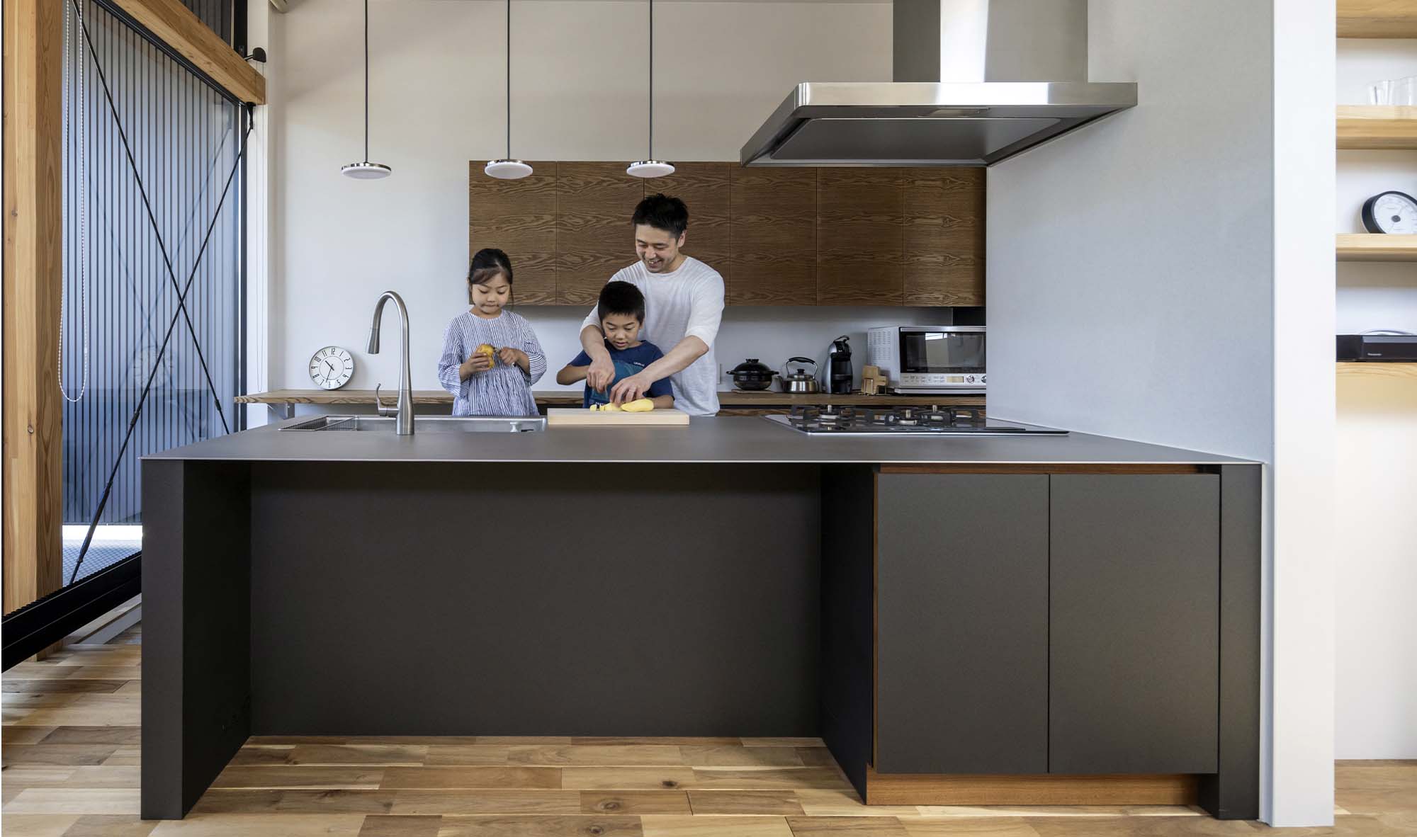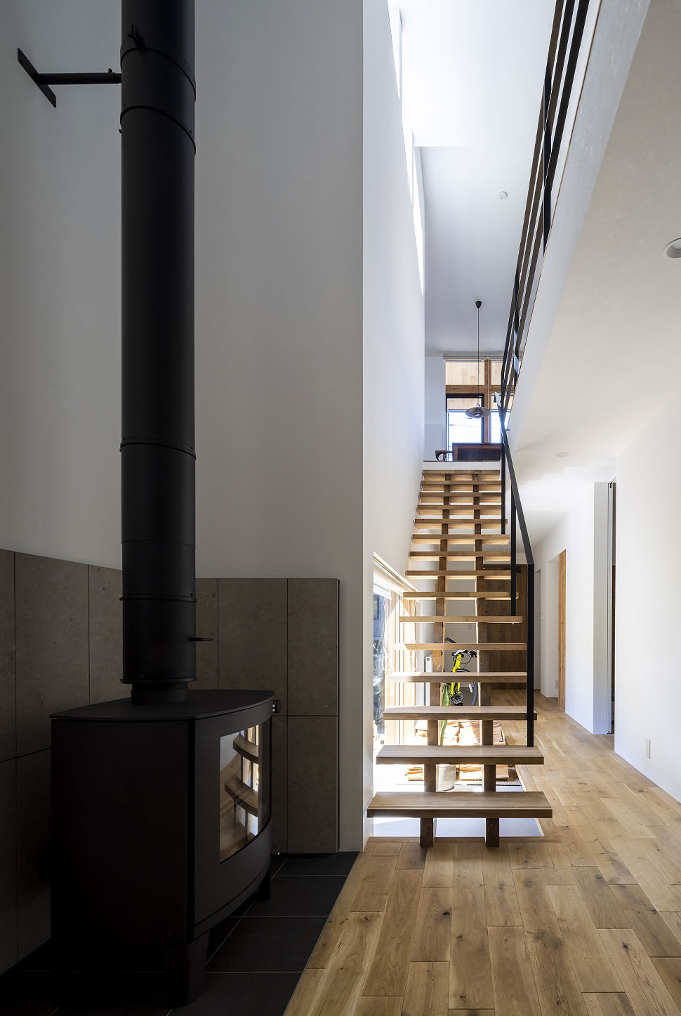 山を望む土地のポテンシャルを生かし、LDKやテラス、家事室など暮らしの中心は見晴らしの良い2階に集約。シェフであるIさんにとって特別な場所であるキッチンは、ダイニングとの距離感や、目線の高さを考えて繊細に調整し、床レベルを7㎝下げています。住宅地の喧騒を忘れて山を望む2階のLDKや、薪ストーブの炎を眺めて心穏やかに過ごす1階。Iさんご一家の新たな住まいは、そこかしこに自然と家族が集う豊かな空間が配されています。