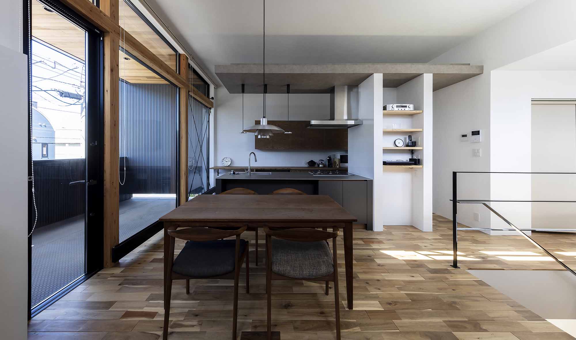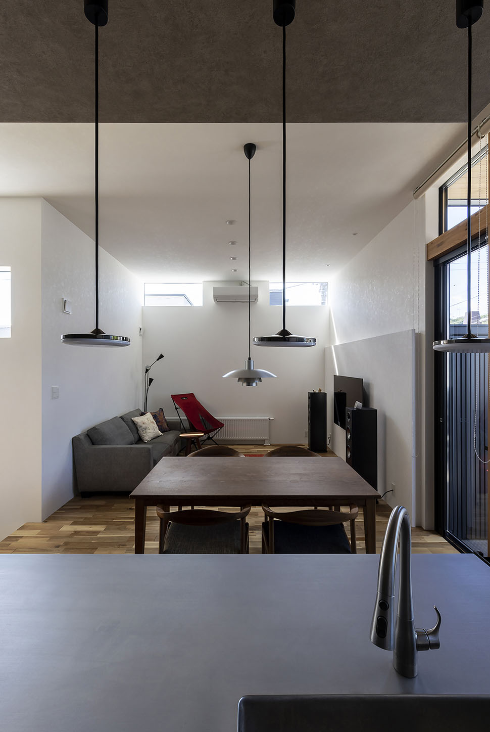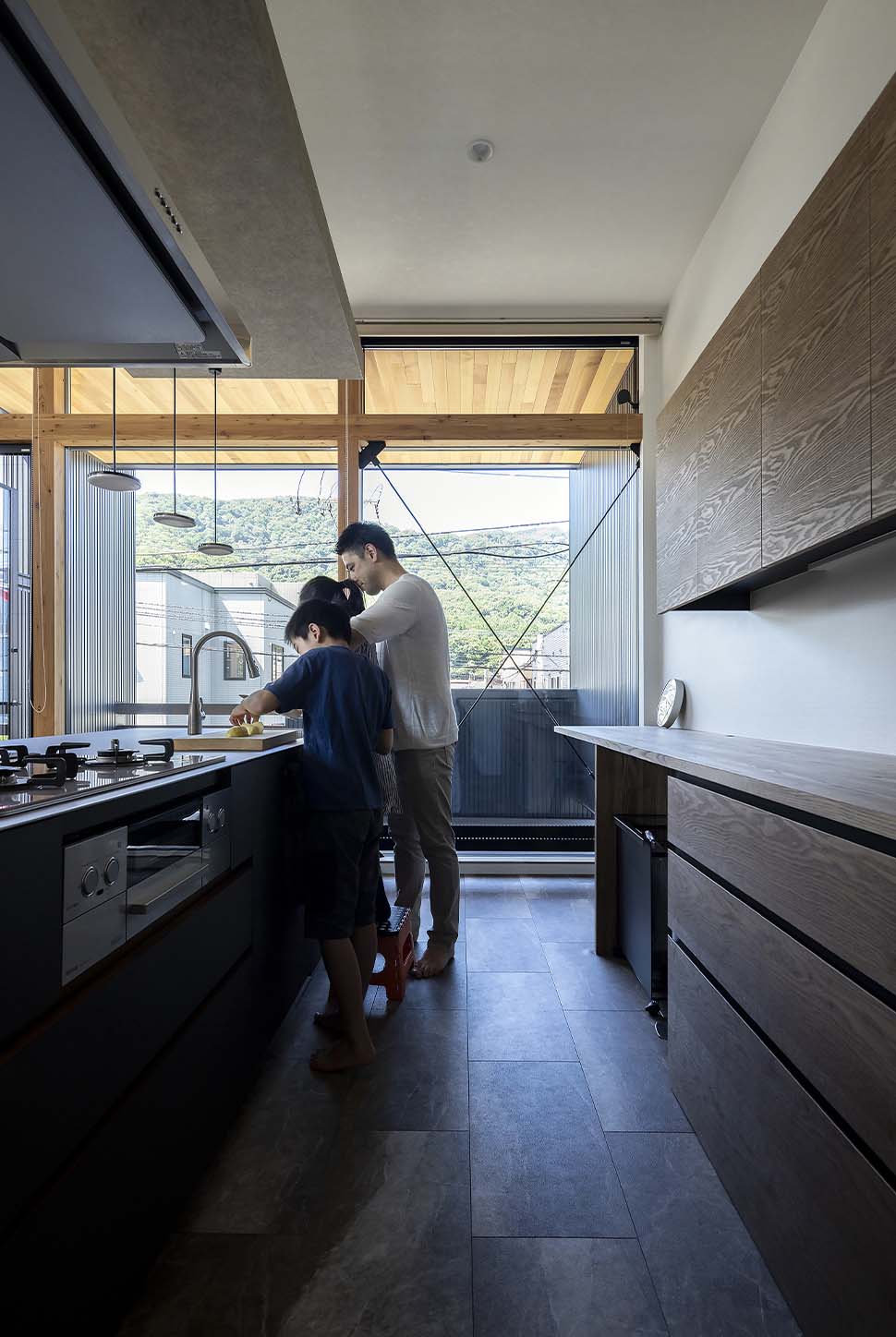 山を望む土地のポテンシャルを生かし、LDKやテラス、家事室など暮らしの中心は見晴らしの良い2階に集約。シェフであるIさんにとって特別な場所であるキッチンは、ダイニングとの距離感や、目線の高さを考えて繊細に調整し、床レベルを7㎝下げています。住宅地の喧騒を忘れて山を望む2階のLDKや、薪ストーブの炎を眺めて心穏やかに過ごす1階。Iさんご一家の新たな住まいは、そこかしこに自然と家族が集う豊かな空間が配されています。
