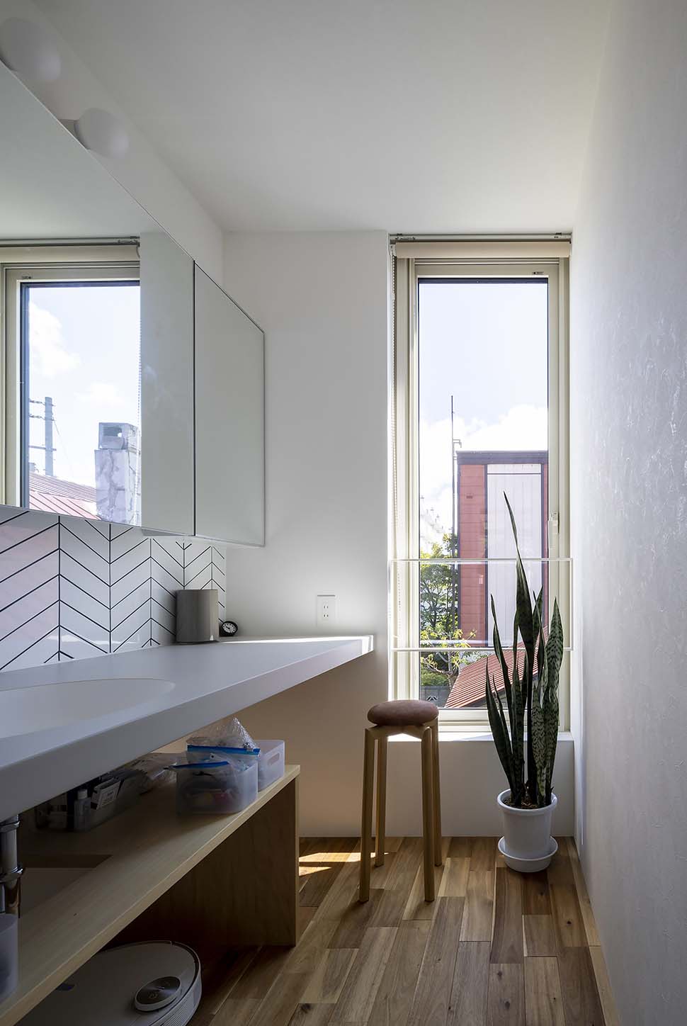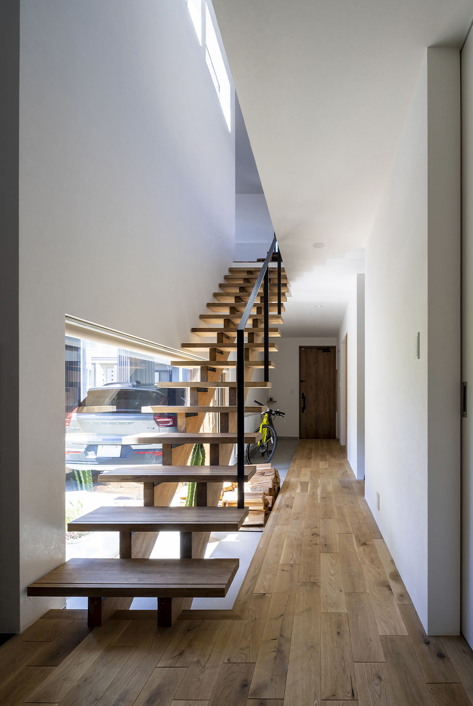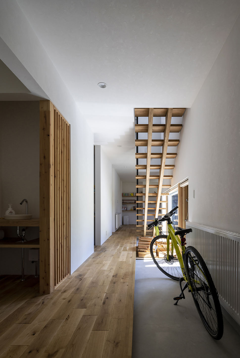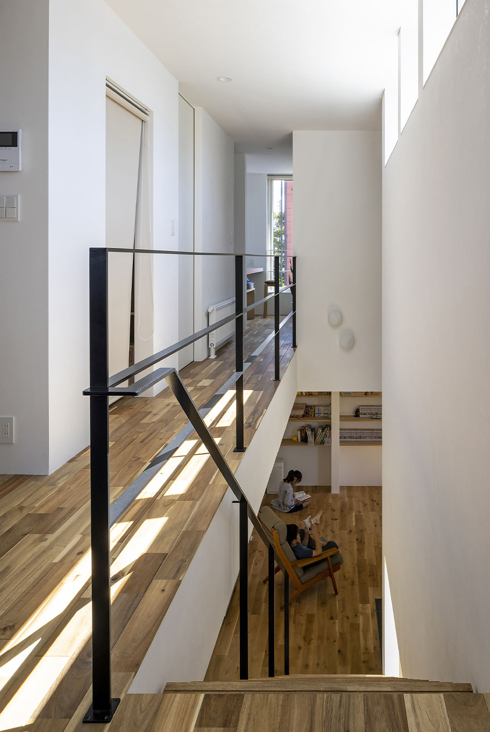 山を望む土地のポテンシャルを生かし、LDKやテラス、家事室など暮らしの中心は見晴らしの良い2階に集約。シェフであるIさんにとって特別な場所であるキッチンは、ダイニングとの距離感や、目線の高さを考えて繊細に調整し、床レベルを7㎝下げています。住宅地の喧騒を忘れて山を望む2階のLDKや、薪ストーブの炎を眺めて心穏やかに過ごす1階。Iさんご一家の新たな住まいは、そこかしこに自然と家族が集う豊かな空間が配されています。