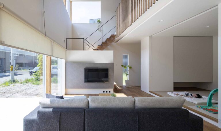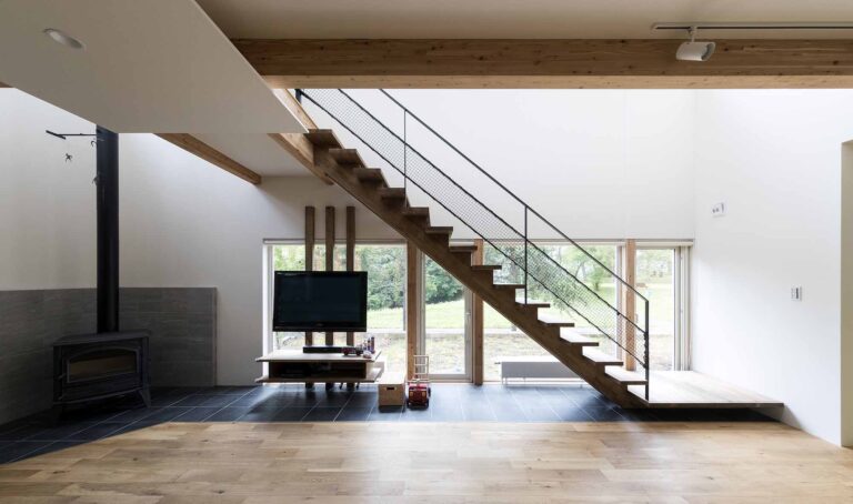 山を望む土地のポテンシャルを生かし、LDKやテラス、家事室など暮らしの中心は見晴らしの良い2階に集約。シェフであるIさんにとって特別な場所であるキッチンは、ダイニングとの距離感や、目線の高さを考えて繊細に調整し、床レベルを7㎝下げています。住宅地の喧騒を忘れて山を望む2階のLDKや、薪ストーブの炎を眺めて心穏やかに過ごす1階。Iさんご一家の新たな住まいは、そこかしこに自然と家族が集う豊かな空間が配されています。