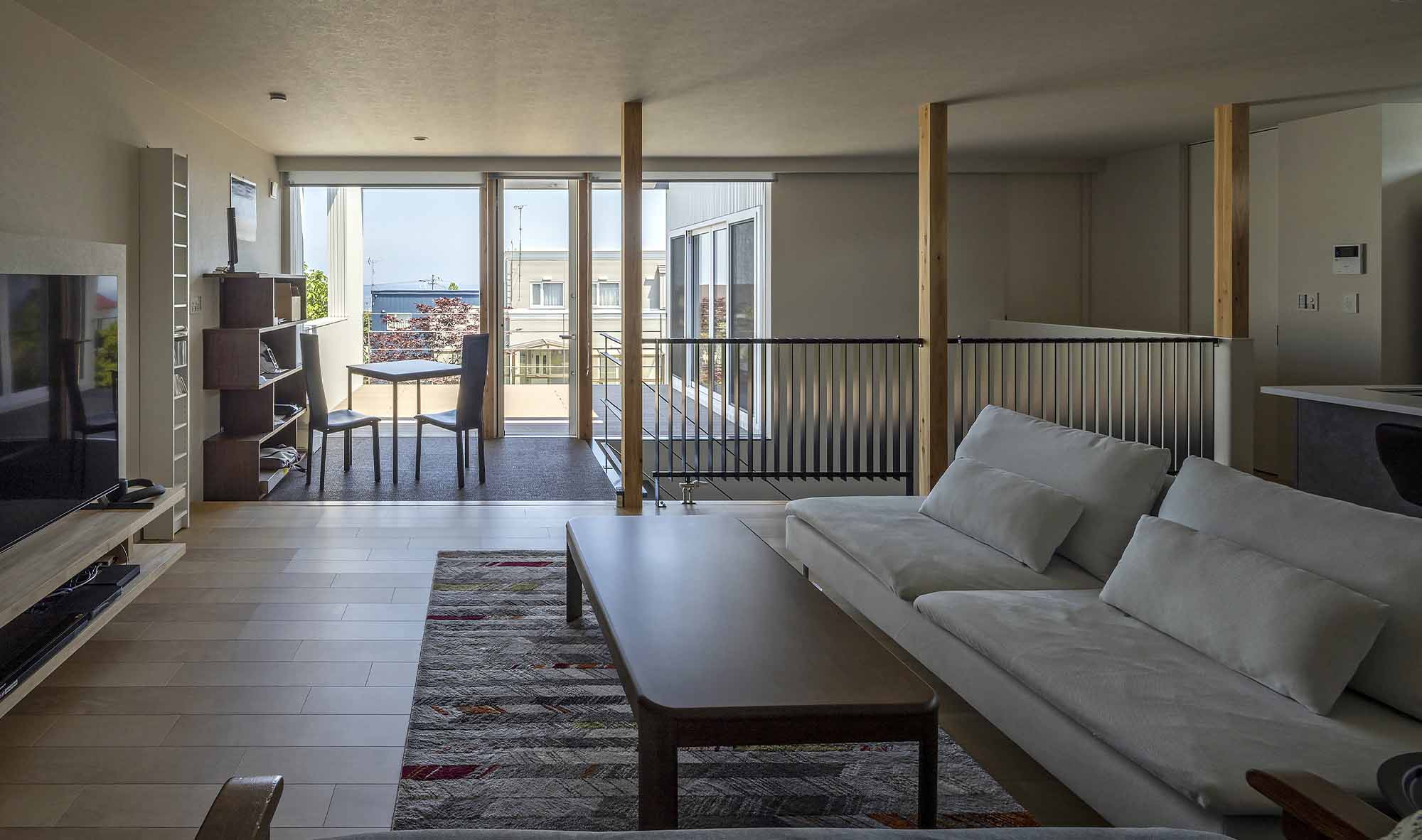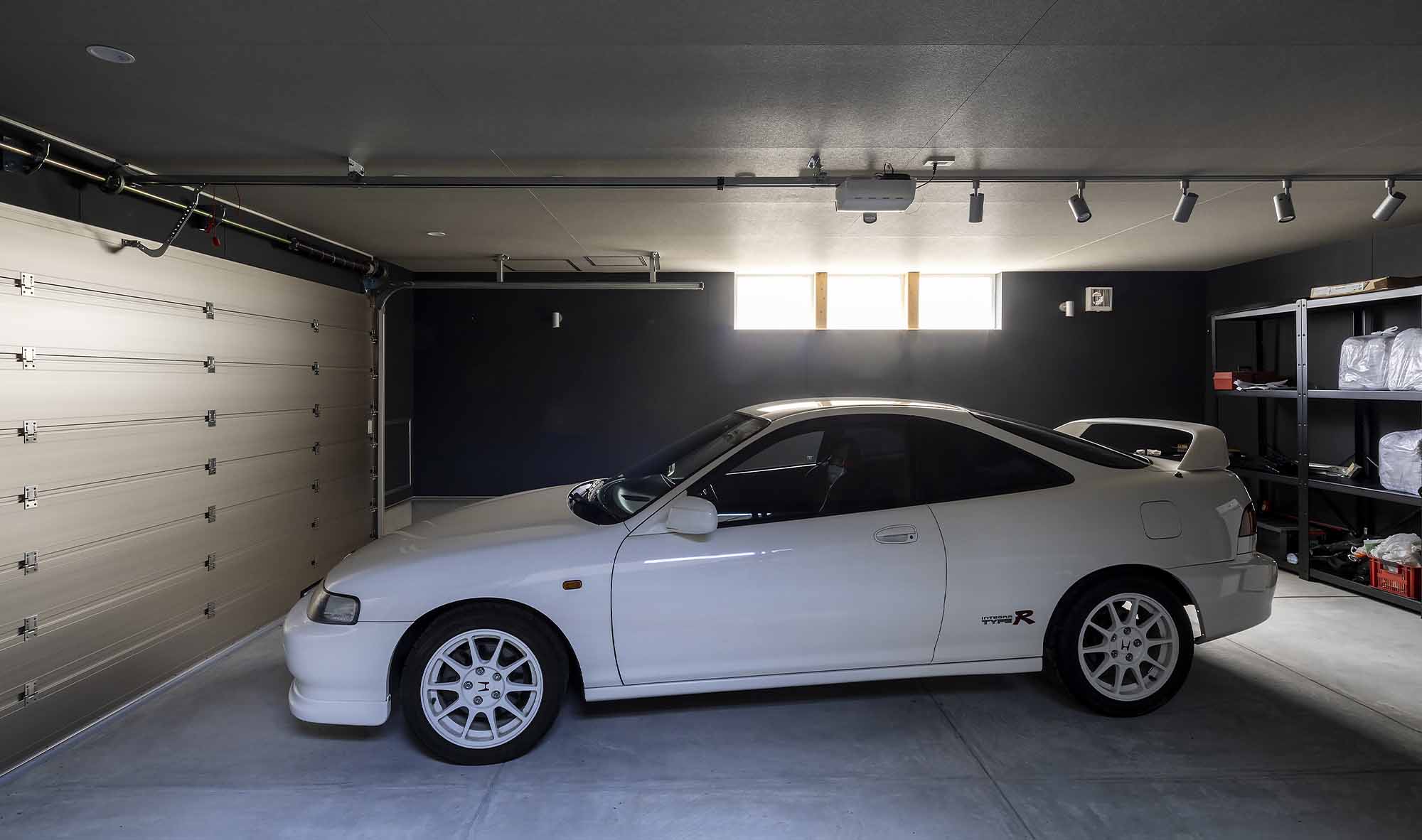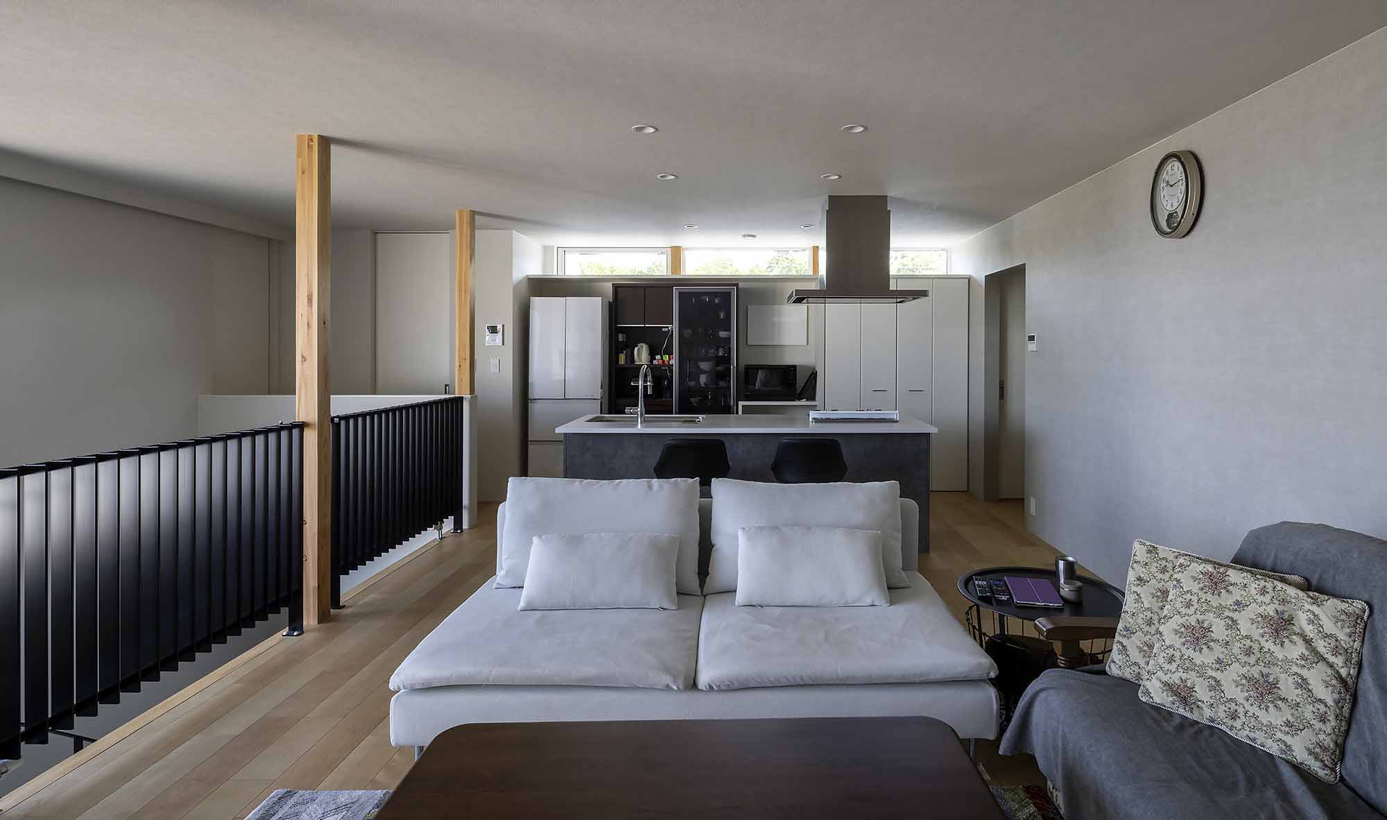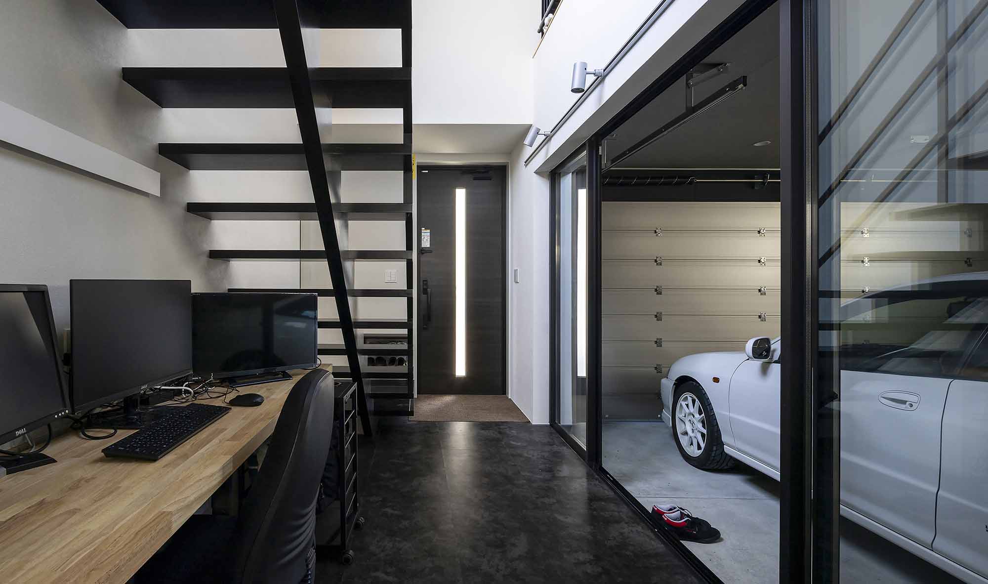完成したMさん宅は、1階に車2台分のガレージを備えた2階リビングの住まい。1階ホールに配置されたワークスペースでは、ガラス越しに愛車を感じながら事務仕事をこなすことも多いといいます。黒を基調としたシックな色合いの1階から階段を上がると目の前に広がるのは、白と木で整えられた仕切りのないLDK。北側の窓には遠くに海を望むテラスが続き、「こんなにゆっくり海を見たことがなかったな」と窓を眺めながらMさんは思わずポツリ。1人穏やかに過ごしたり、妹さん家族を招いて賑やかにBBQを楽しんだりと、Mさんの新たな暮らしは始まっています。