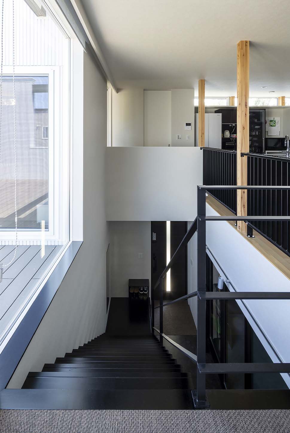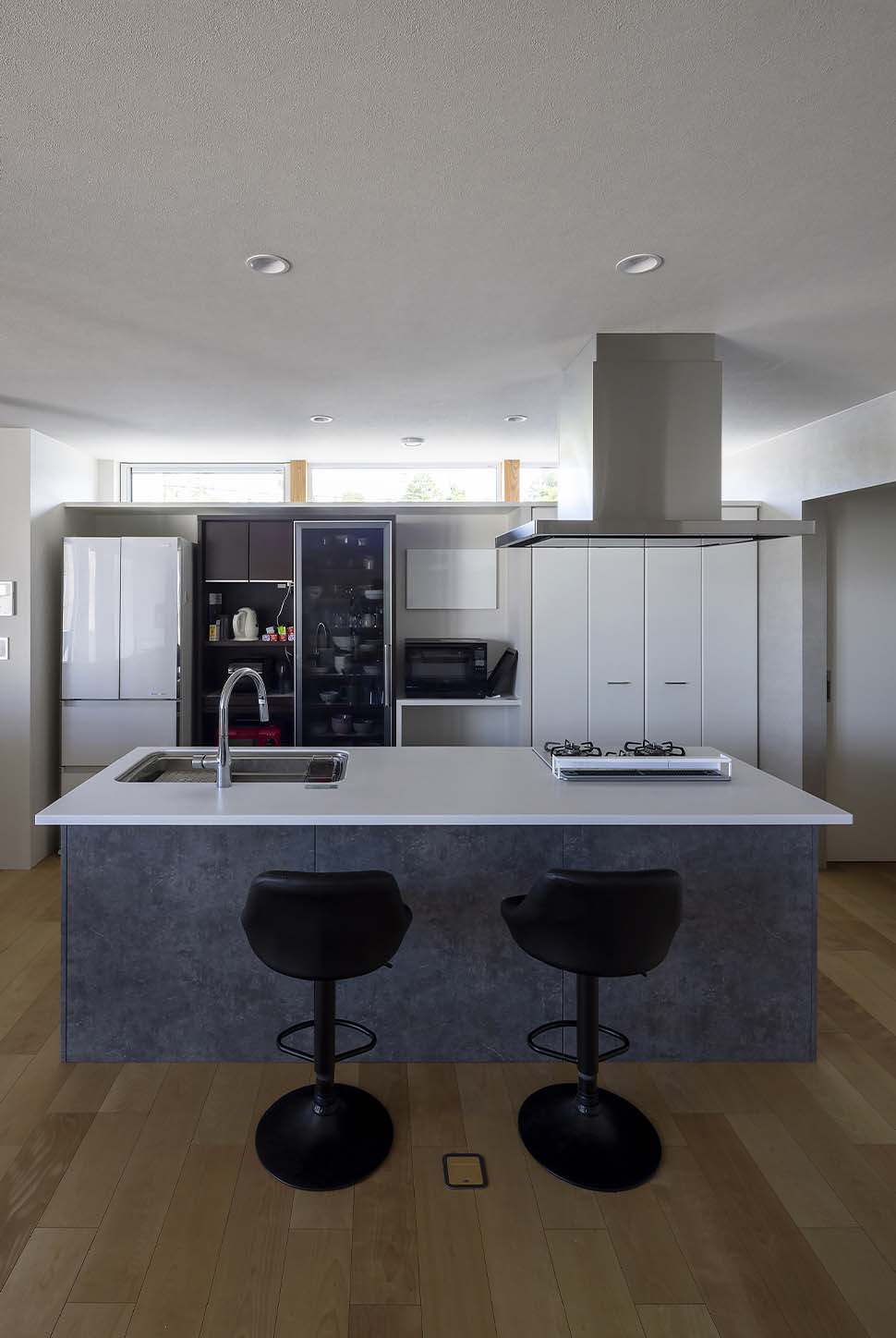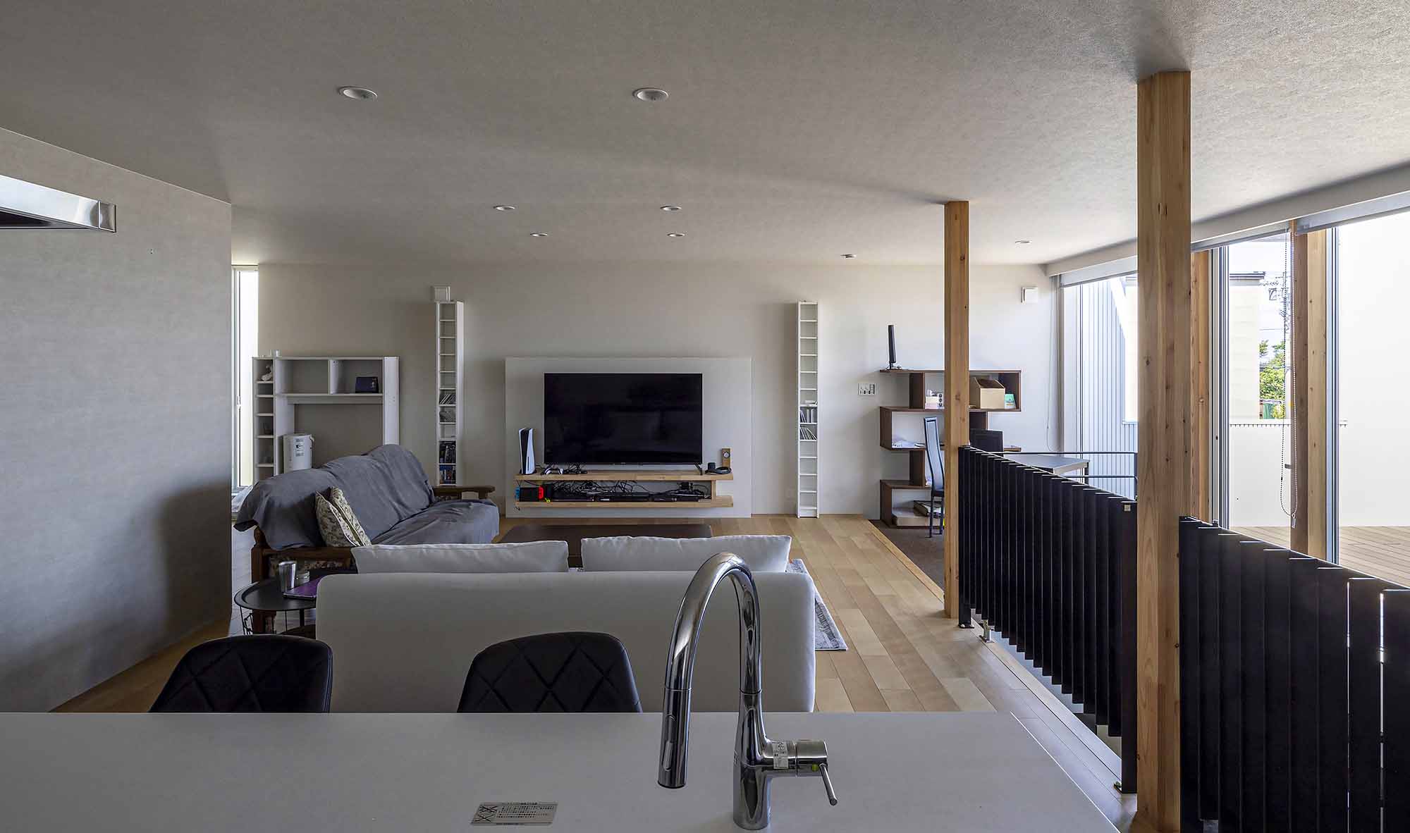 完成したMさん宅は、1階に車2台分のガレージを備えた2階リビングの住まい。1階ホールに配置されたワークスペースでは、ガラス越しに愛車を感じながら事務仕事をこなすことも多いといいます。黒を基調としたシックな色合いの1階から階段を上がると目の前に広がるのは、白と木で整えられた仕切りのないLDK。北側の窓には遠くに海を望むテラスが続き、「こんなにゆっくり海を見たことがなかったな」と窓を眺めながらMさんは思わずポツリ。1人穏やかに過ごしたり、妹さん家族を招いて賑やかにBBQを楽しんだりと、Mさんの新たな暮らしは始まっています。