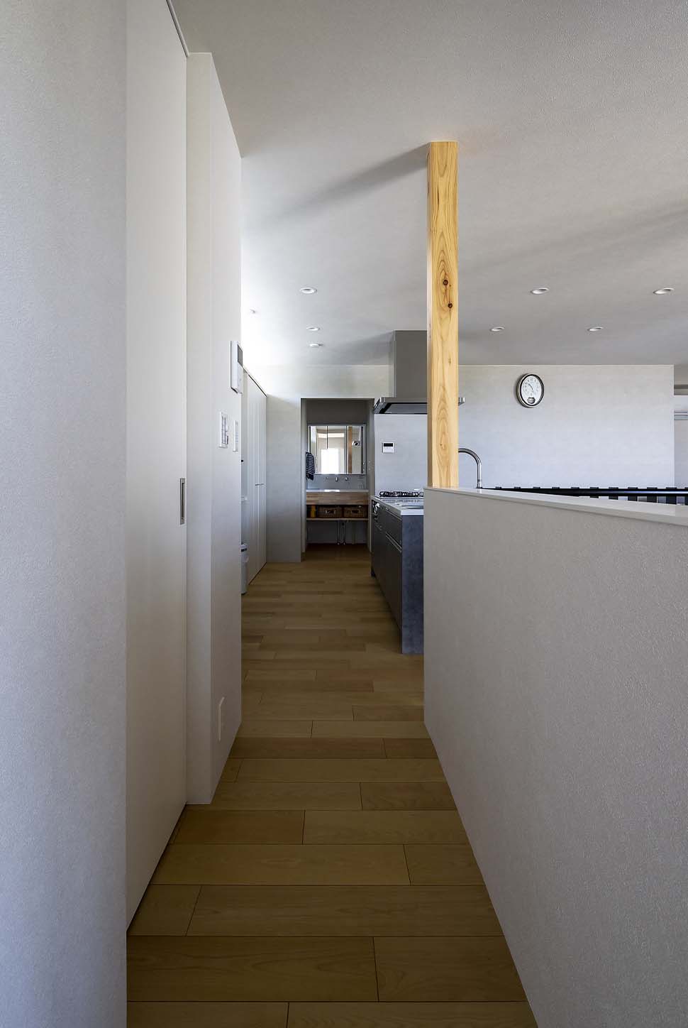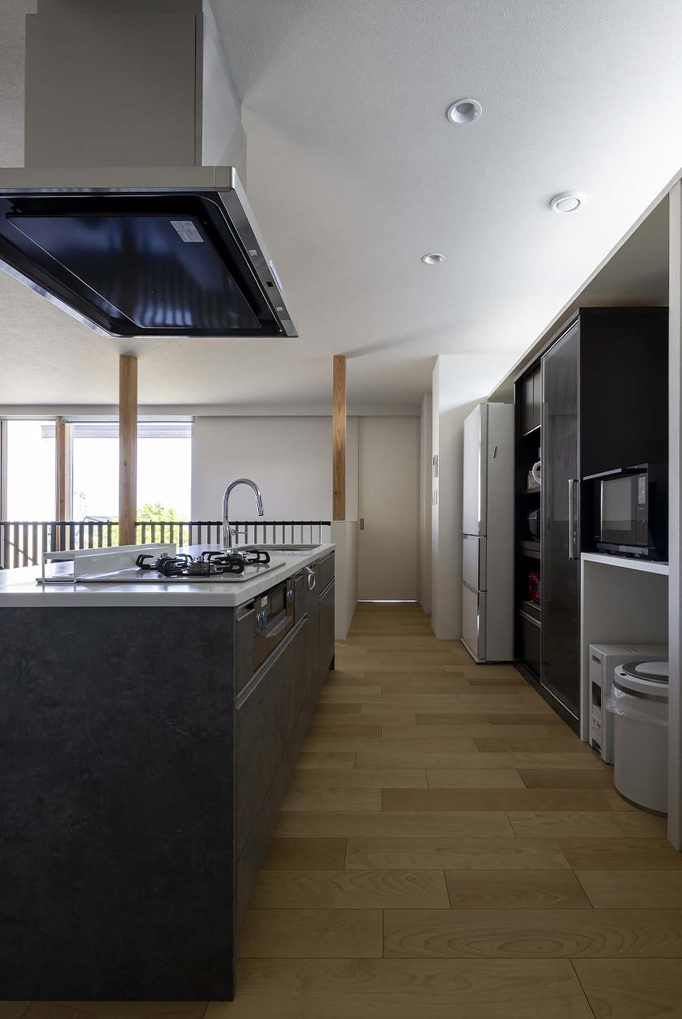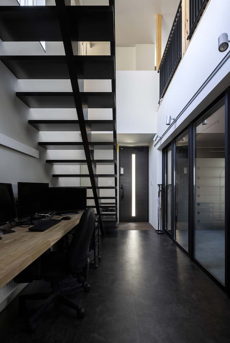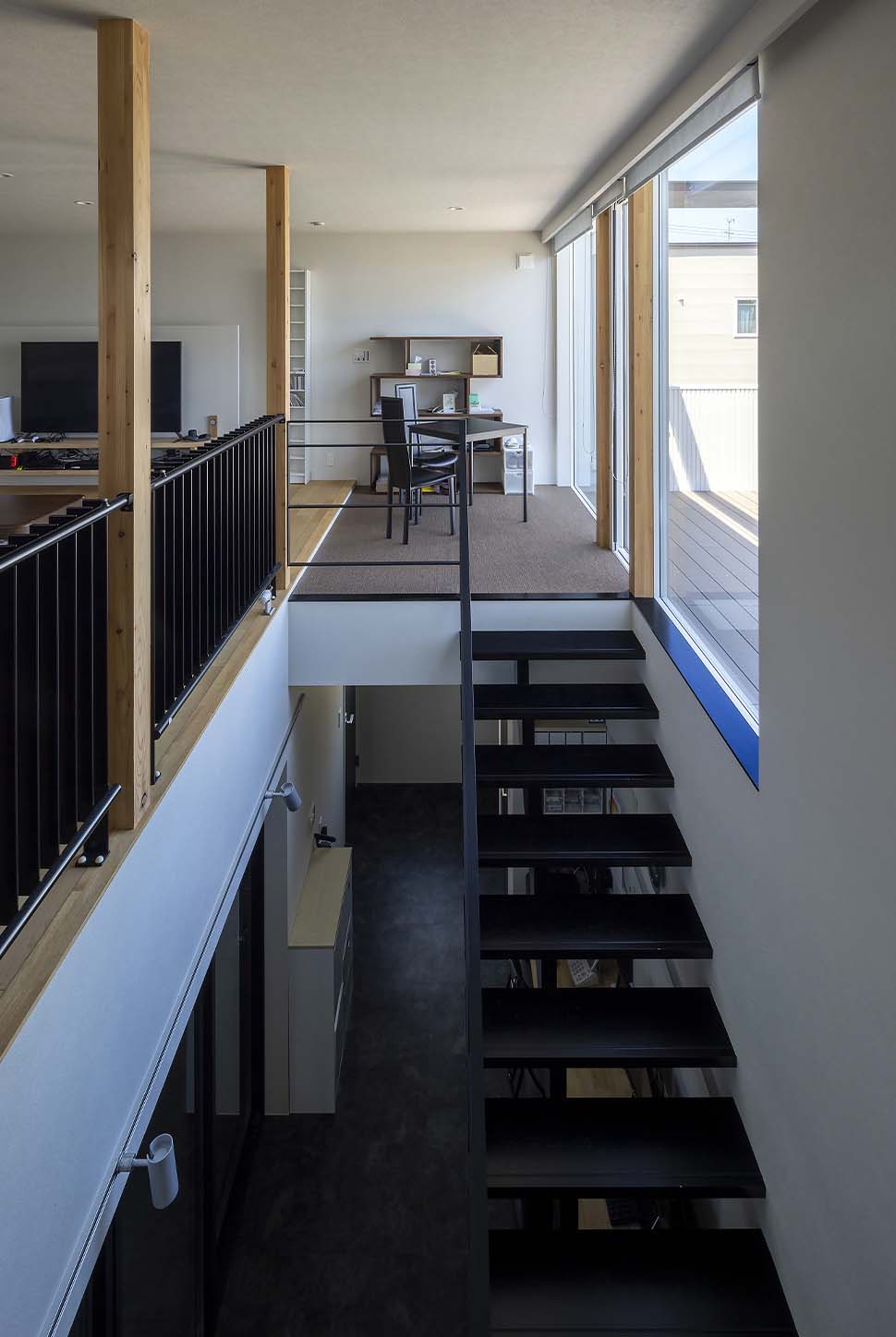 完成したMさん宅は、1階に車2台分のガレージを備えた2階リビングの住まい。1階ホールに配置されたワークスペースでは、ガラス越しに愛車を感じながら事務仕事をこなすことも多いといいます。黒を基調としたシックな色合いの1階から階段を上がると目の前に広がるのは、白と木で整えられた仕切りのないLDK。北側の窓には遠くに海を望むテラスが続き、「こんなにゆっくり海を見たことがなかったな」と窓を眺めながらMさんは思わずポツリ。1人穏やかに過ごしたり、妹さん家族を招いて賑やかにBBQを楽しんだりと、Mさんの新たな暮らしは始まっています。