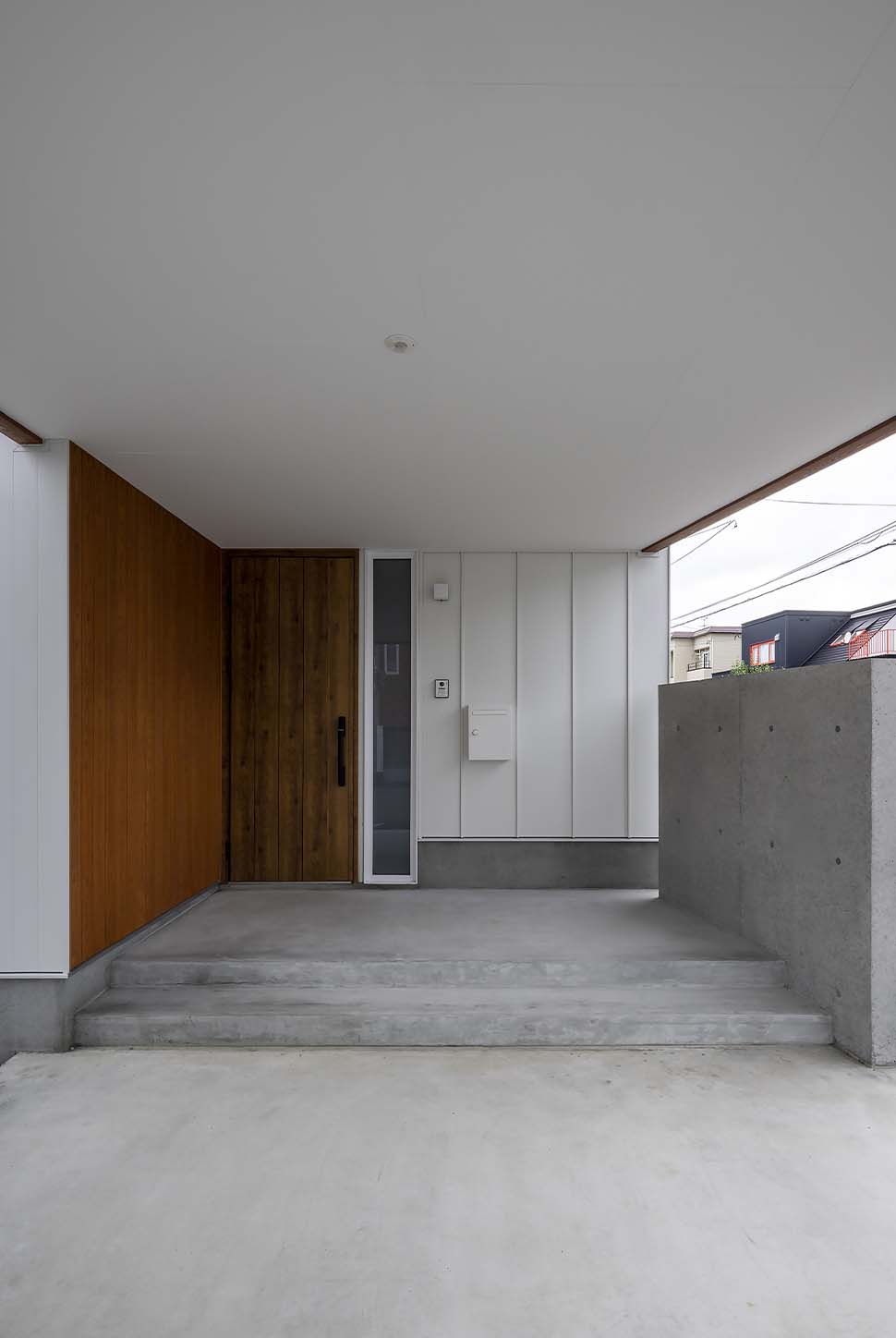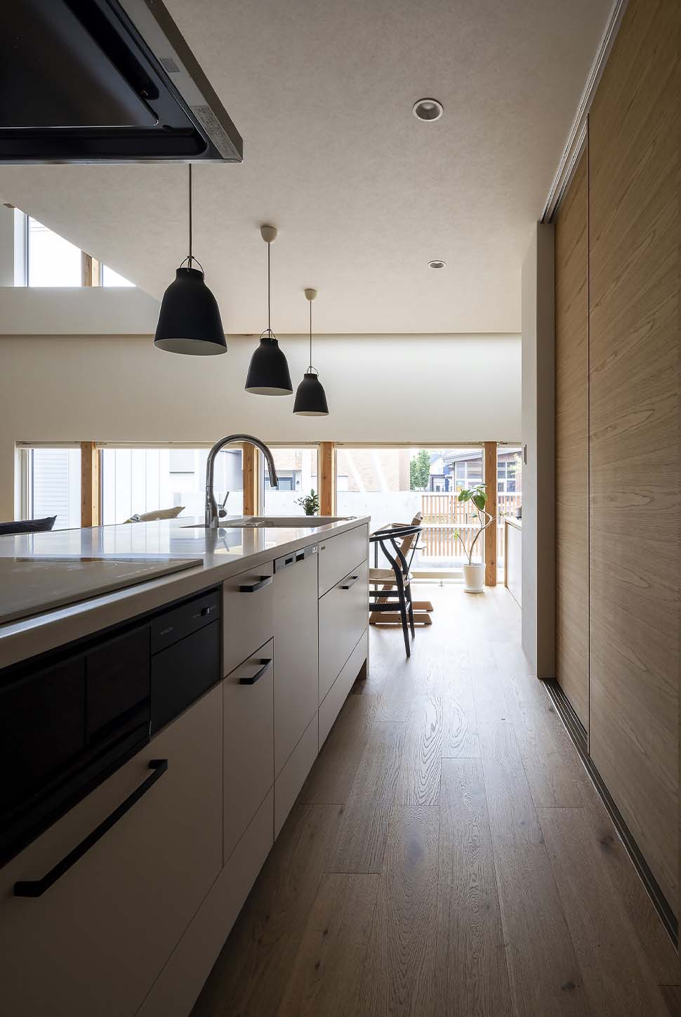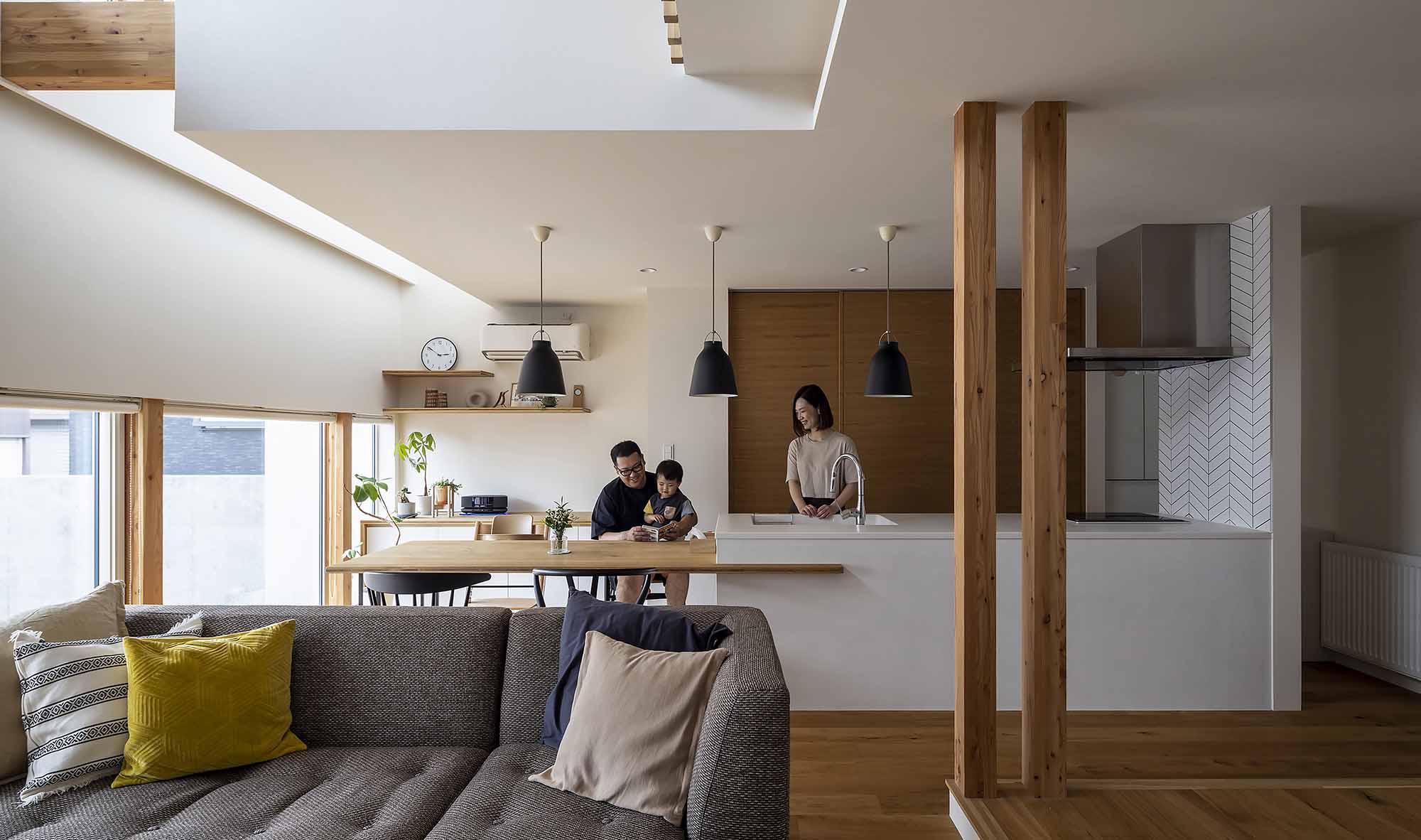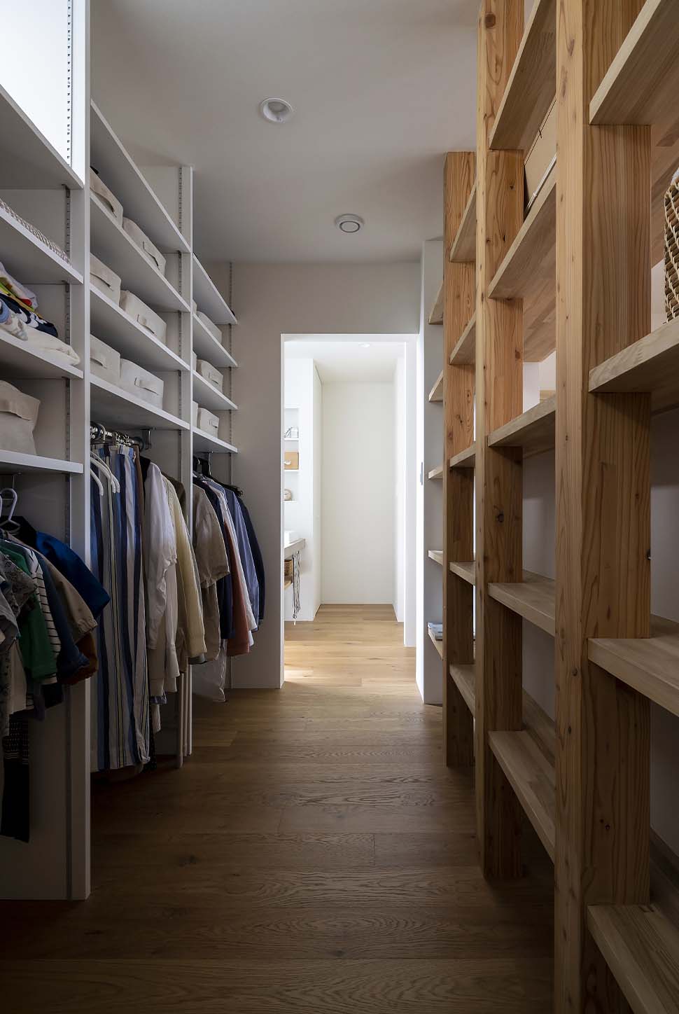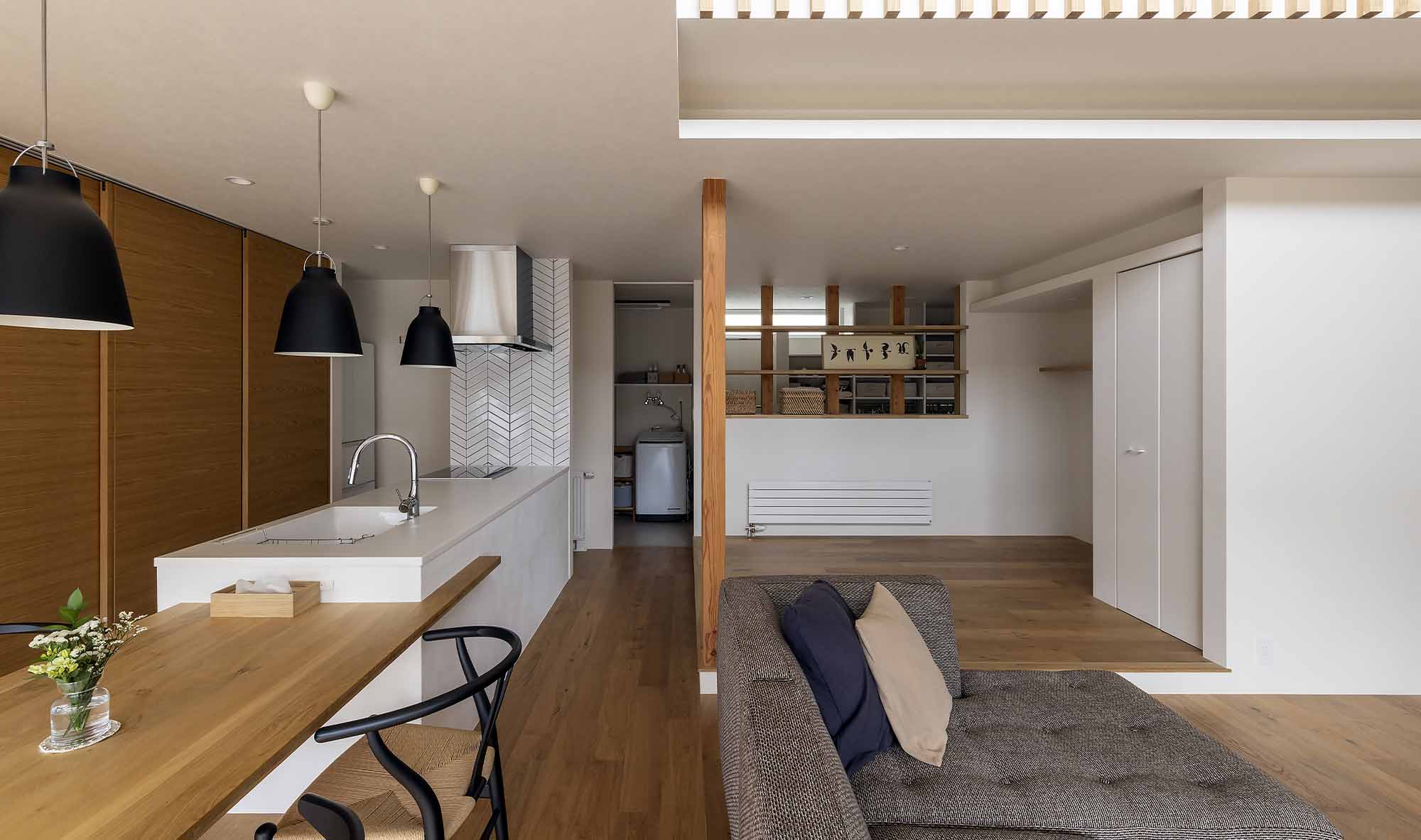 建物続きのカーポート、吹き抜けのリビング、効率のよい回遊動線、片流れの屋根など、要望を伝えて仕上がったプランをベースに、細かな部分を詰めていきました。「回遊動線はミライエホームさんからの提案でしたが、仕事から帰ってきて、手を洗い、スーツを脱いで洗うものはそのまま洗濯機へ。シャワーを浴びて着替えてリビングへという動線が効率的で、この間取りは大正解でした」とNさん。オープン棚の見せる収納も、センスの良い奥さんの工夫で機能的でおしゃれな印象になっています。