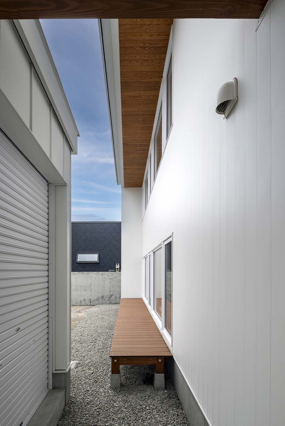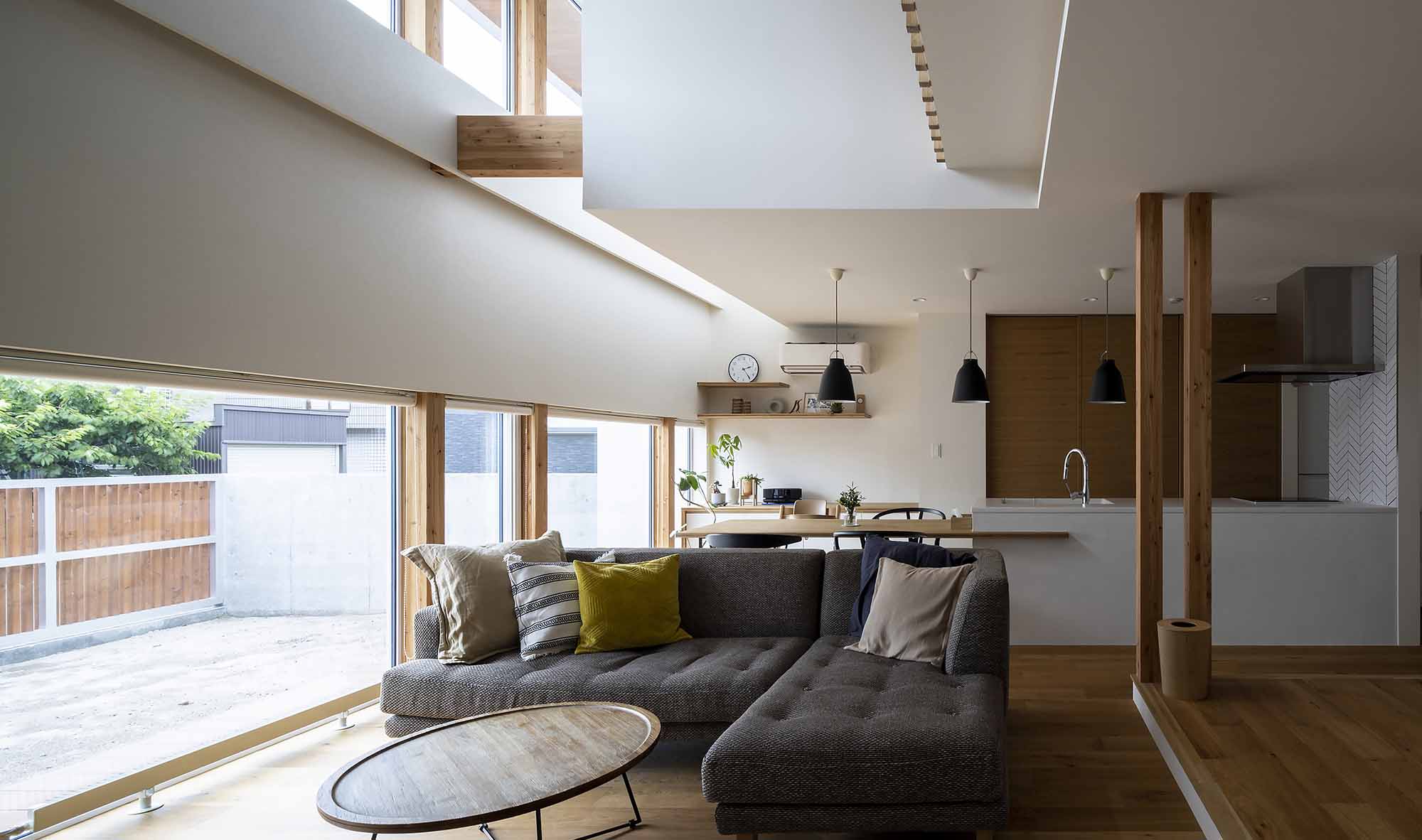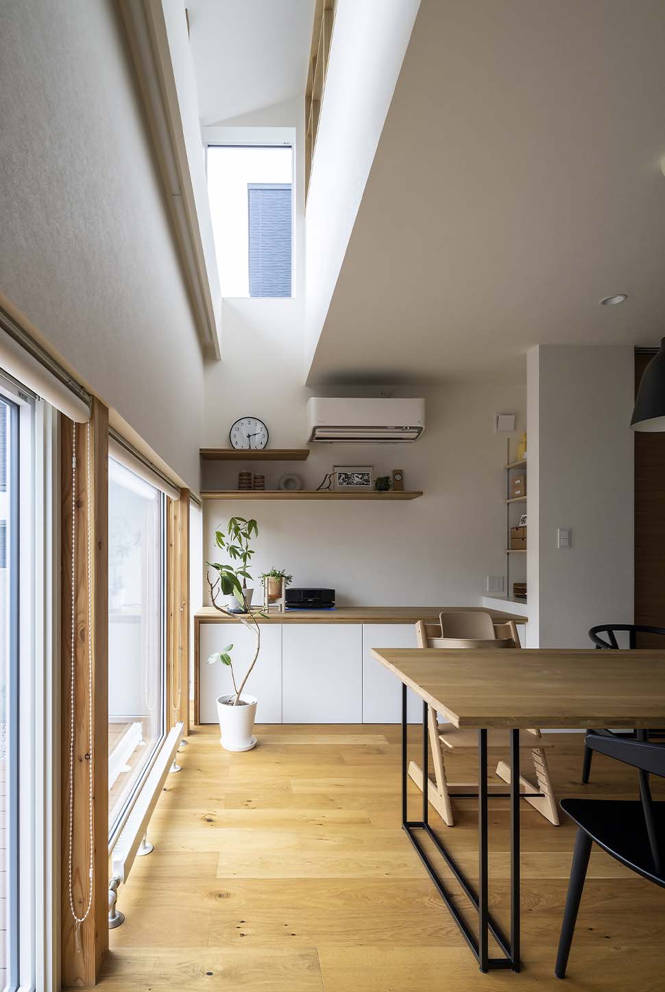 複数のプランから、結果として南西向きではなく南東を向き、往来からの視線は開口の低めコントロールと塀の設置で閉じ、南西からの午後の陽は吹き抜けから取り入れるという解となり、成功したと感じています。