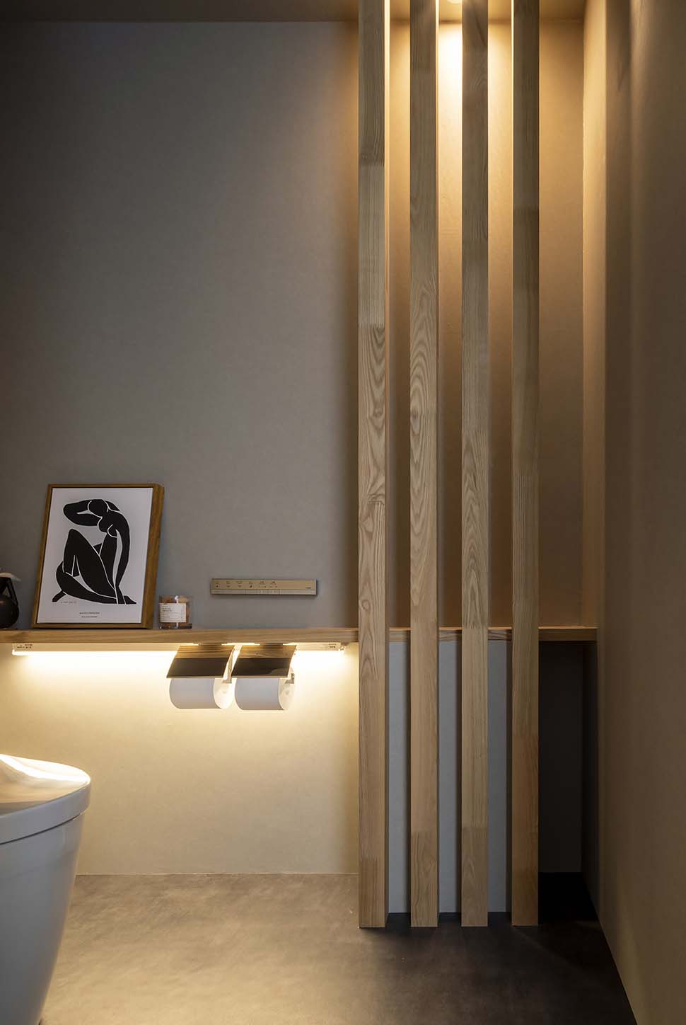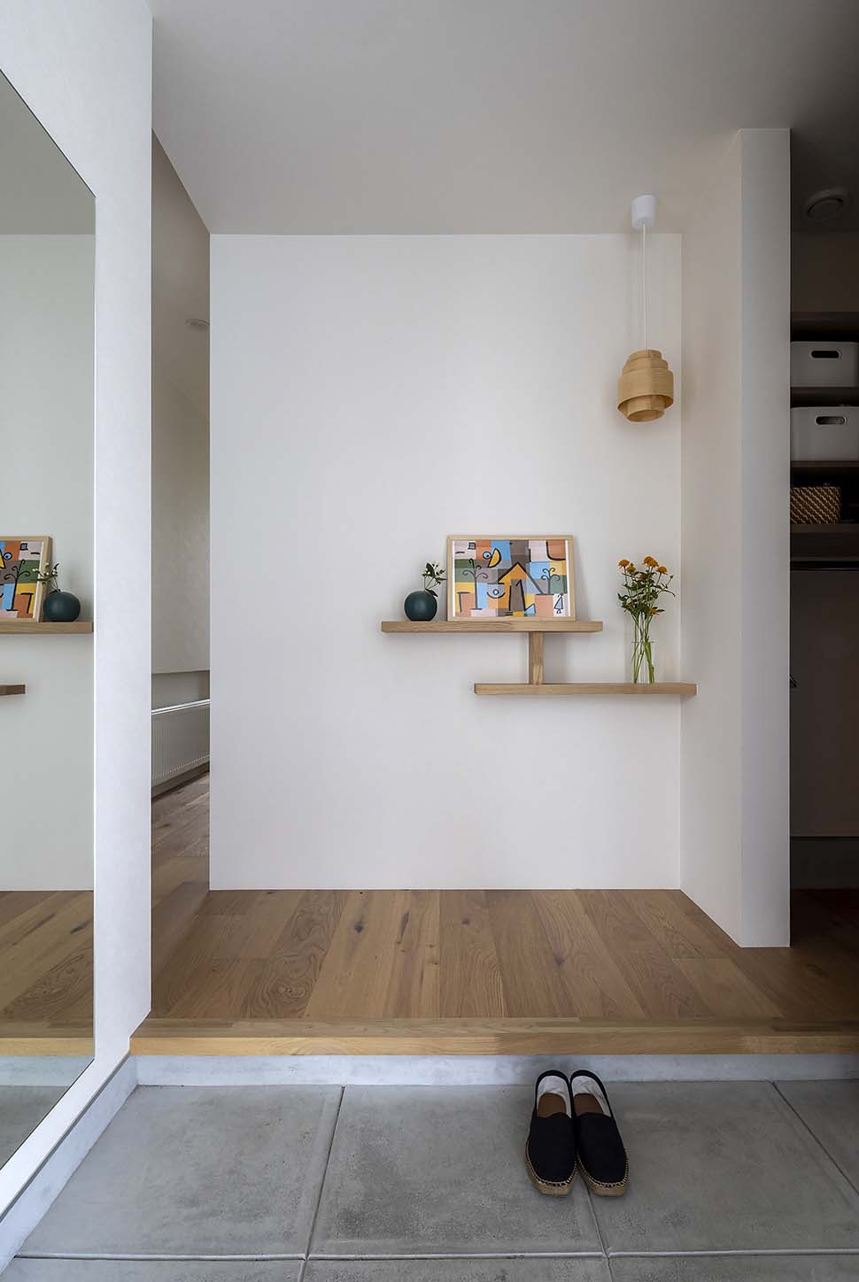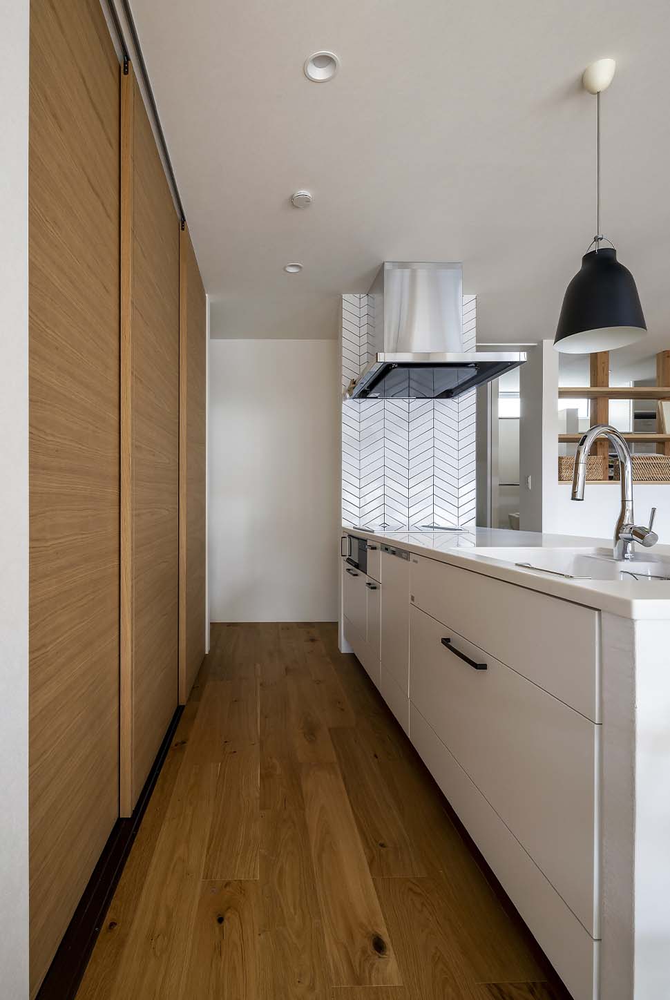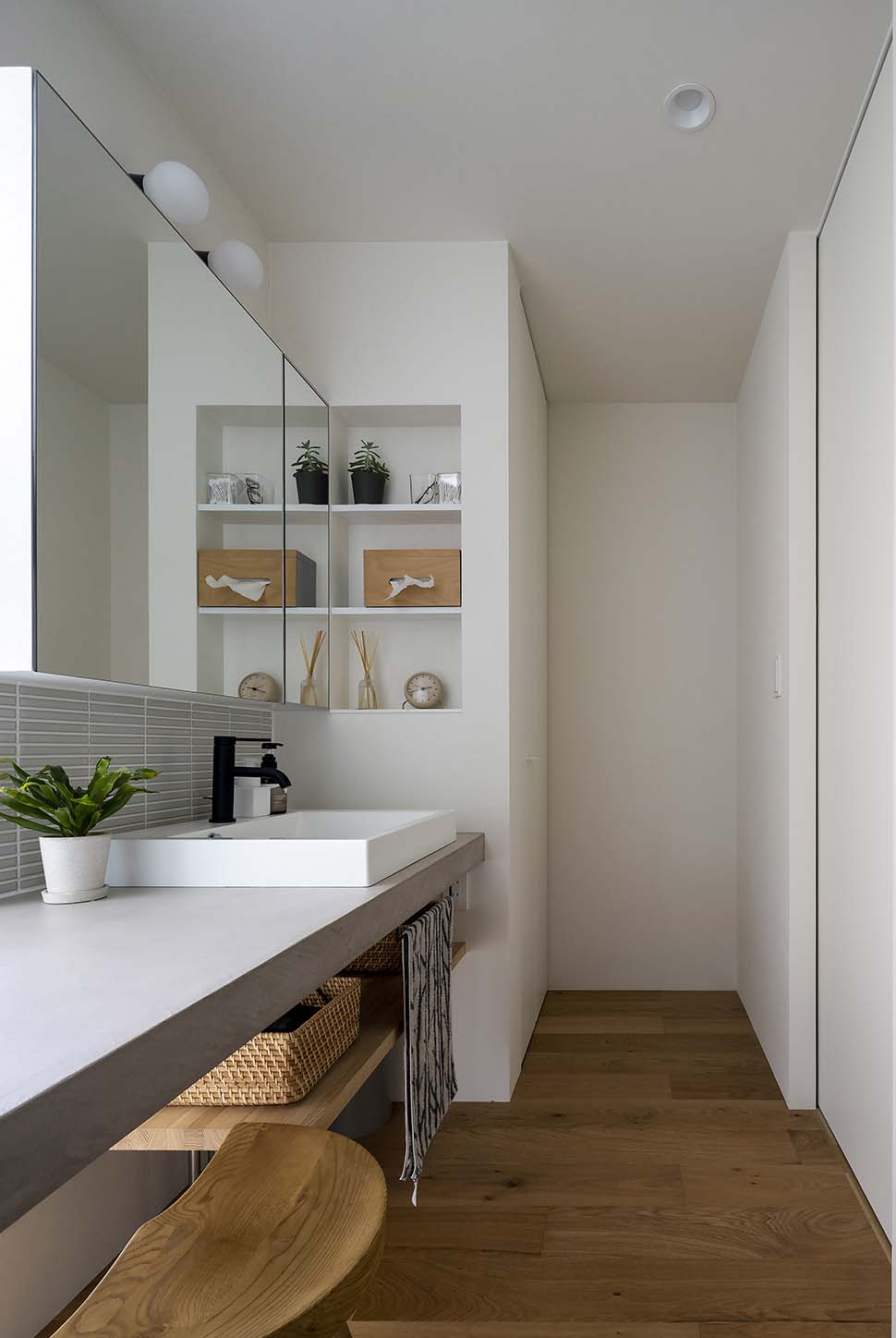 夫婦ともにお気に入りなのが、モールテックスの素材づかいです。キッチン、洗面台、そしてテレビを配置した壁と要所要所に、珍しいホワイトを採用して存在感を示しています。「私たちが雑誌やネットで探したものを伝えると、さらにブラッシュアップして提案してくれる。ほとんど『できません』とは言わずに、難しい場合はそれを上回るアイデアを出してくれるんです。家事動線や細かな意匠、素材づかいなど、デザインだけでなく使い勝手も含めた提案にプロの力を感じました」。