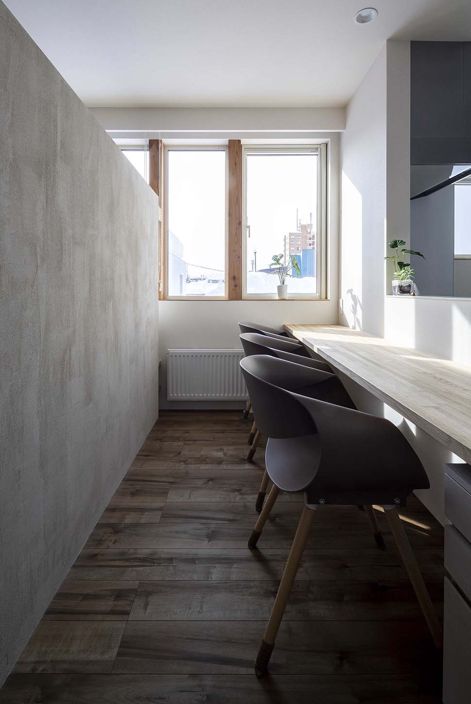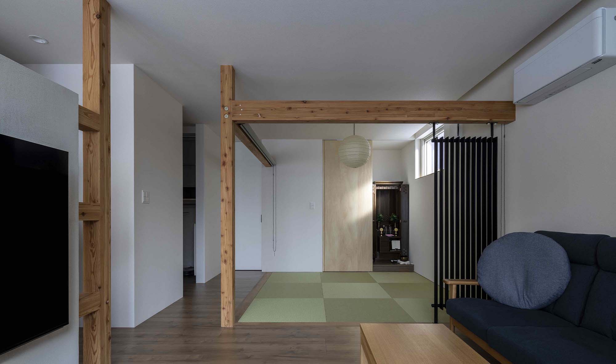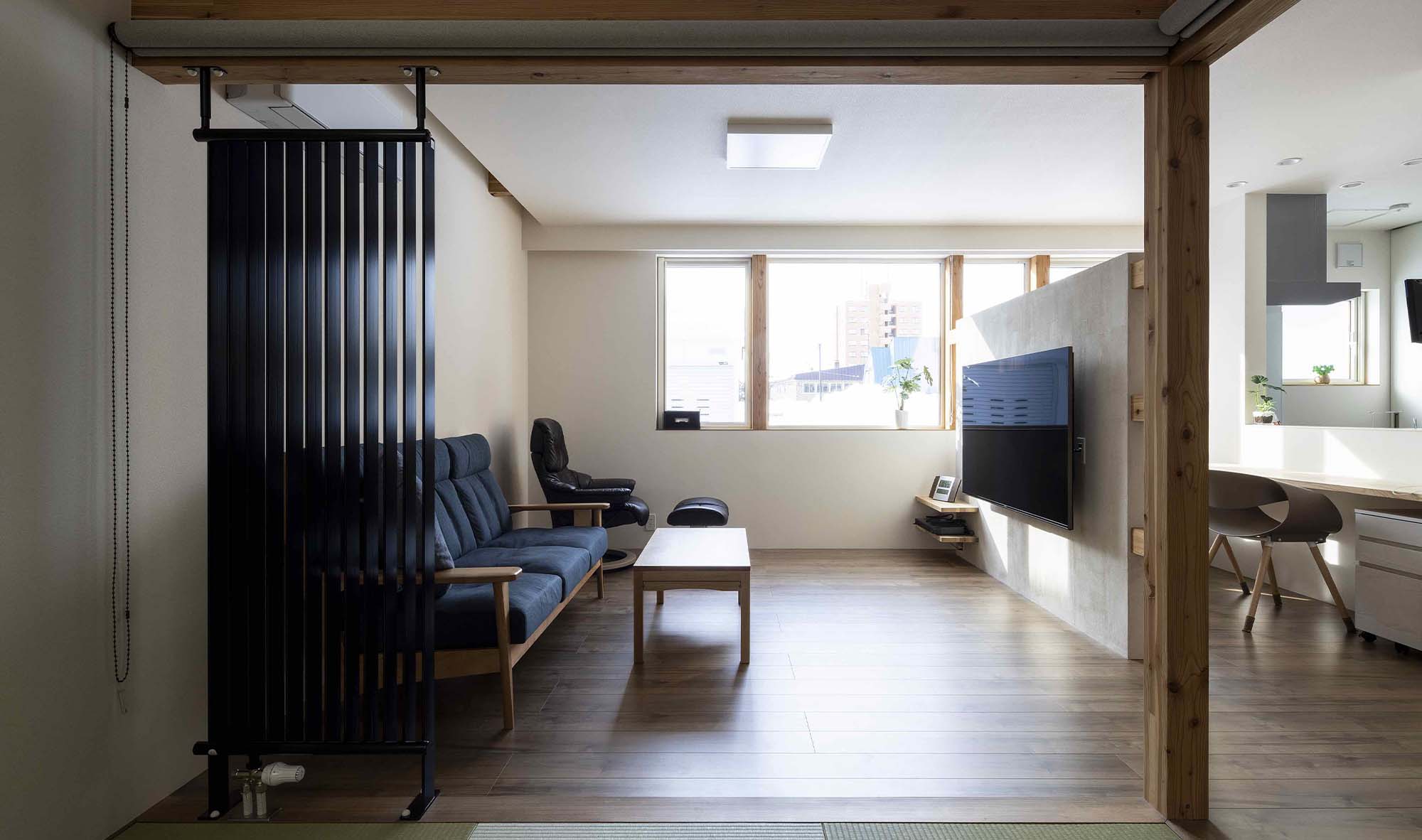 キッチンカウンターとリビングを珪藻土のボードで仕切っている。和室は親戚が集まった時に活躍するそうだ。