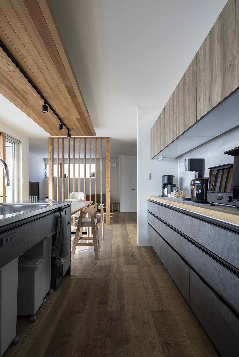 1階部分にご両親の居住スペースと祖母の部屋。2階に若夫婦。世帯ごとに共有するスペースはないものの、室内で繋がりあっている構成だ。互いのプライバシーを守りながら、ほどよい距離感が快適な暮らしを支えているのかもしれない。