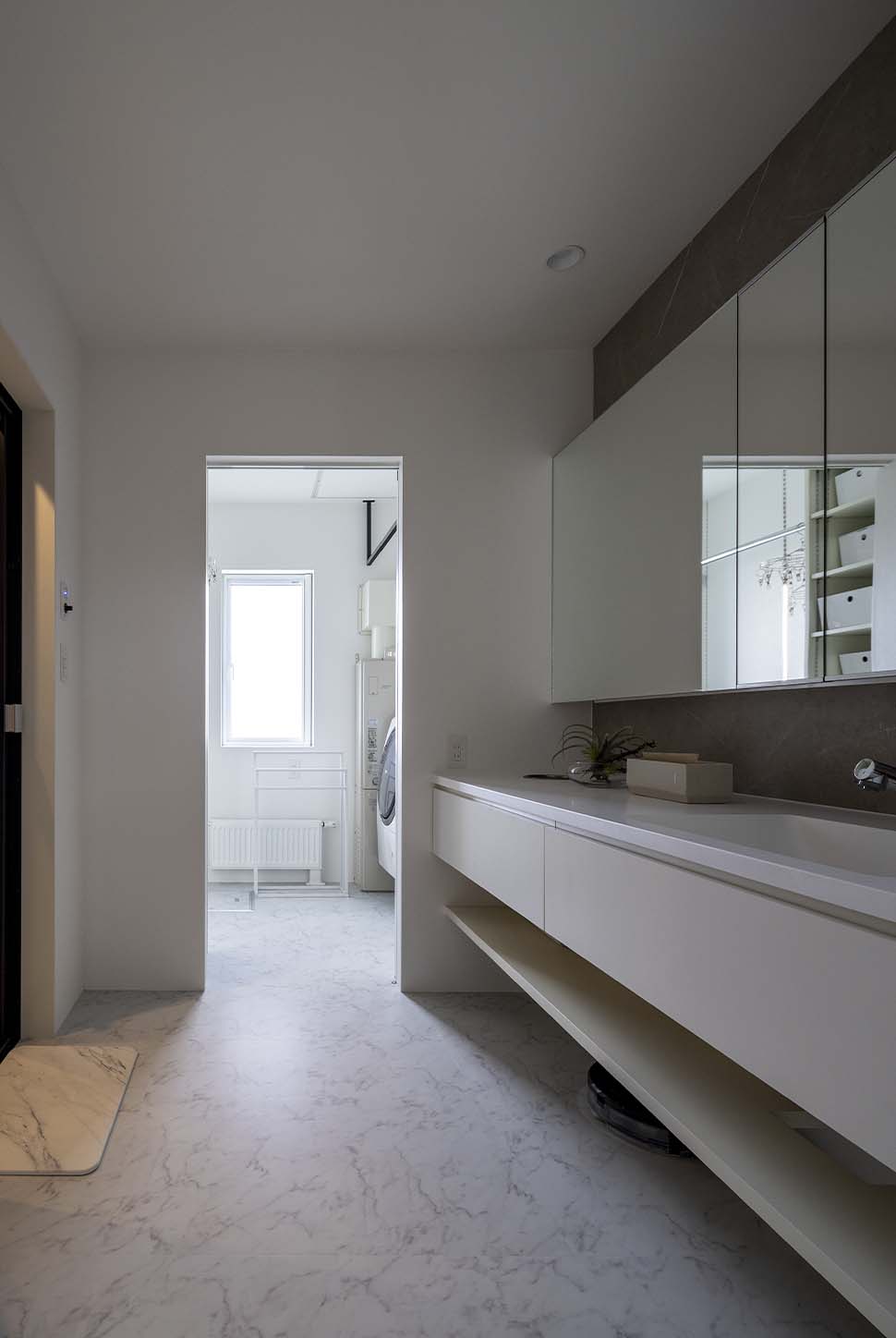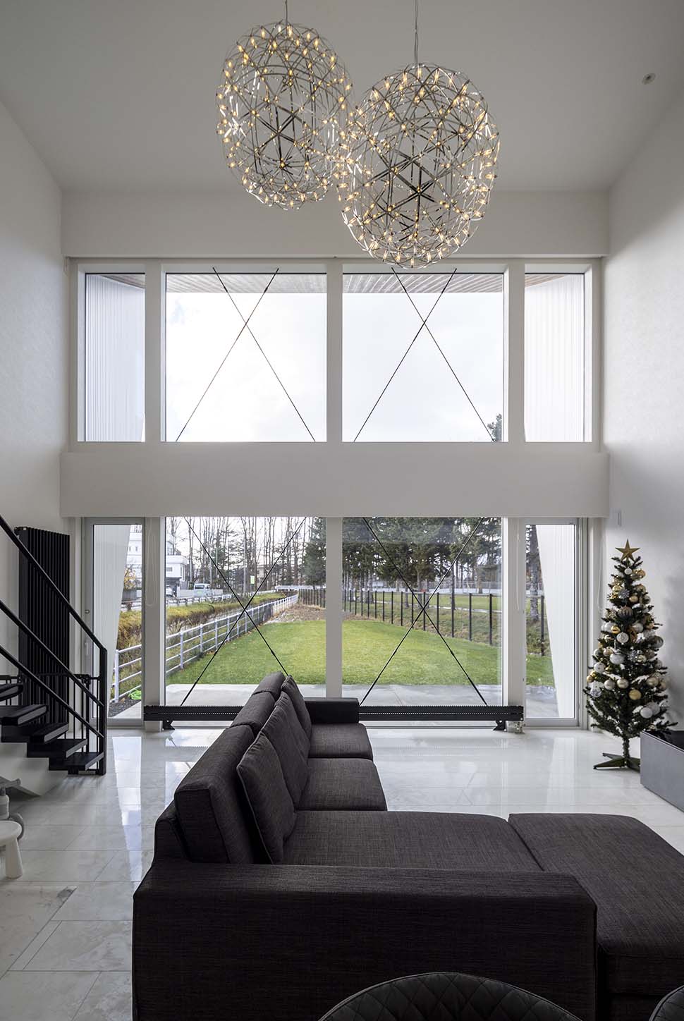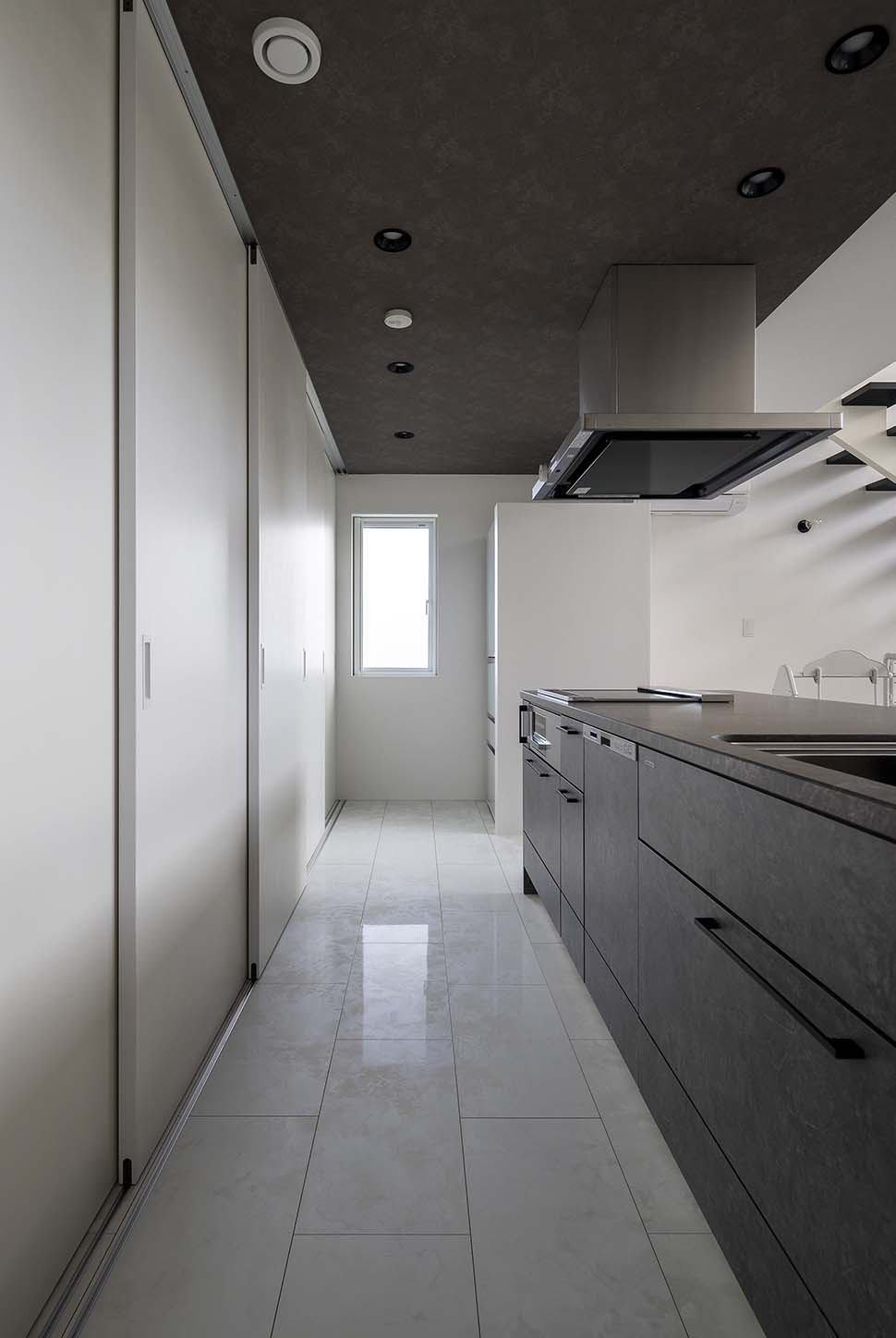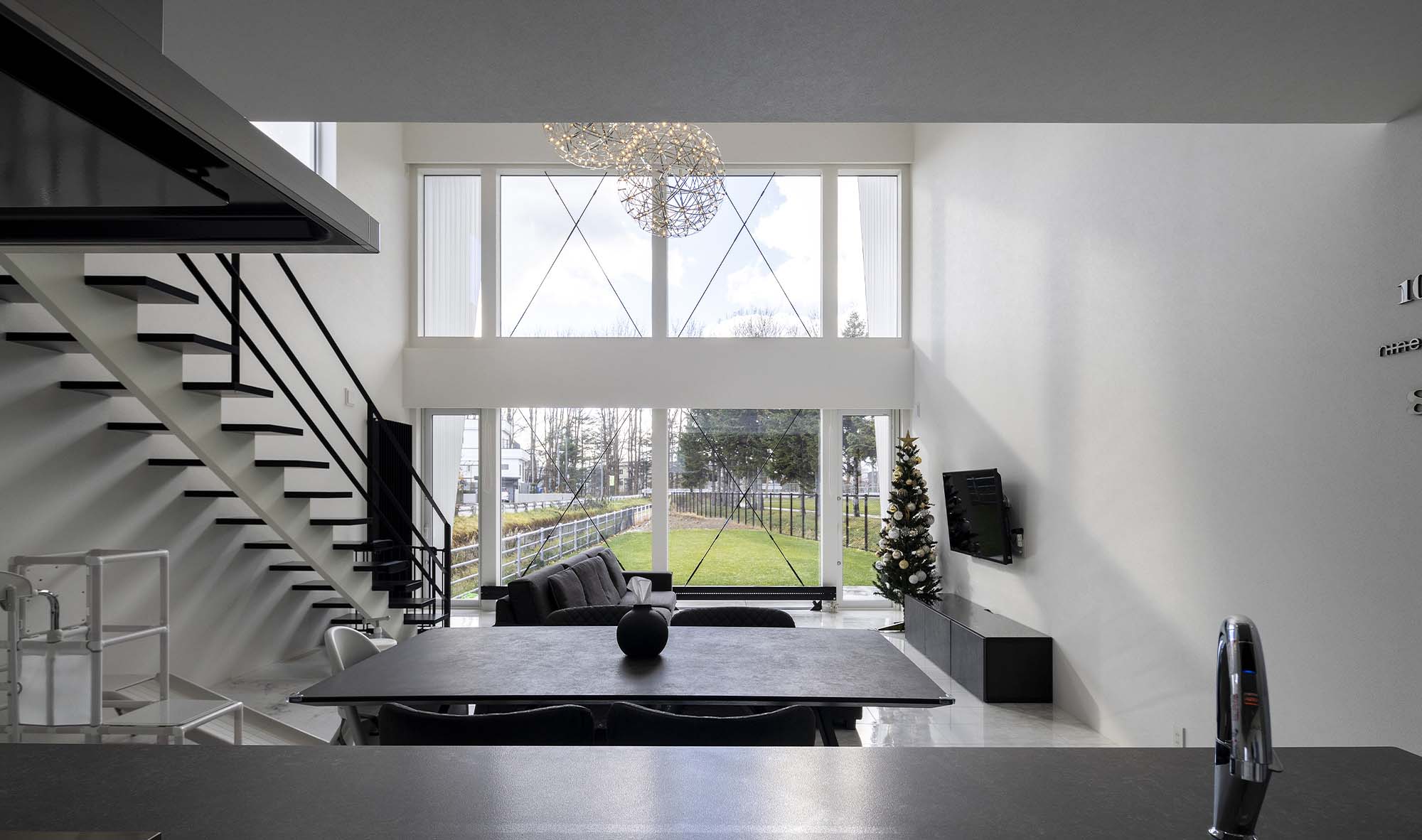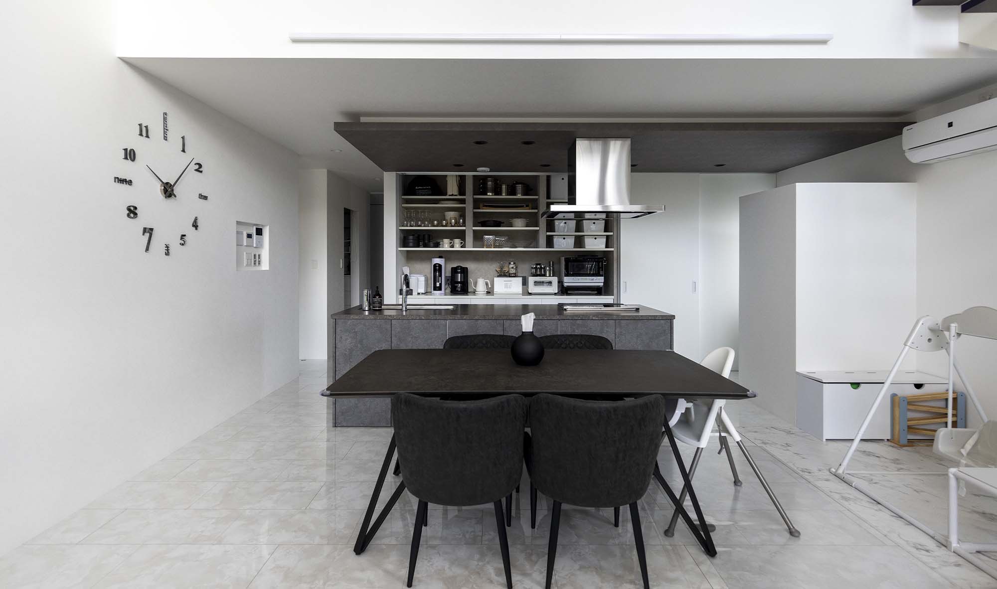 床の色は以前から決めていた「白」。インテリアはその白に合わせるように黒とグレーに。 「私のお気に入りの資料(写真)をたくさん持ち寄り、アイランドキッチン、下がり天井、窓と吹き抜けを大きくなど、たくさん要望を出しすぎたかもしれません笑。想像通りに仕上がって満足しています」