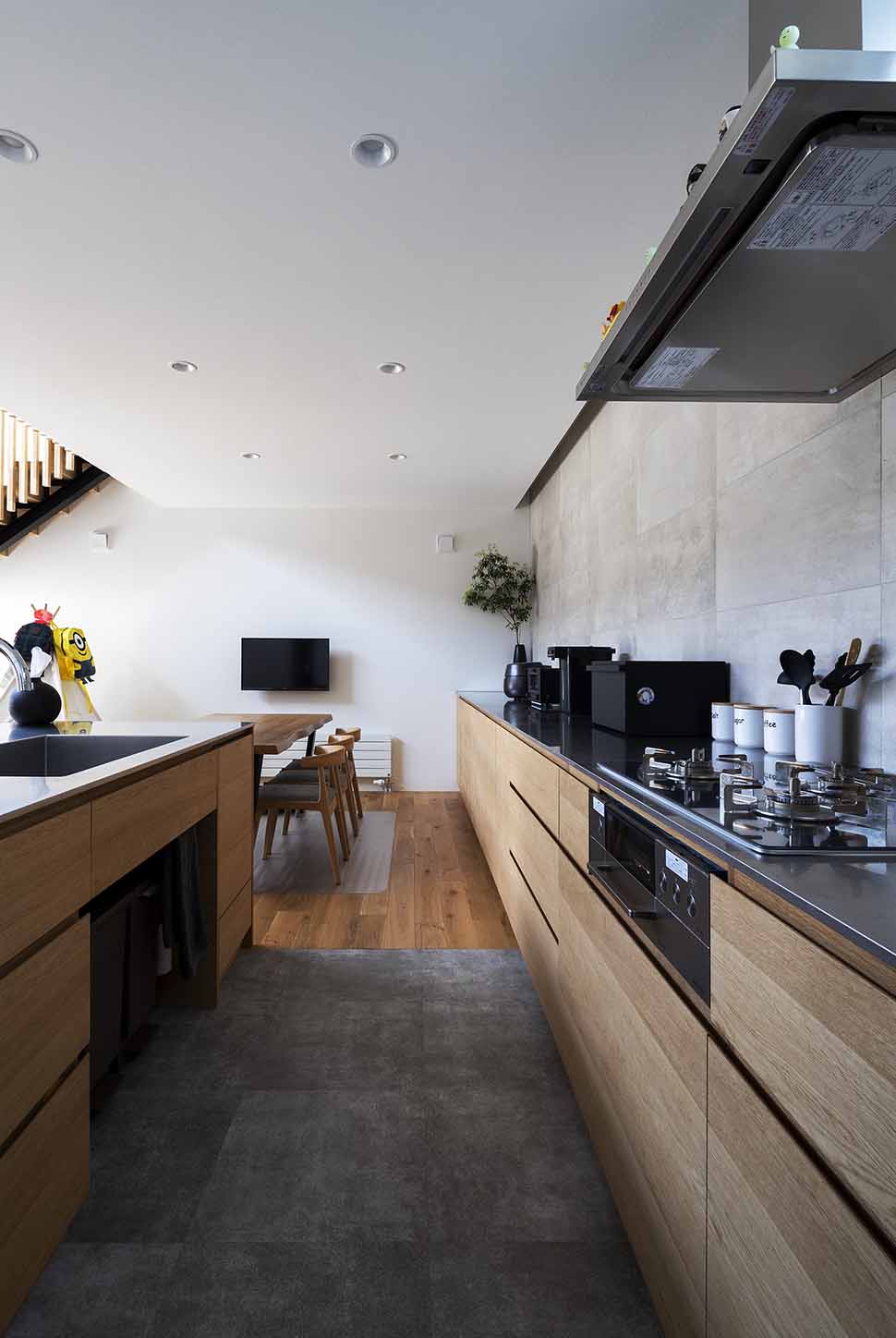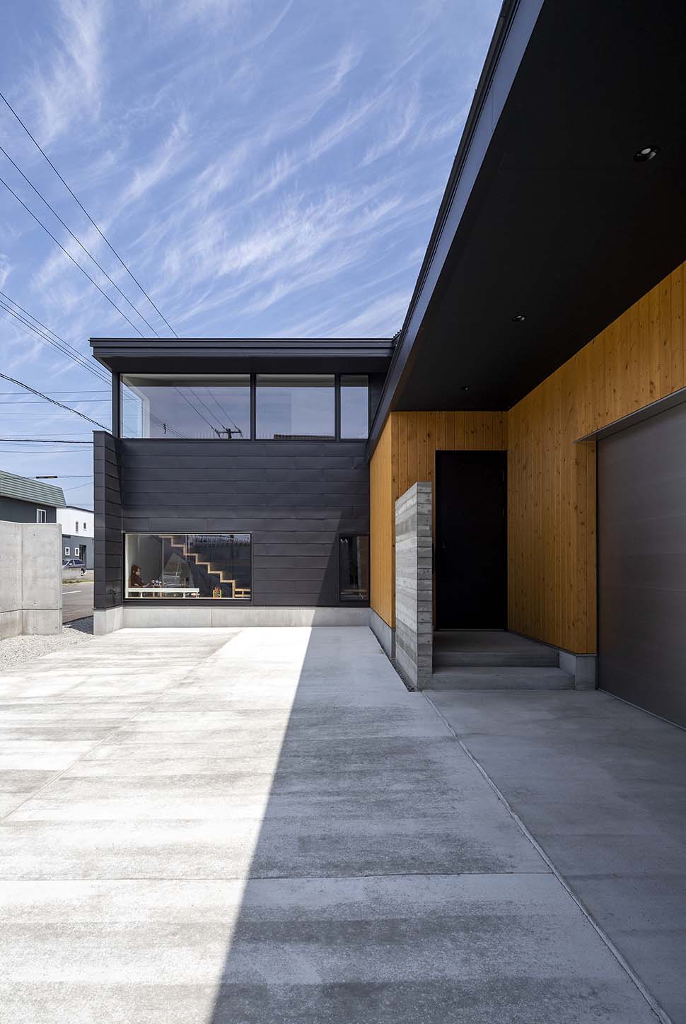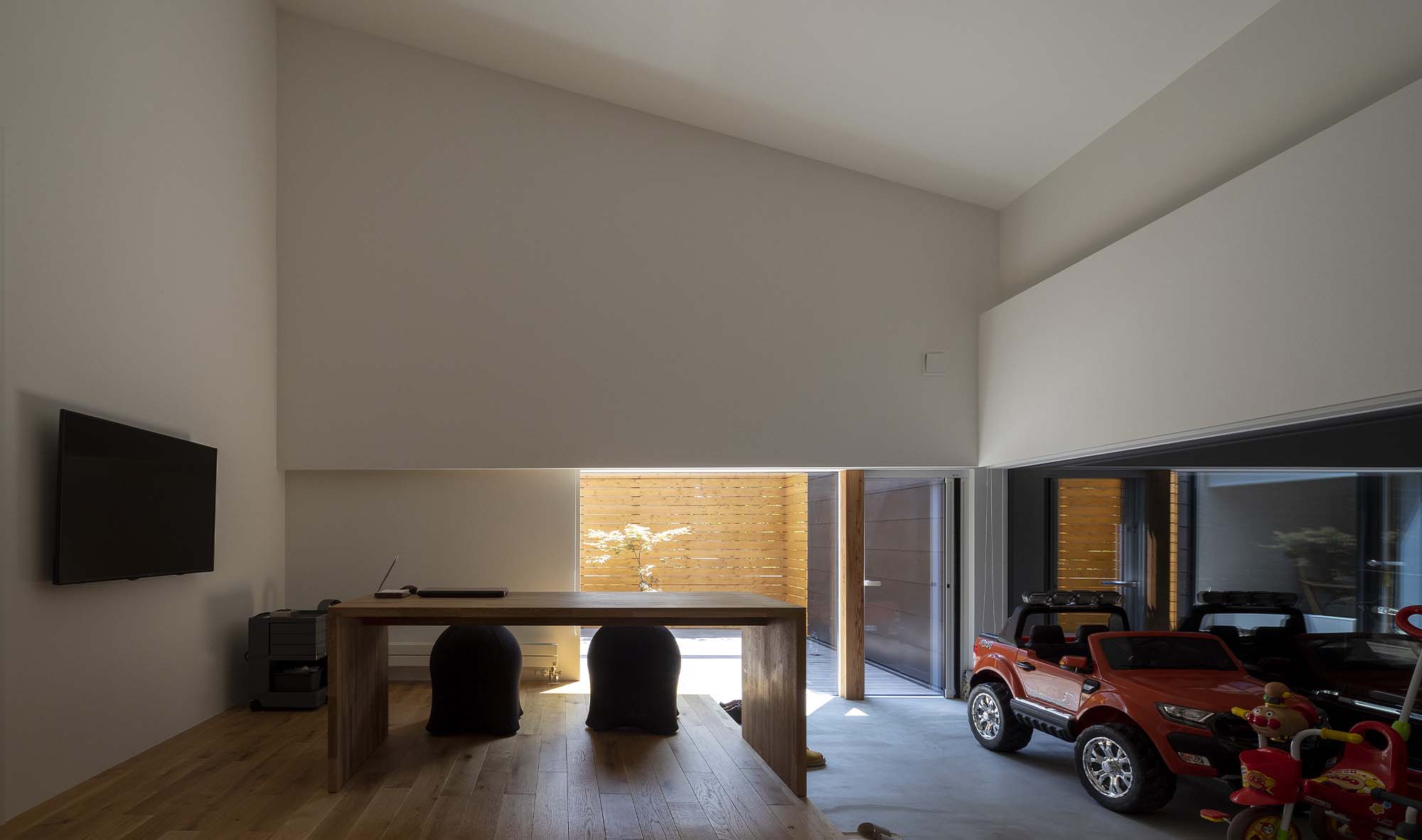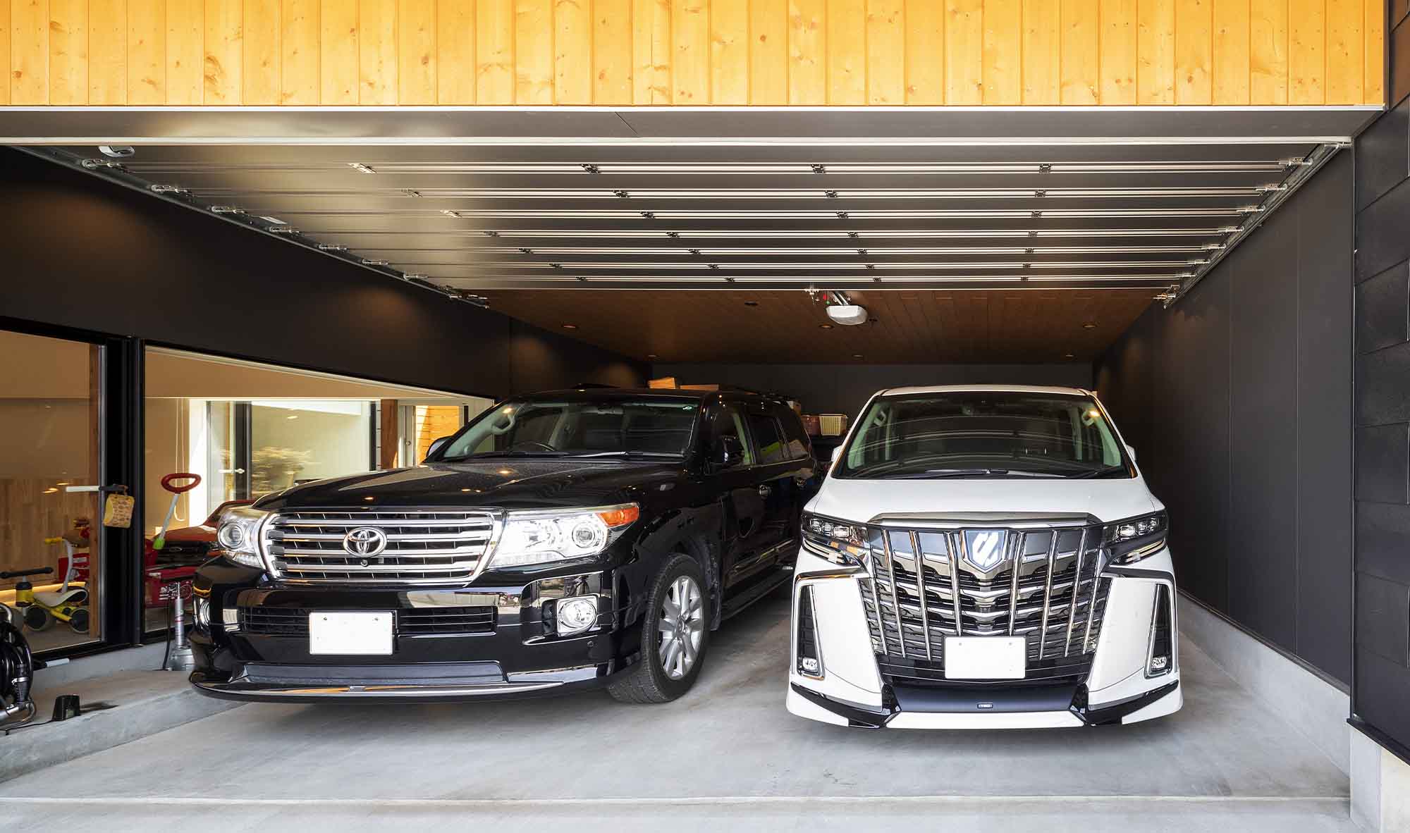 外観はガルバリウムと木の融合で、シャープな表情にやわらかな印象も滲む。 同時に複数の車の出し入れも可能なガレージ前と1枚のアルミシャッター。 玄関を入ると右手に仕事場がありながら、生活の場であるリビングダイニングもちらりと見える。繋がるように広がっていく、まさにオープンな空間。 天井高、開口部、採光と生活スペースのレイアウトバランスがよいため、広々とゆったりした感覚に包まれる。2階には客間兼和室、寝室と子ども部屋そしてクローゼット。なおかつ「キッチンから洗濯、お風呂、手洗いそしてリビングへの動線など、とても暮らしやすいです」と奥様。