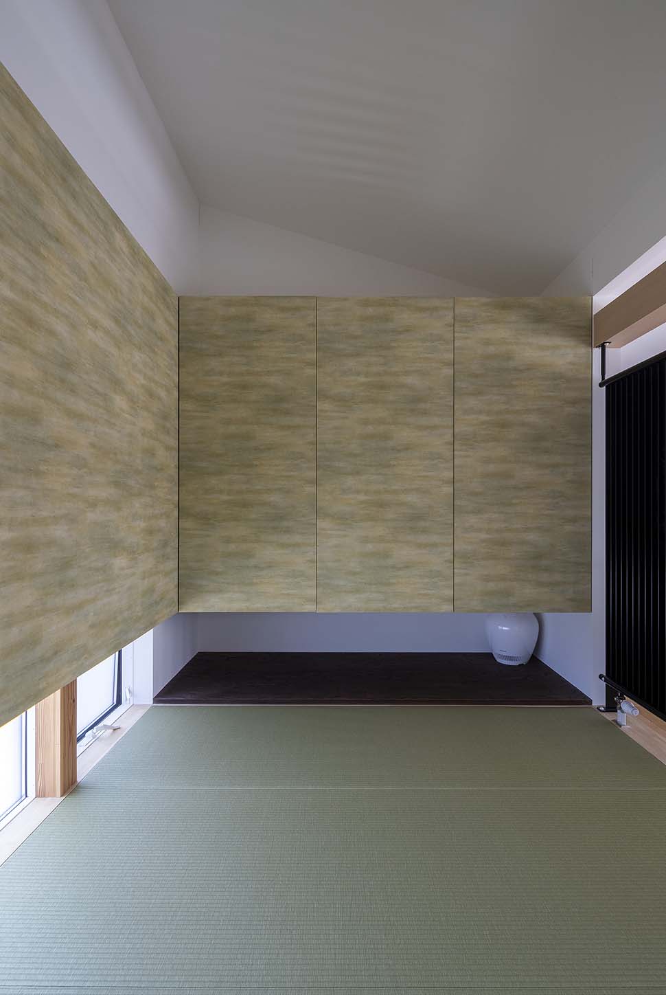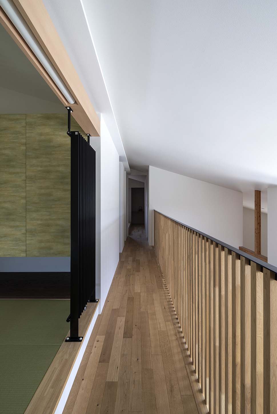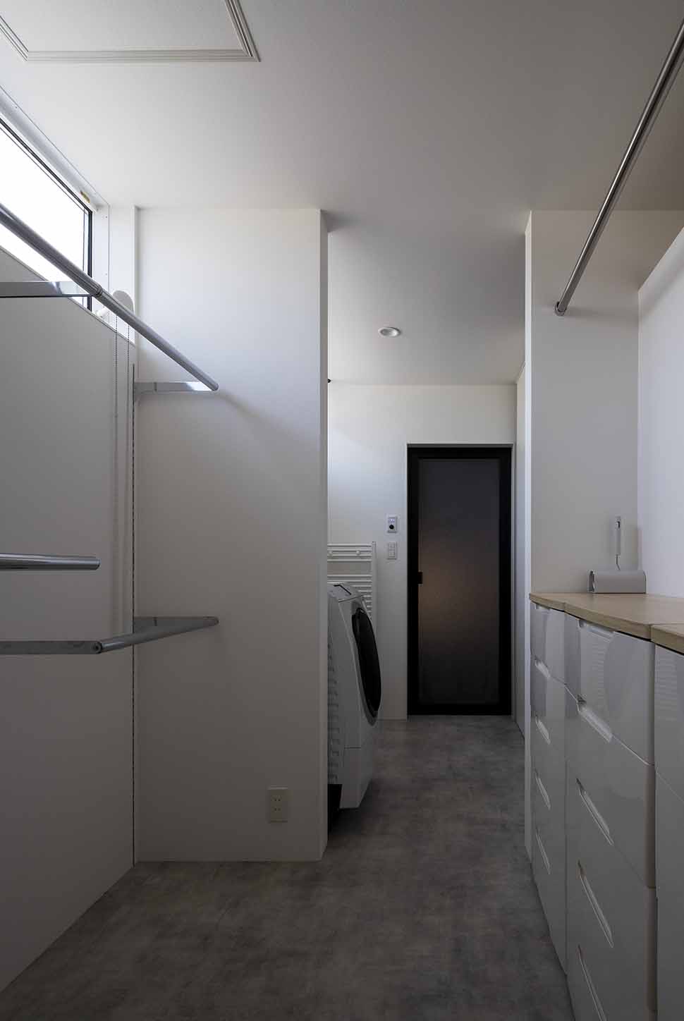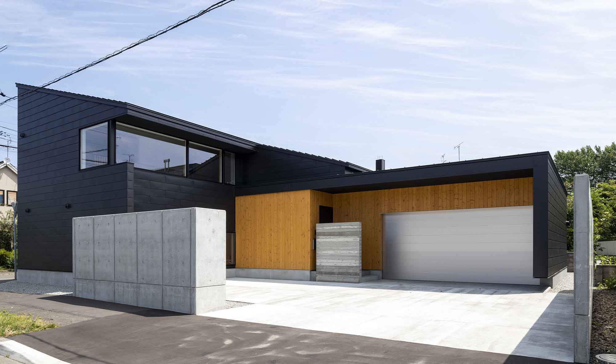 外観はガルバリウムと木の融合で、シャープな表情にやわらかな印象も滲む。 同時に複数の車の出し入れも可能なガレージ前と1枚のアルミシャッター。 玄関を入ると右手に仕事場がありながら、生活の場であるリビングダイニングもちらりと見える。繋がるように広がっていく、まさにオープンな空間。 天井高、開口部、採光と生活スペースのレイアウトバランスがよいため、広々とゆったりした感覚に包まれる。2階には客間兼和室、寝室と子ども部屋そしてクローゼット。なおかつ「キッチンから洗濯、お風呂、手洗いそしてリビングへの動線など、とても暮らしやすいです」と奥様。