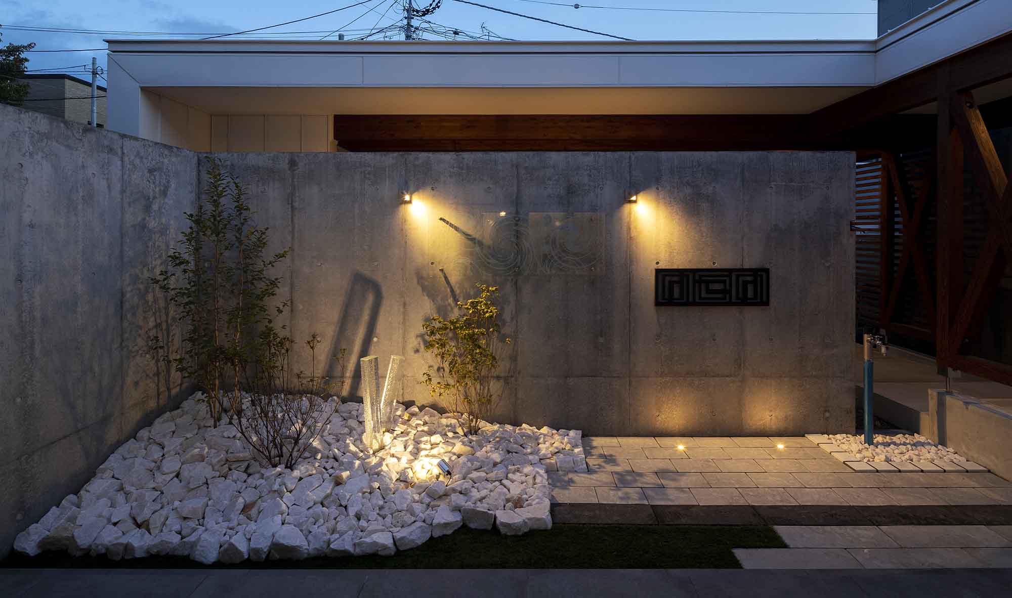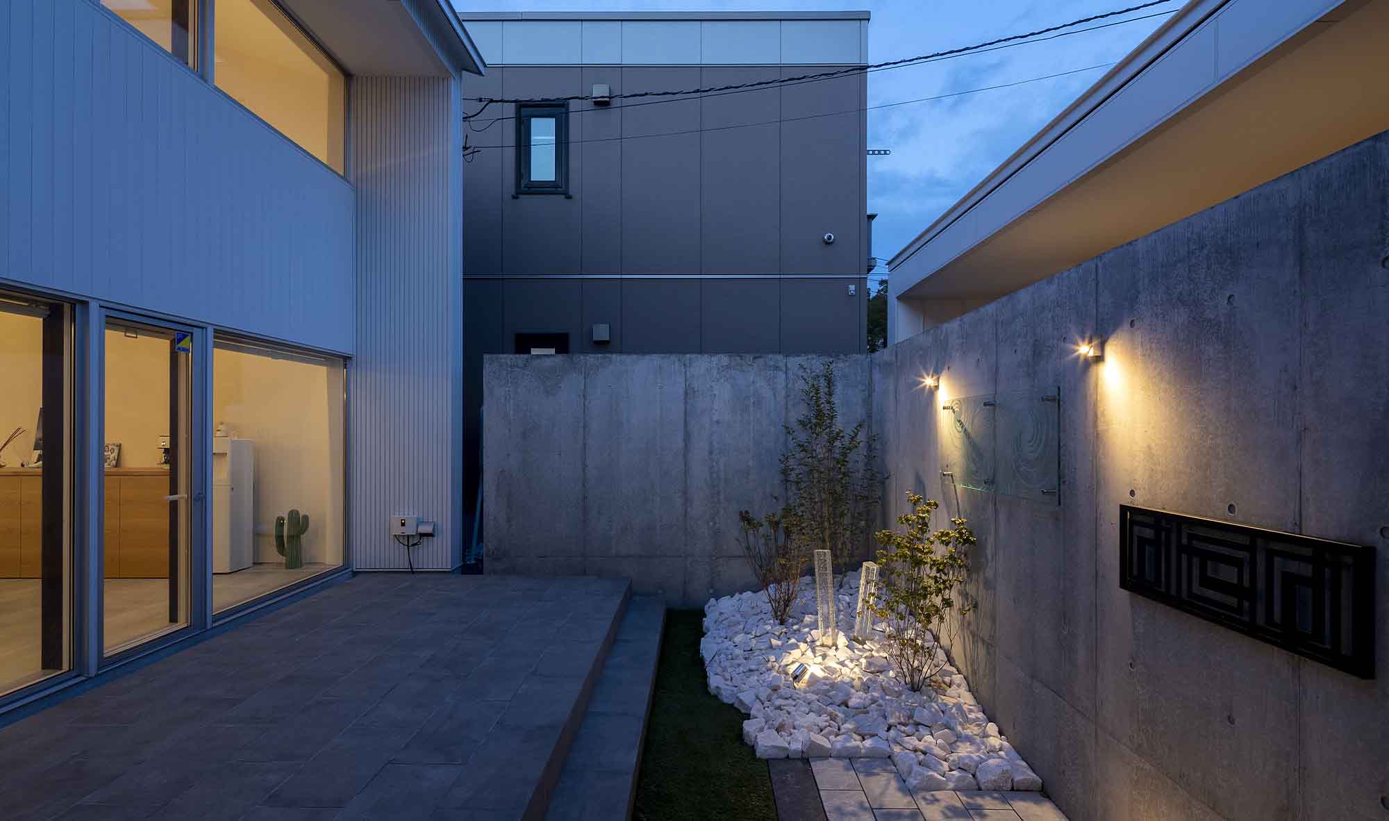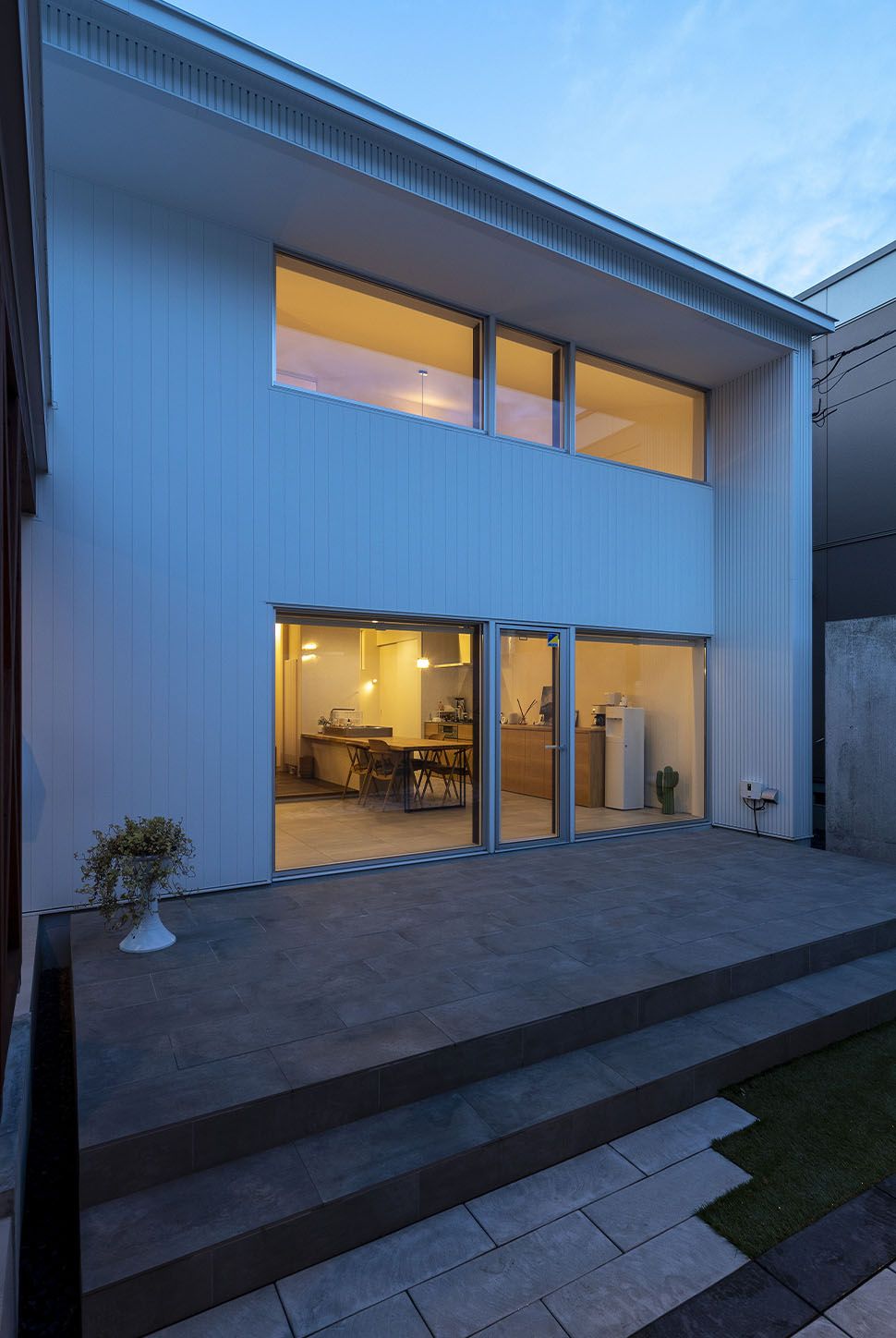 2階の吹き抜けの開口部からは陽が注ぎ、夜は柔らかな光を放つ。開口部とカーポート・塀の関係性によって外部からのプライバシーも保たれ、緑の庭が映えている。