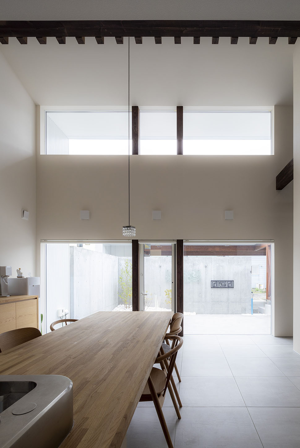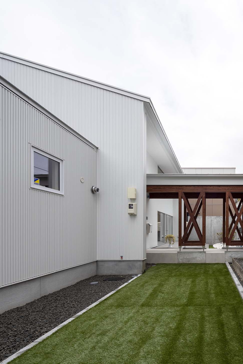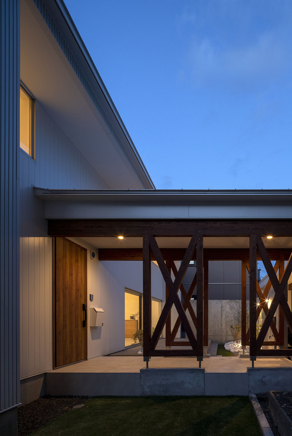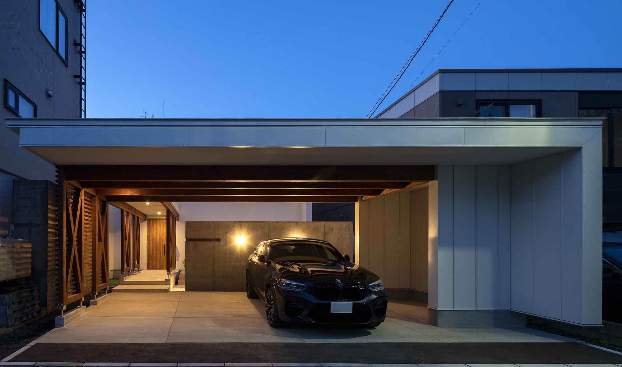 2階の吹き抜けの開口部からは陽が注ぎ、夜は柔らかな光を放つ。開口部とカーポート・塀の関係性によって外部からのプライバシーも保たれ、緑の庭が映えている。