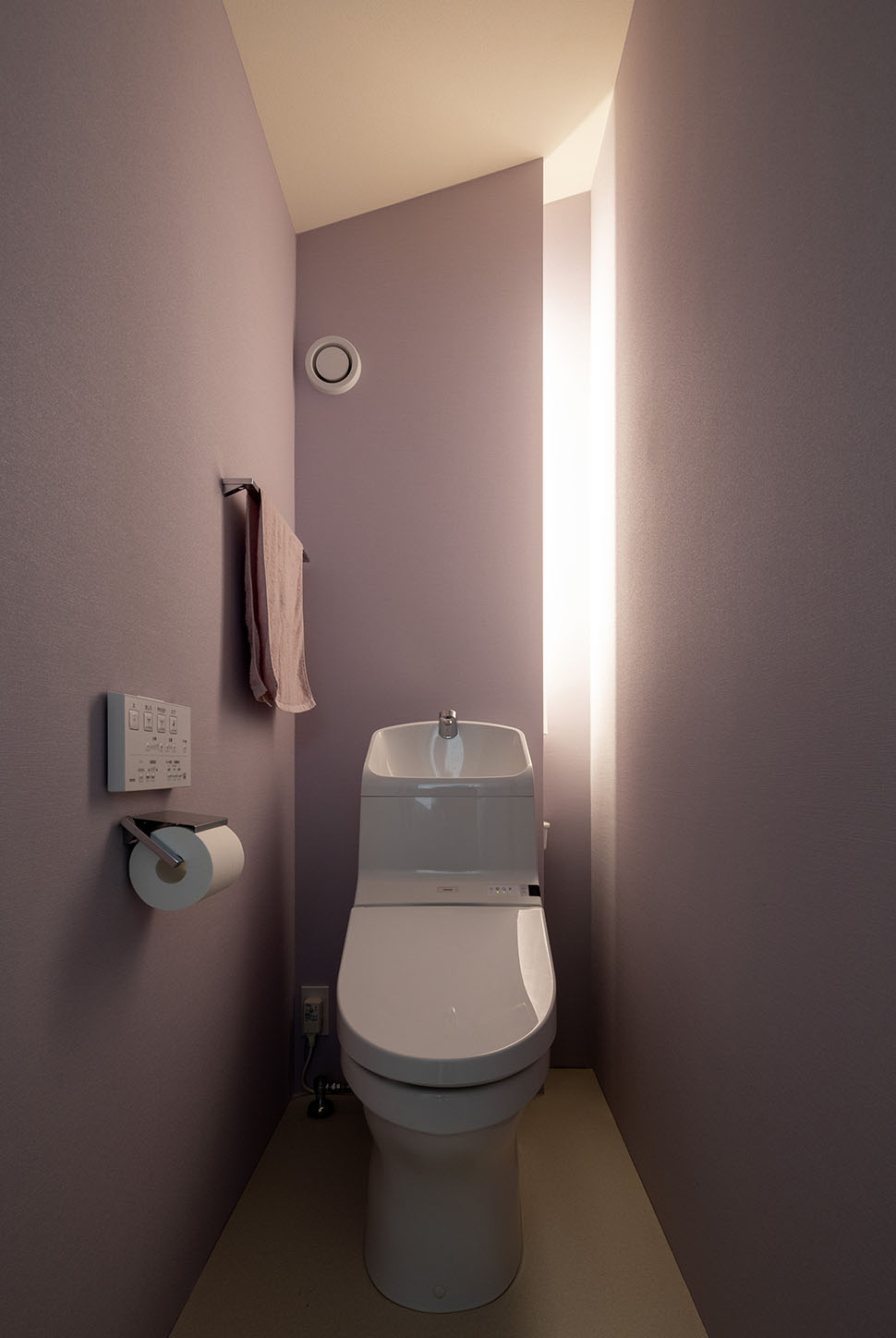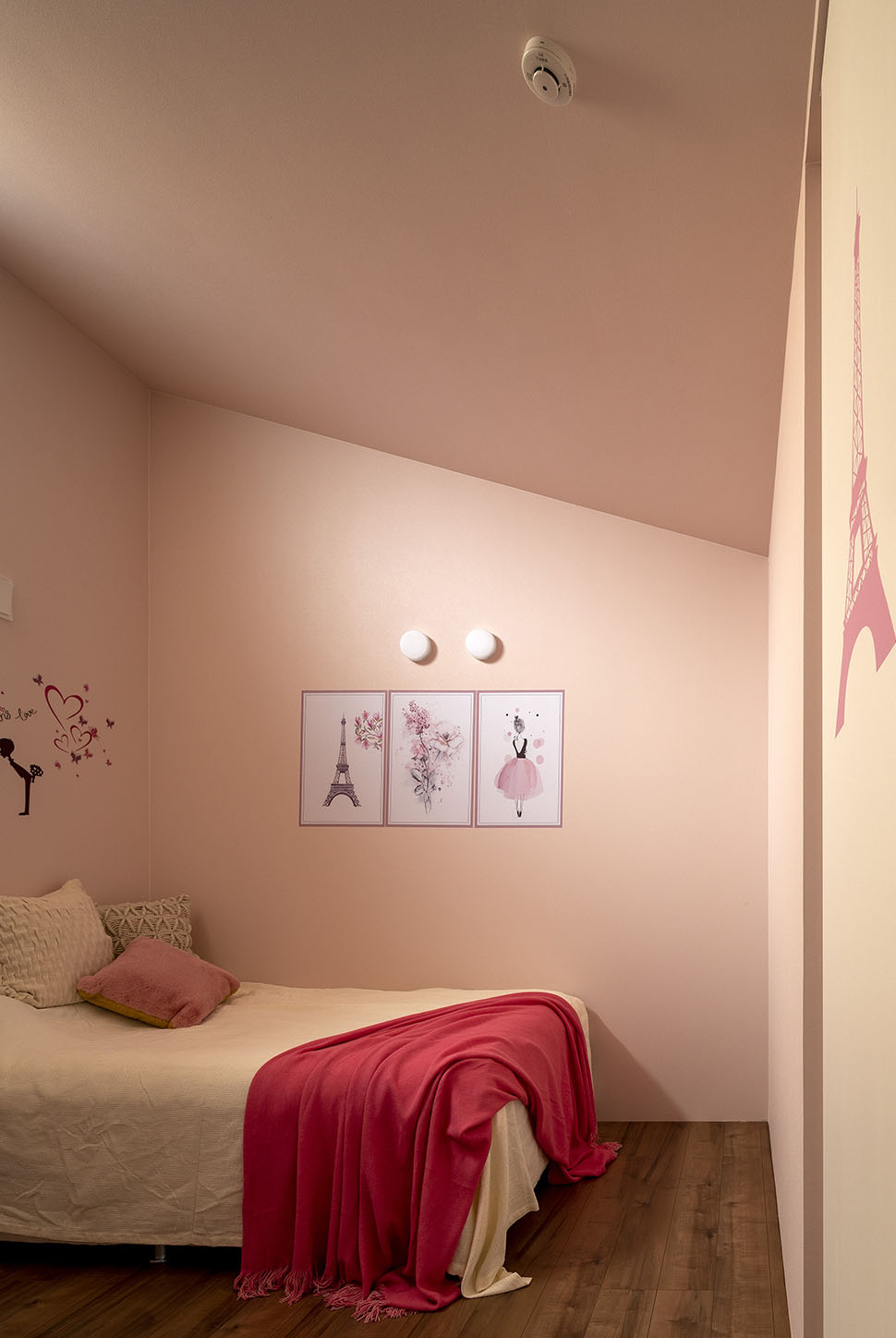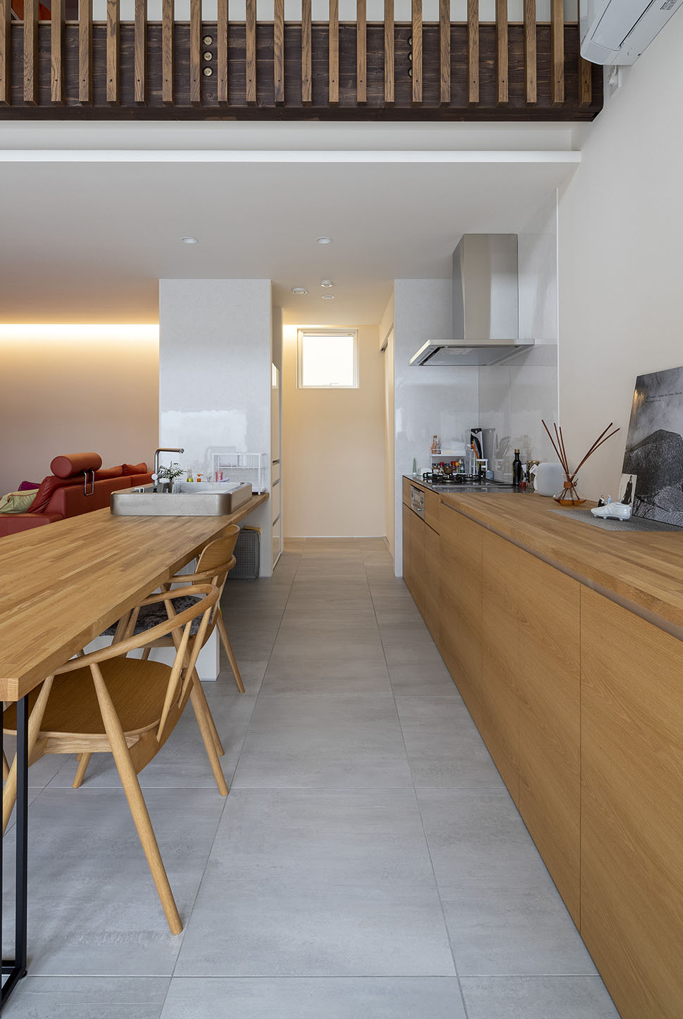1階は生活に必要な調理家電や食器などをキッチン収納に収め、シンプルで落ち着いたパブリックな空間に。2階は1階よりも色のついたカラートーンでプライベートな居住空間として、2層を空間分離させている。