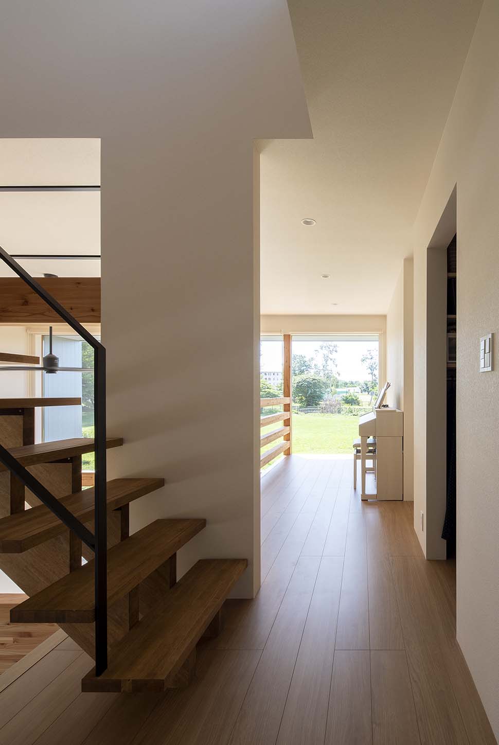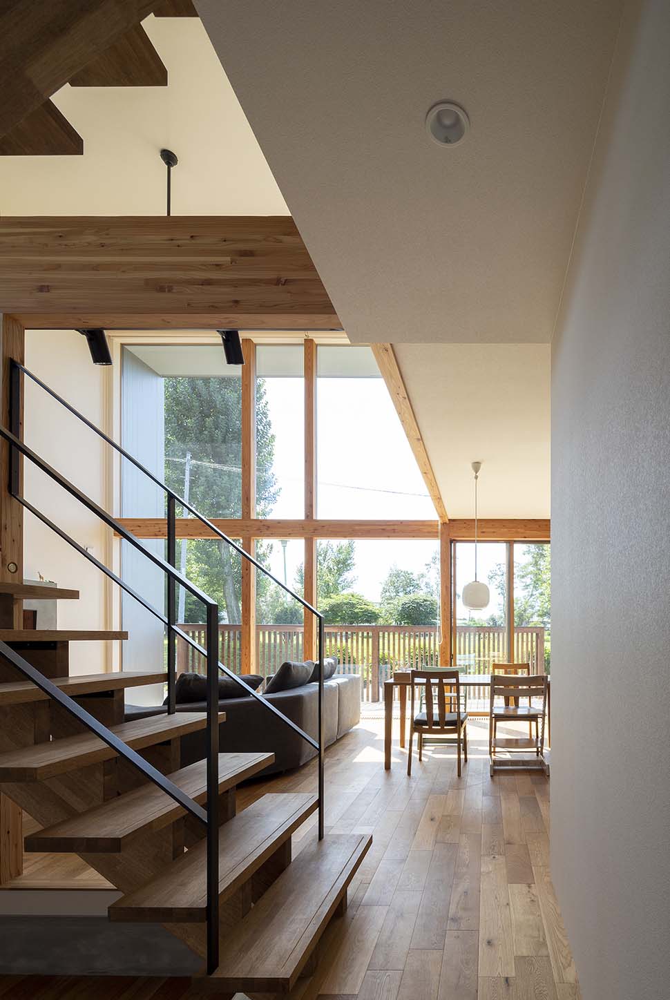 広々とした吹き抜けと大開口からは、溢れんばかりの光が差し込み、気持ちのいい緑が飛び込んでくる。