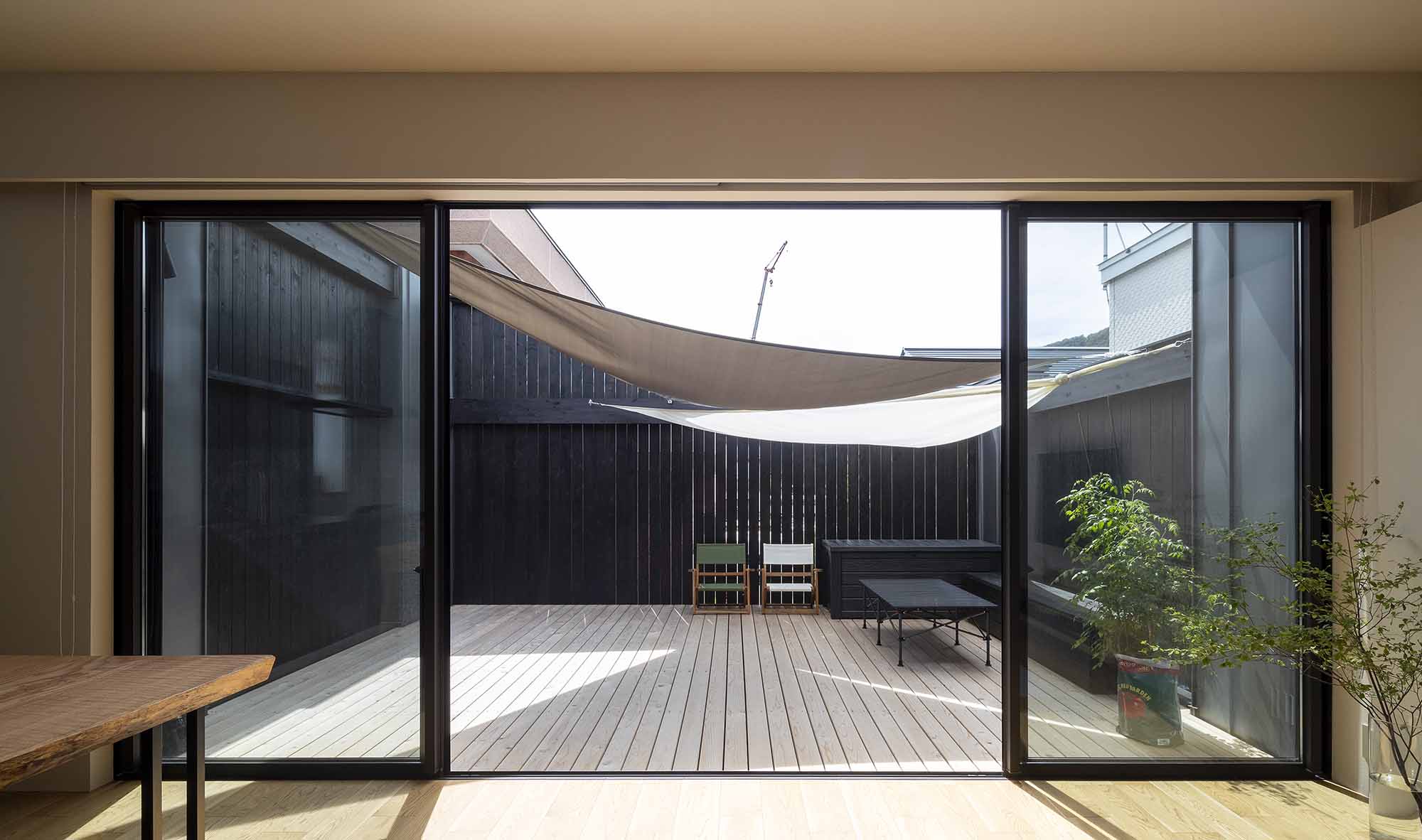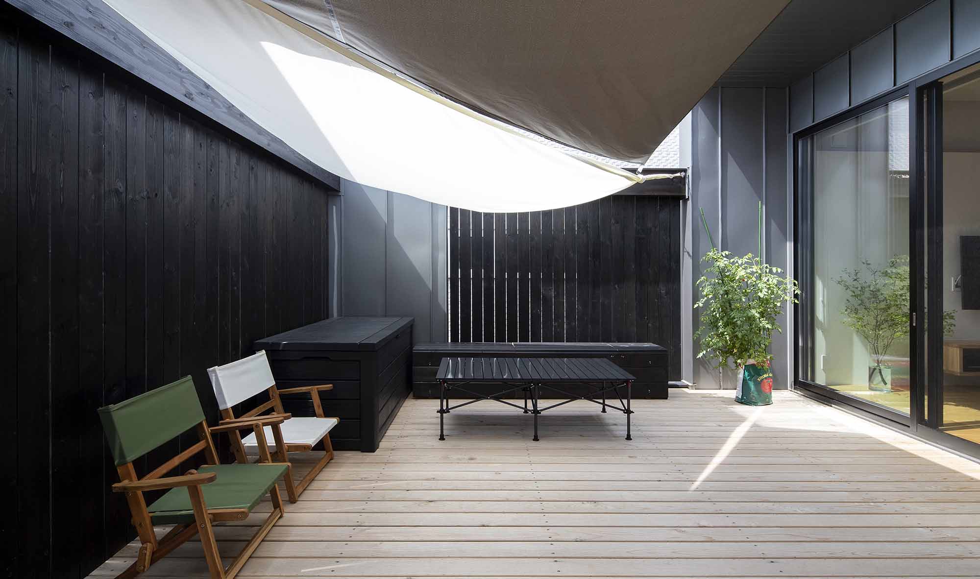 大きなバルコニーテラスはリビングと一体化され、遠くに山も見えて外にいるような感覚に包まれる。しかも外部からのプライバシーにも配慮している。 晴れた日にはパソコン仕事をするご主人と、水遊びの子供たちで賑わっている。