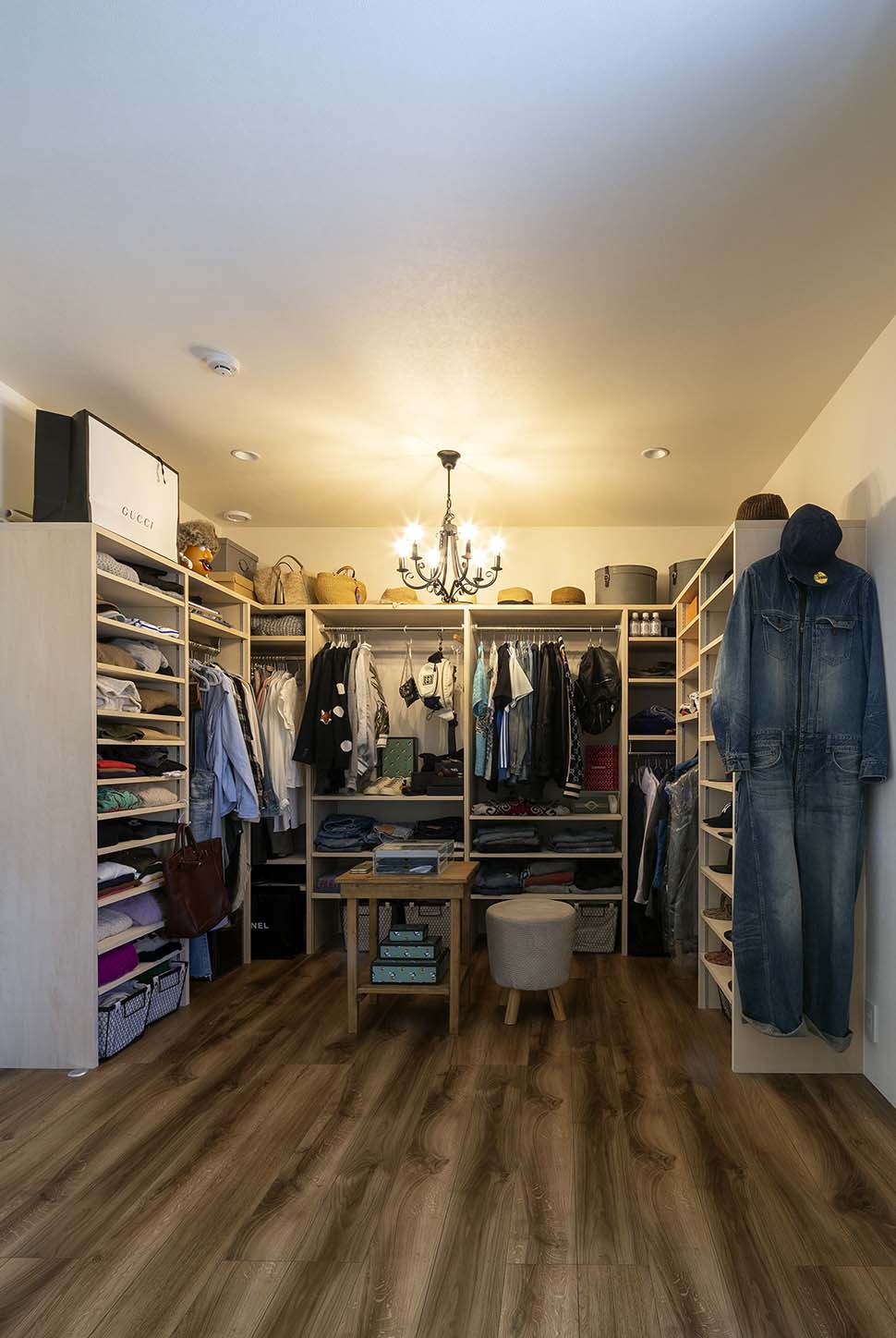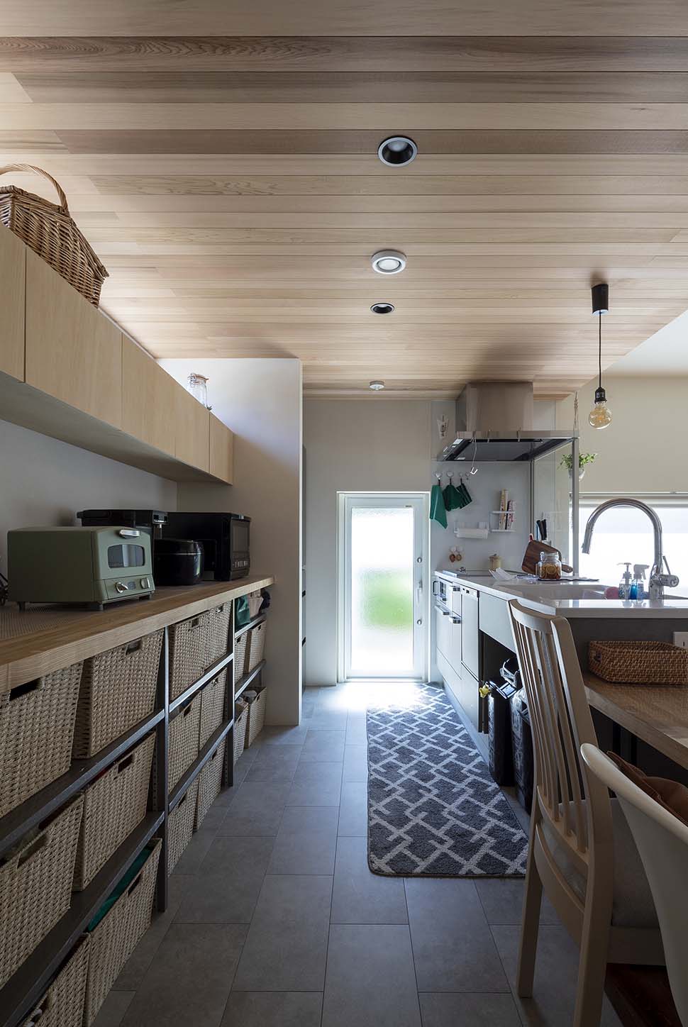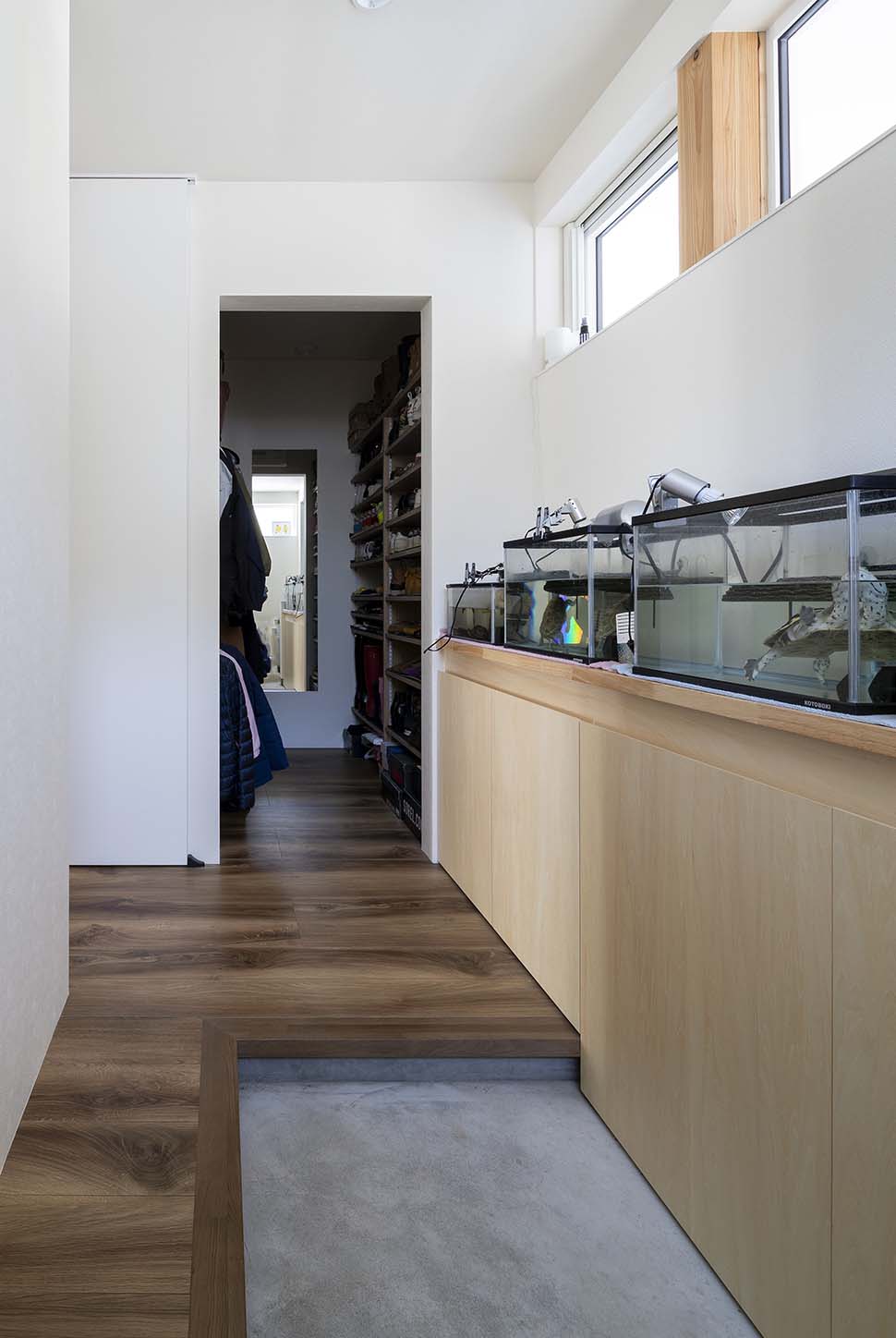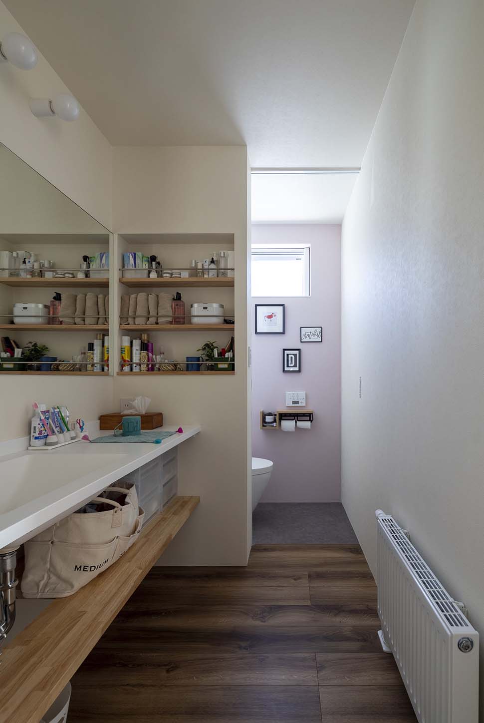 大きな要望は2つ。脱衣所を広くとって欲しい、1階に生活機能のほとんどを納めたいということ。家族4人の日常生活で起きうる、入浴、着替え、そして洗濯、衣類の収納全てが玄関からの動線に納まっている。