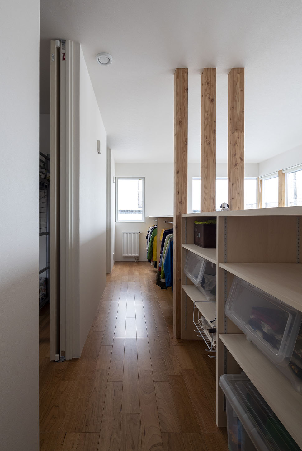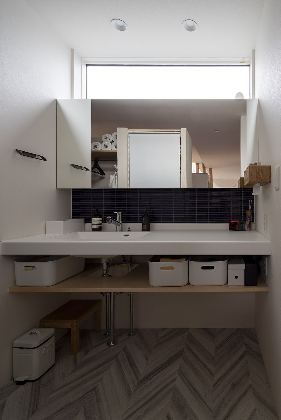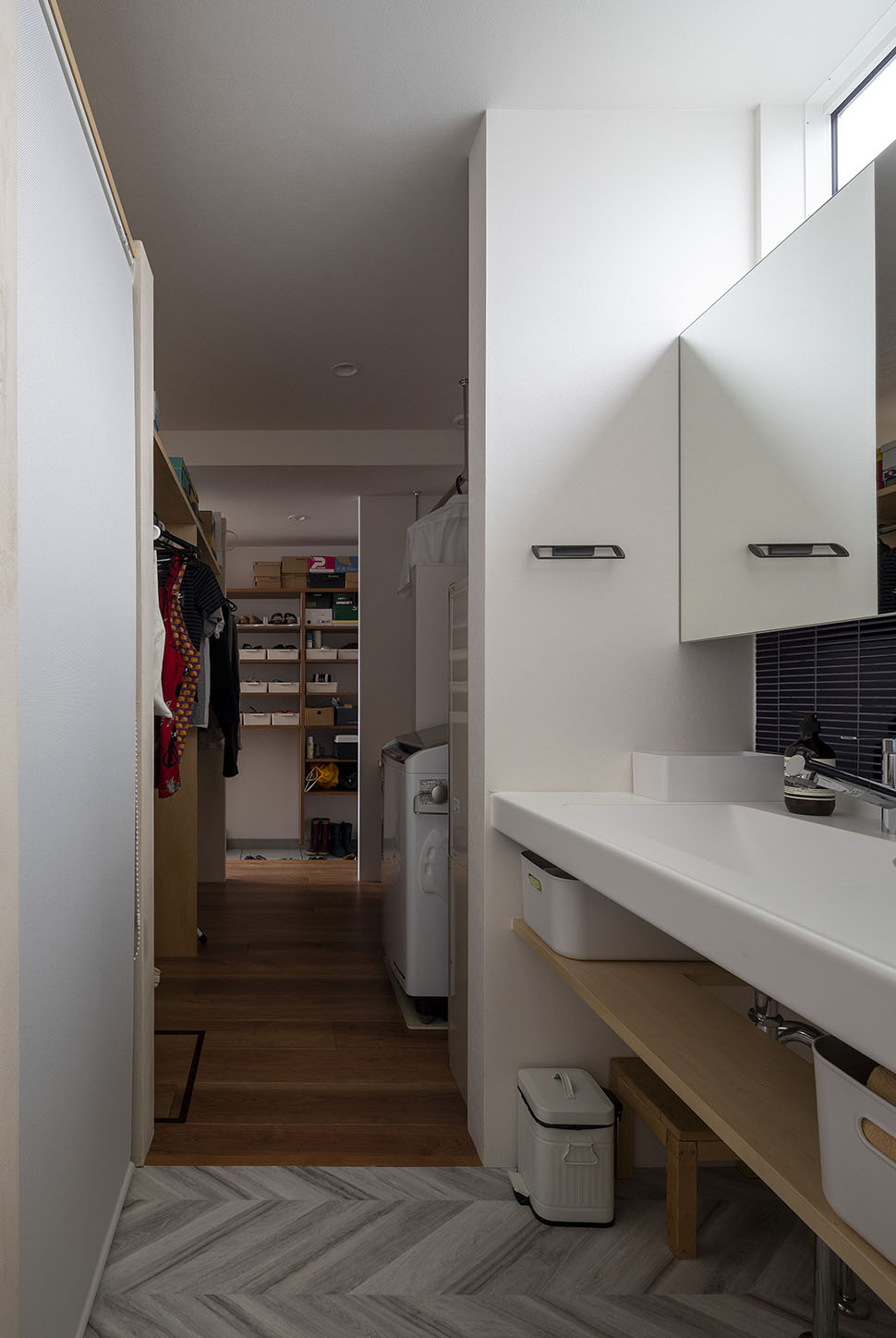 玄関を入ると珪藻土のボードに仕切られて、その向こうはアイロン台、洗濯機、物干し、洗面化粧台が一体となっている。一方でリビングへの動線にもなっており、来客時でもプライベートな空間とは仕切られながらも圧迫感がない。事務用品で使うファィルボックスをハンガーボックスとして活用したり、既製のシェルフの棚と棚の間を利用して小さな物干しに活用するなど、奥様の生活アイディアが随所に見られる。