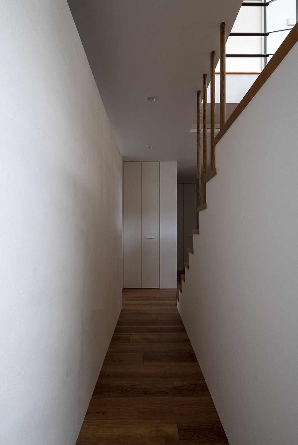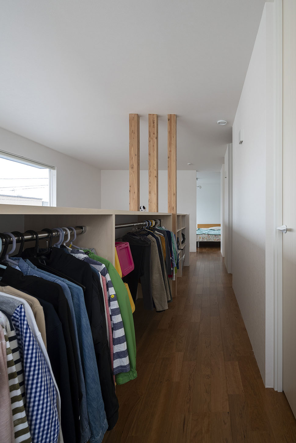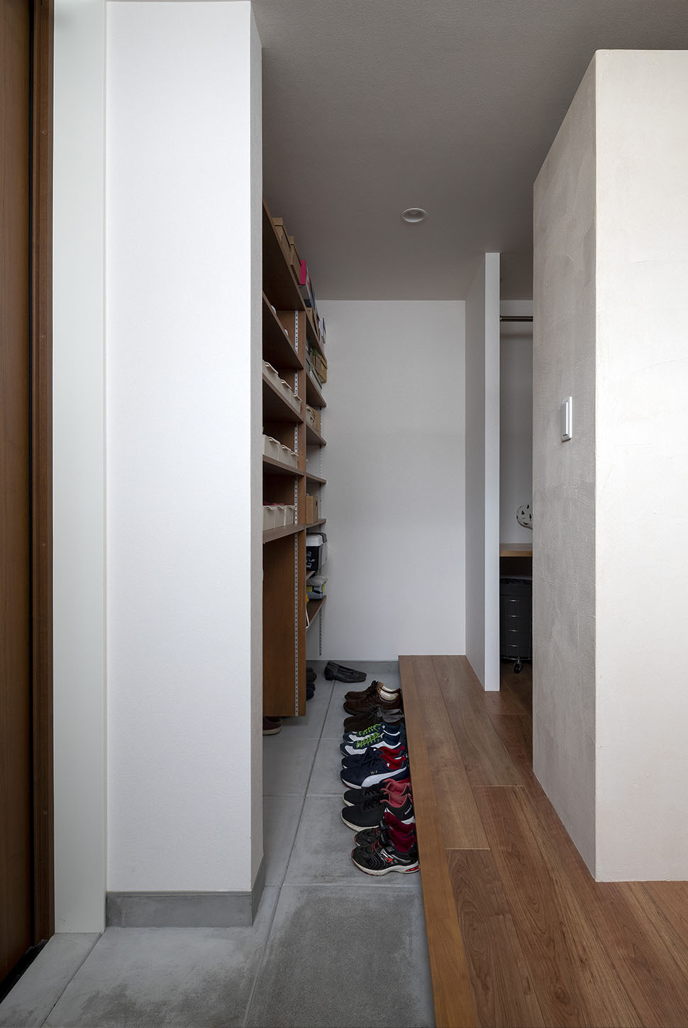 玄関を入ると珪藻土のボードに仕切られて、その向こうはアイロン台、洗濯機、物干し、洗面化粧台が一体となっている。一方でリビングへの動線にもなっており、来客時でもプライベートな空間とは仕切られながらも圧迫感がない。事務用品で使うファィルボックスをハンガーボックスとして活用したり、既製のシェルフの棚と棚の間を利用して小さな物干しに活用するなど、奥様の生活アイディアが随所に見られる。