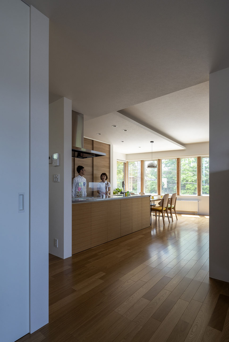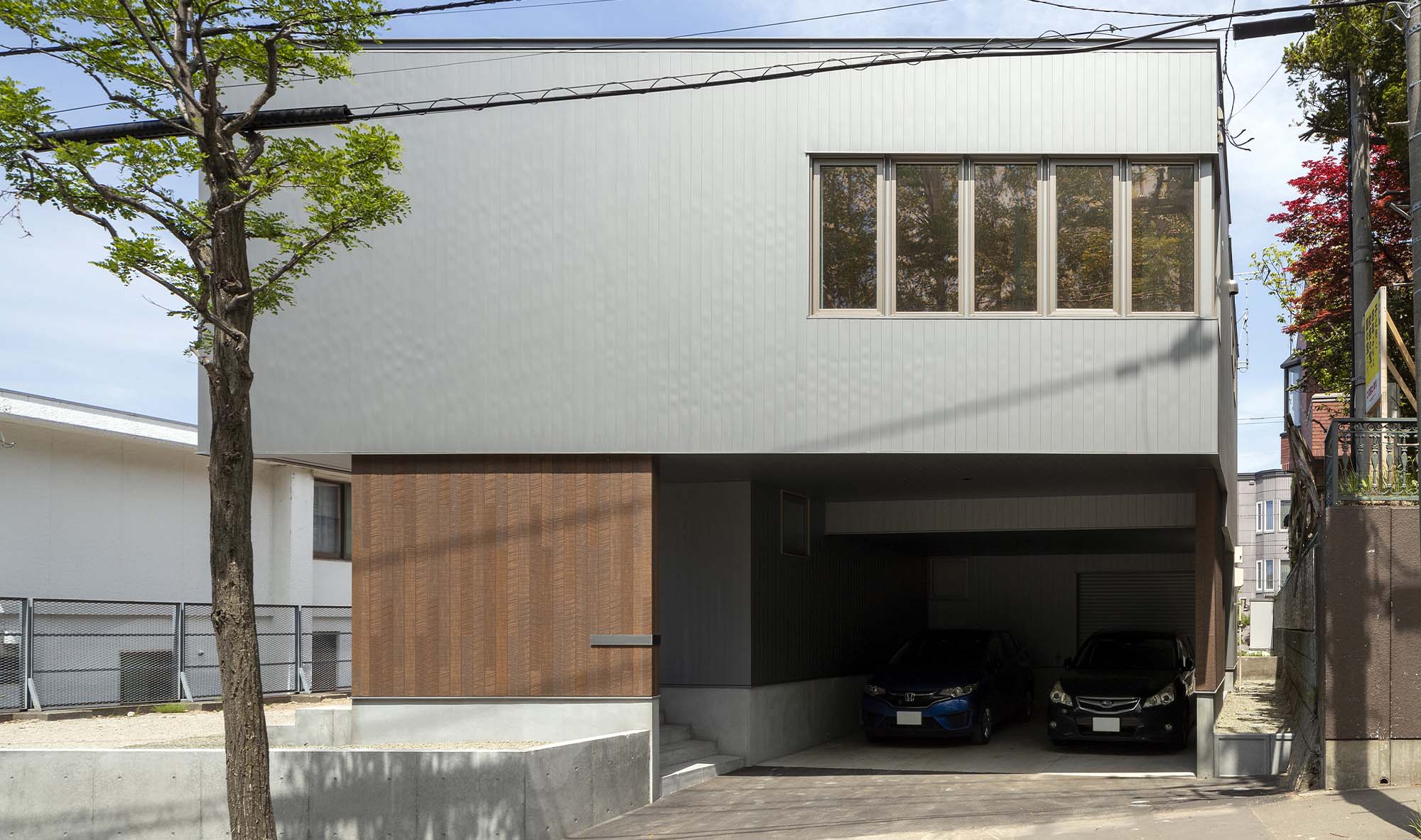 「2人とも働いていますのでカースペースは2台分確保したいと伝えました。当初は縦列駐車案でしたが、変更を重ねて今の並列駐車に。あわせて2階リビング案がベースになると同時に、藻岩山の景色が見える開口部の位置が決まり、全体の骨格が決まっていきました」