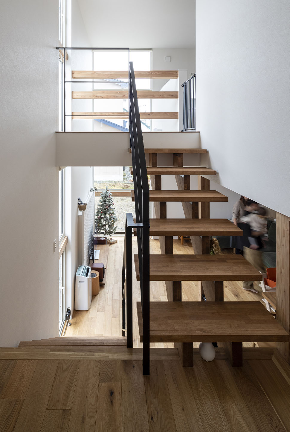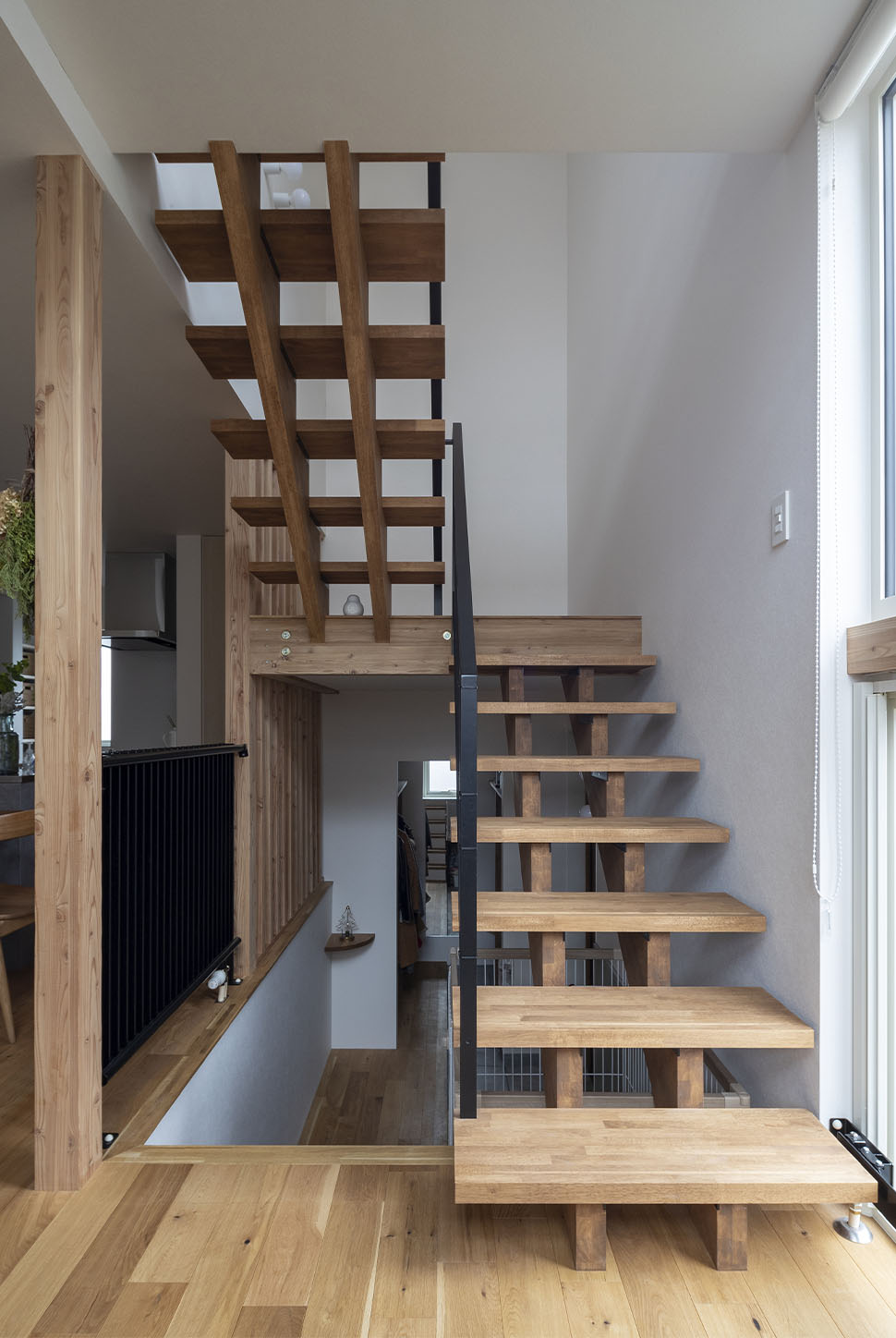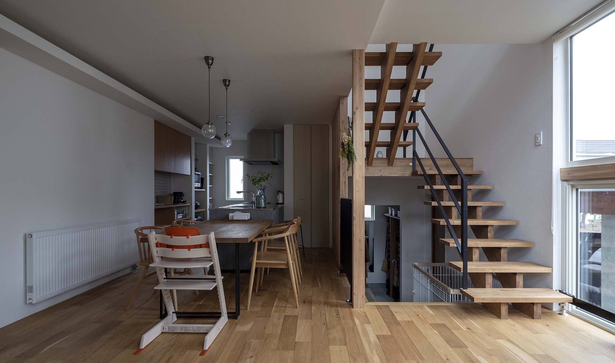 玄関ドアからの階段を抜けると、リビングが広がり、家事動線はバックヤードに収められている。