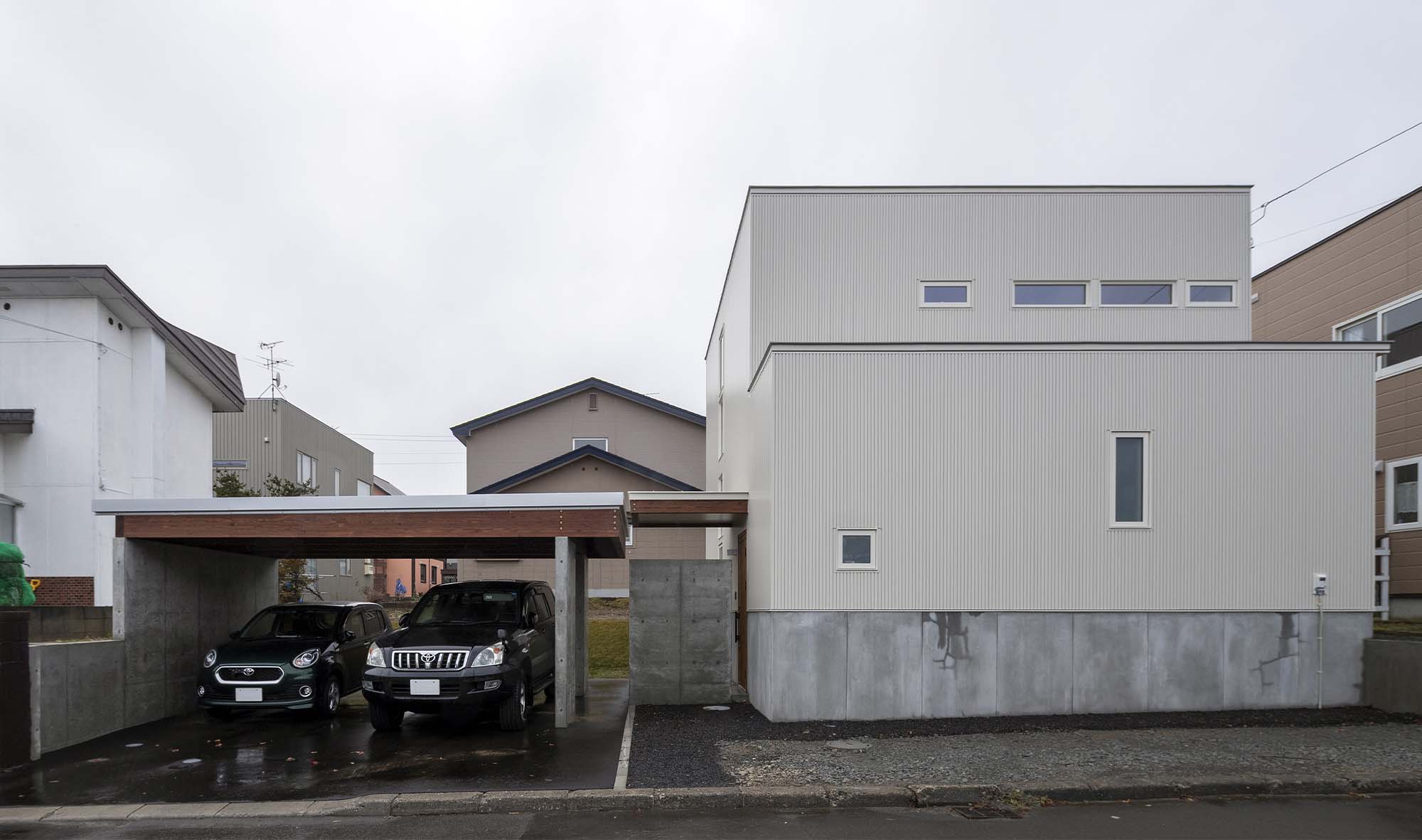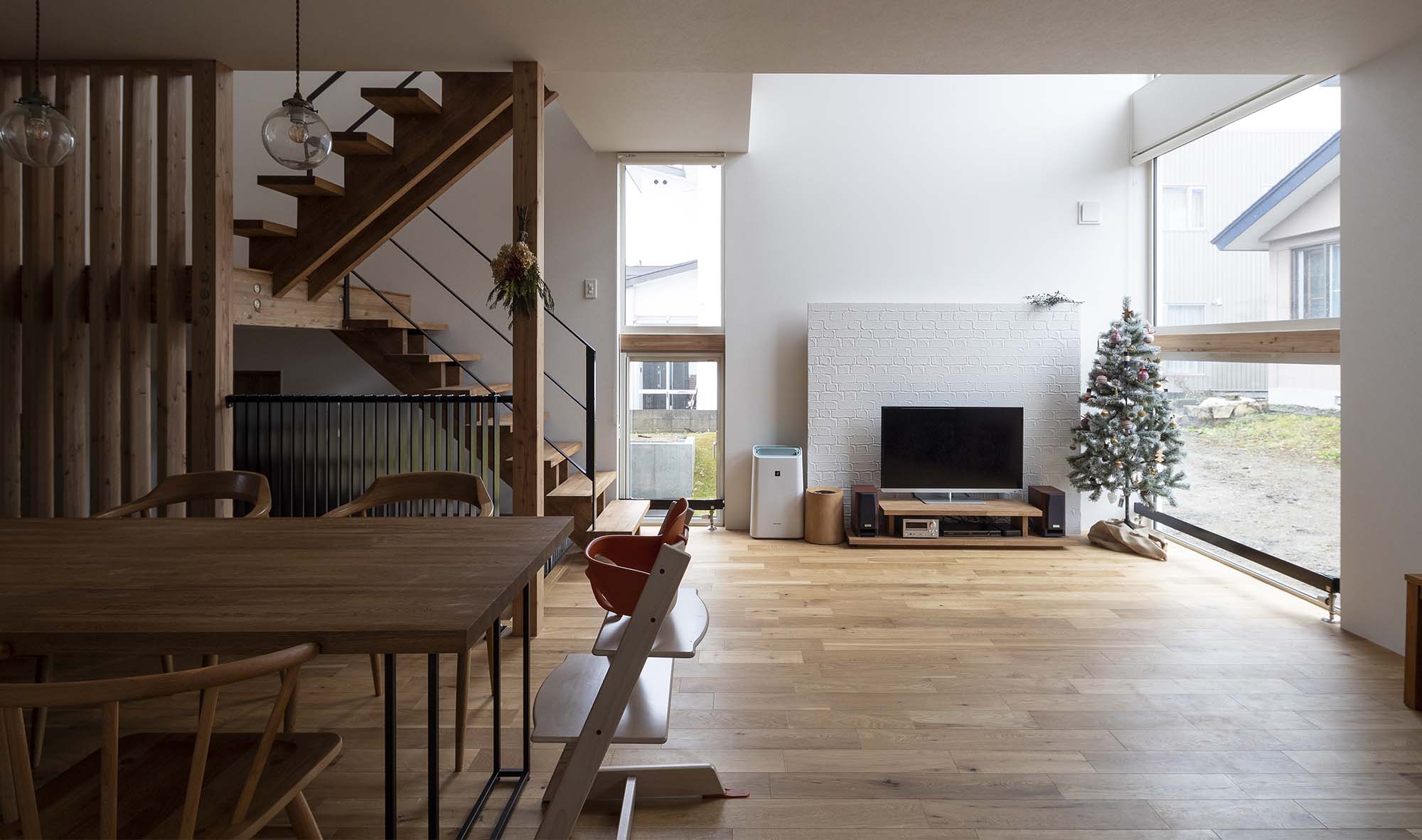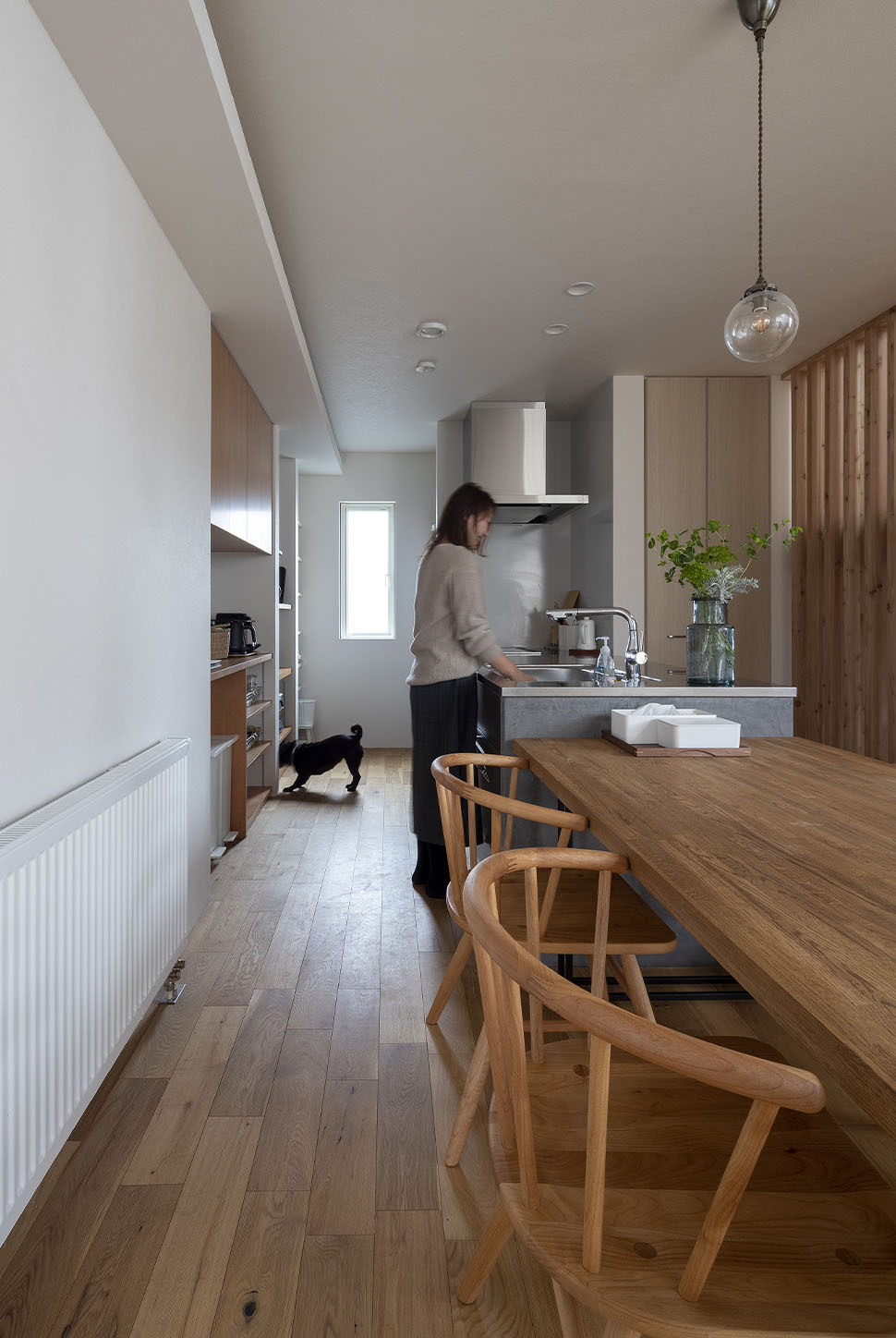 玄関ドアからの階段を抜けると、リビングが広がり、家事動線はバックヤードに収められている。