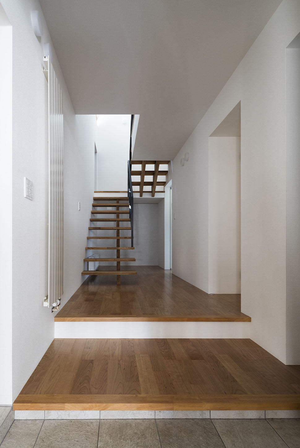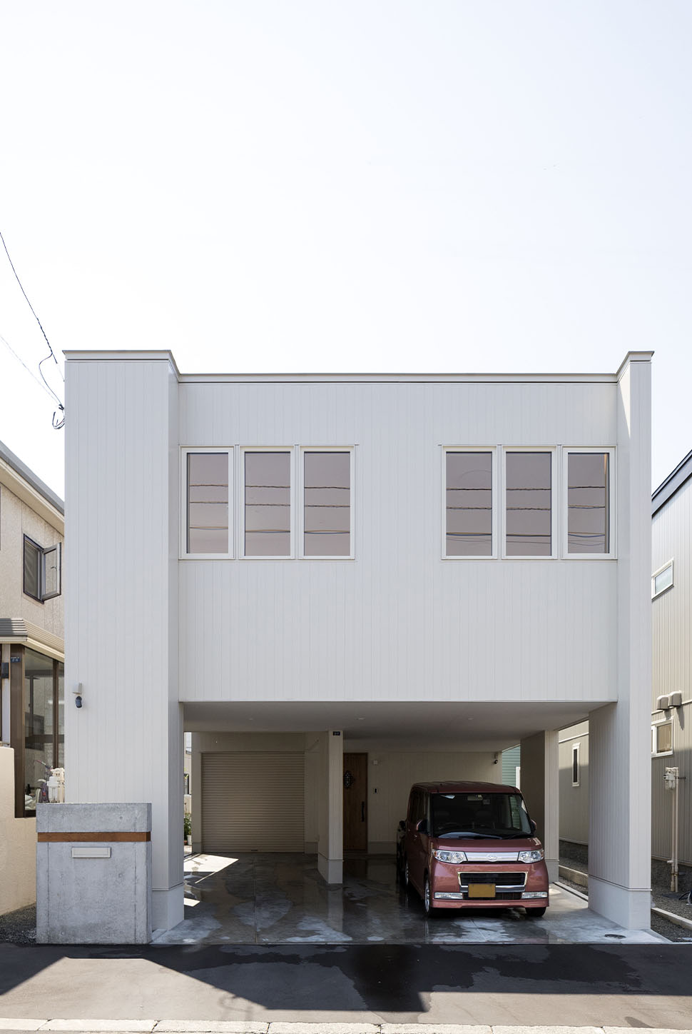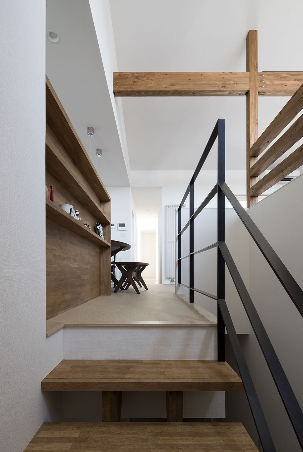 敷地は47坪。それをめいっぱい使うことで、駐車スペースの要望をクリアする。スキップフロアは、生活スタイルにリズムをつくり、食べる場所、くつろぐ場所との曖昧な境界を設けてくれた。持ち物が多いので階段脇に収納蔵をつくりながら、要所要所にも収納スペースを。