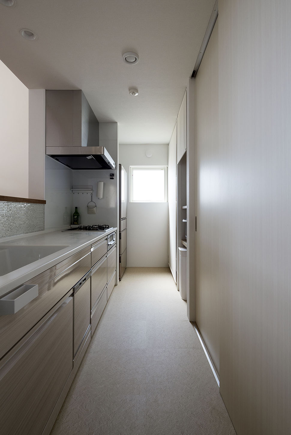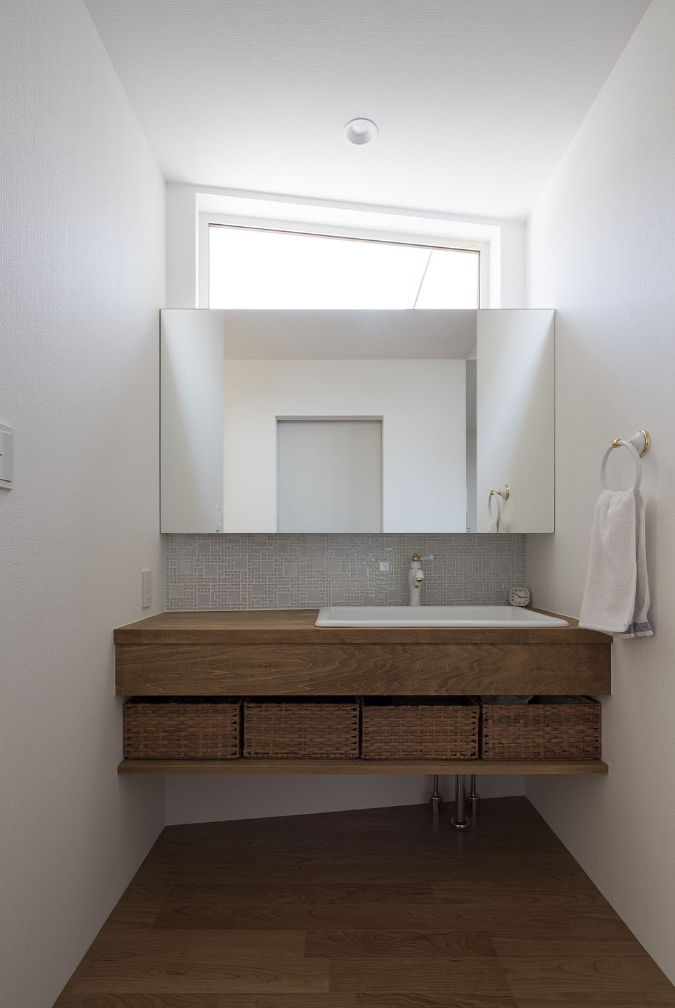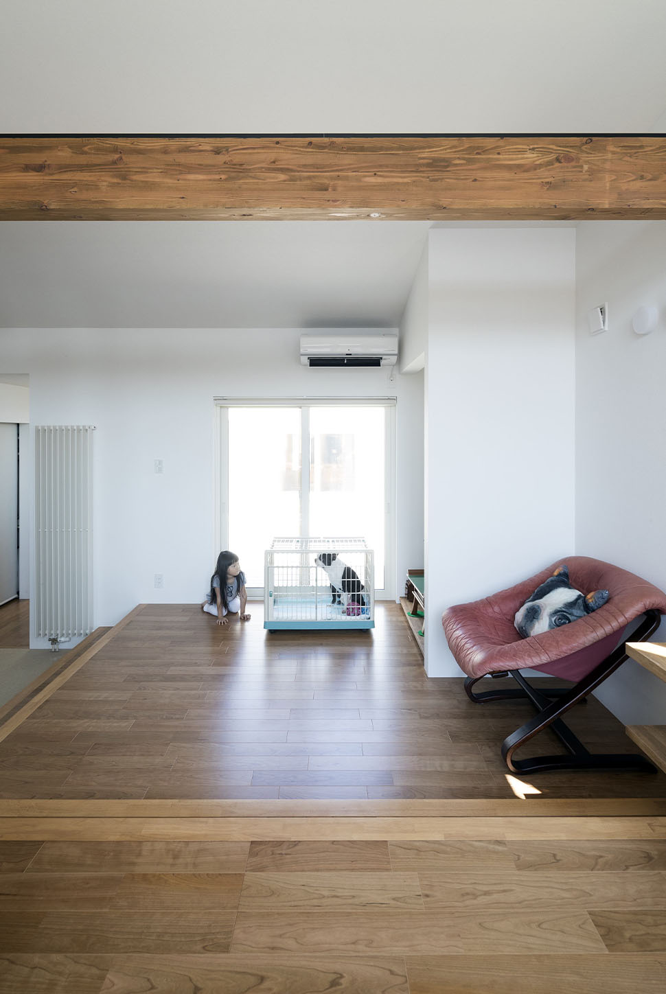 敷地は47坪。それをめいっぱい使うことで、駐車スペースの要望をクリアする。スキップフロアは、生活スタイルにリズムをつくり、食べる場所、くつろぐ場所との曖昧な境界を設けてくれた。持ち物が多いので階段脇に収納蔵をつくりながら、要所要所にも収納スペースを。