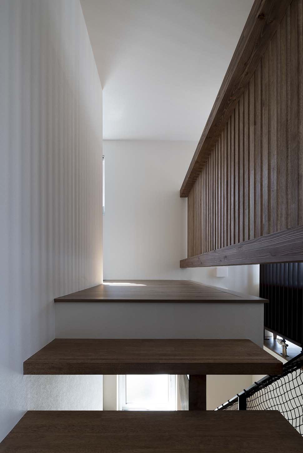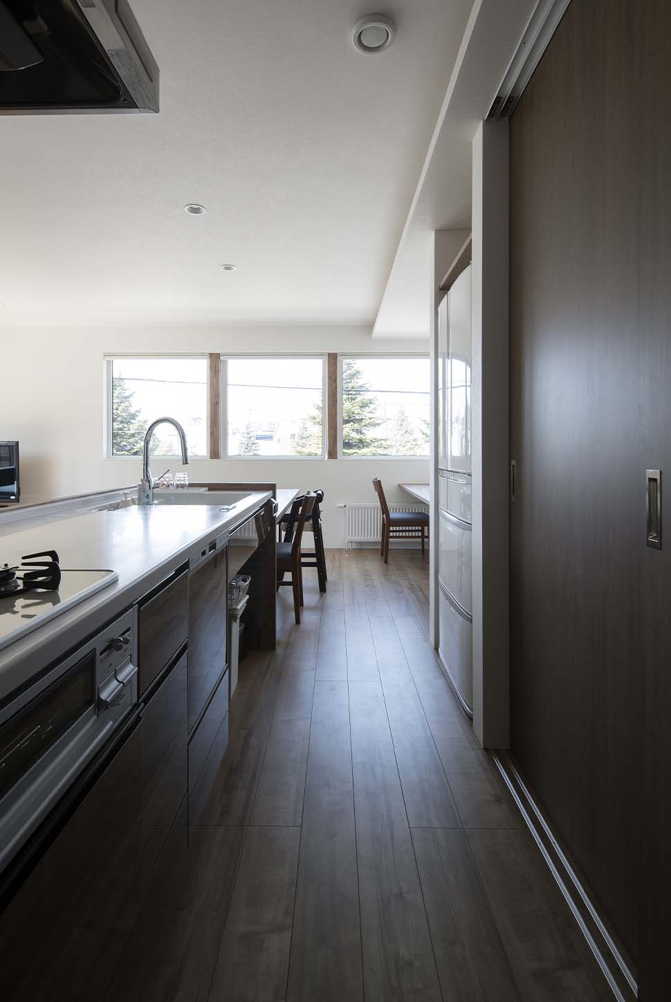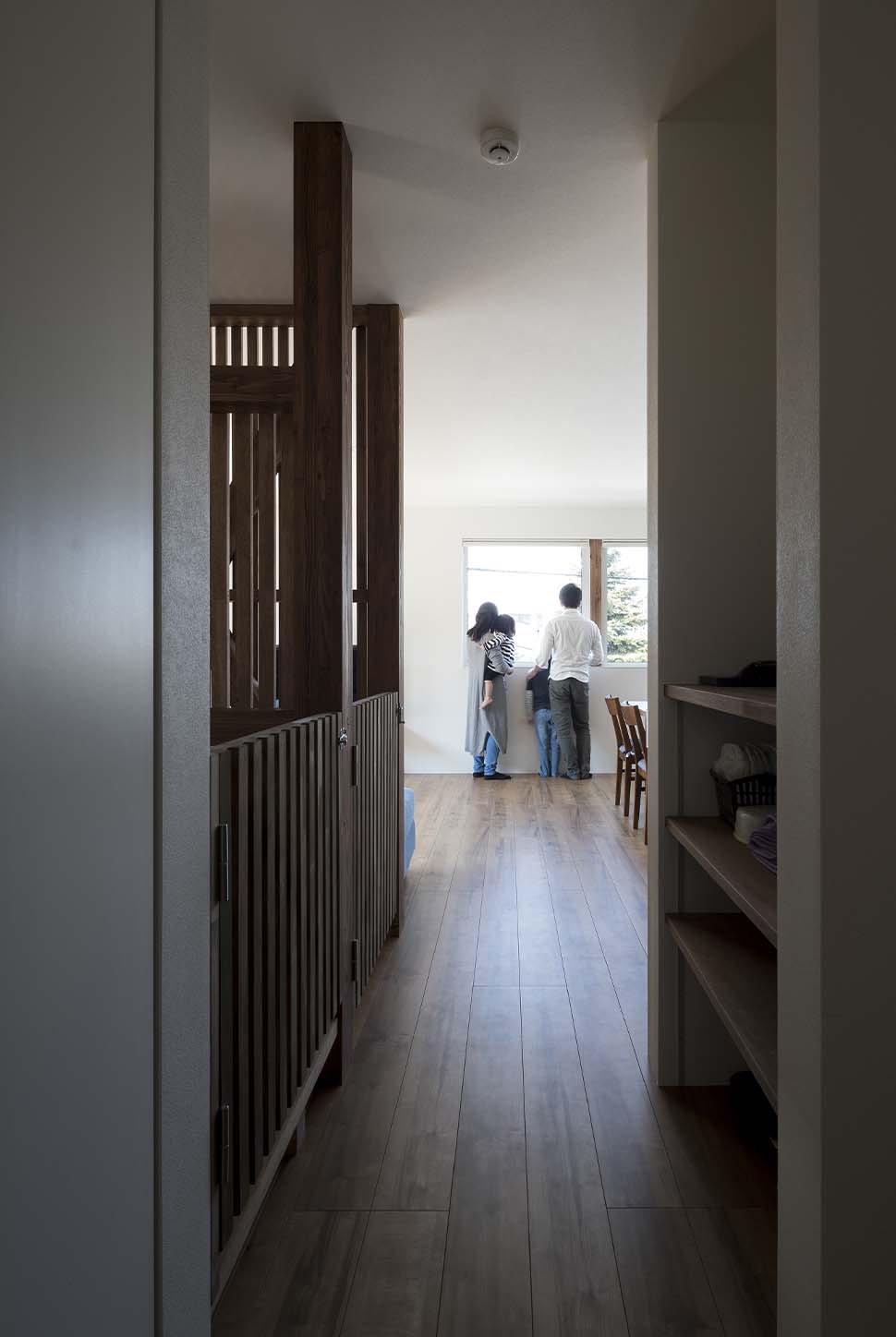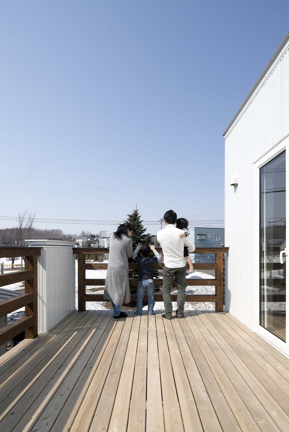 車スペースは2台分の要望の、公園の雪が融ける頃に大活躍するであろうウッドデッキの造作も生み出した。いい佇まいのお家である。