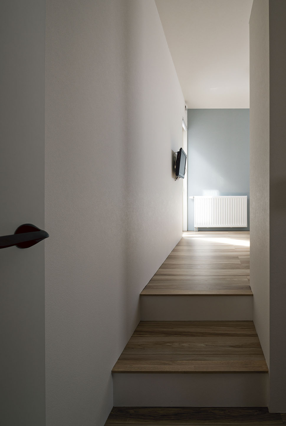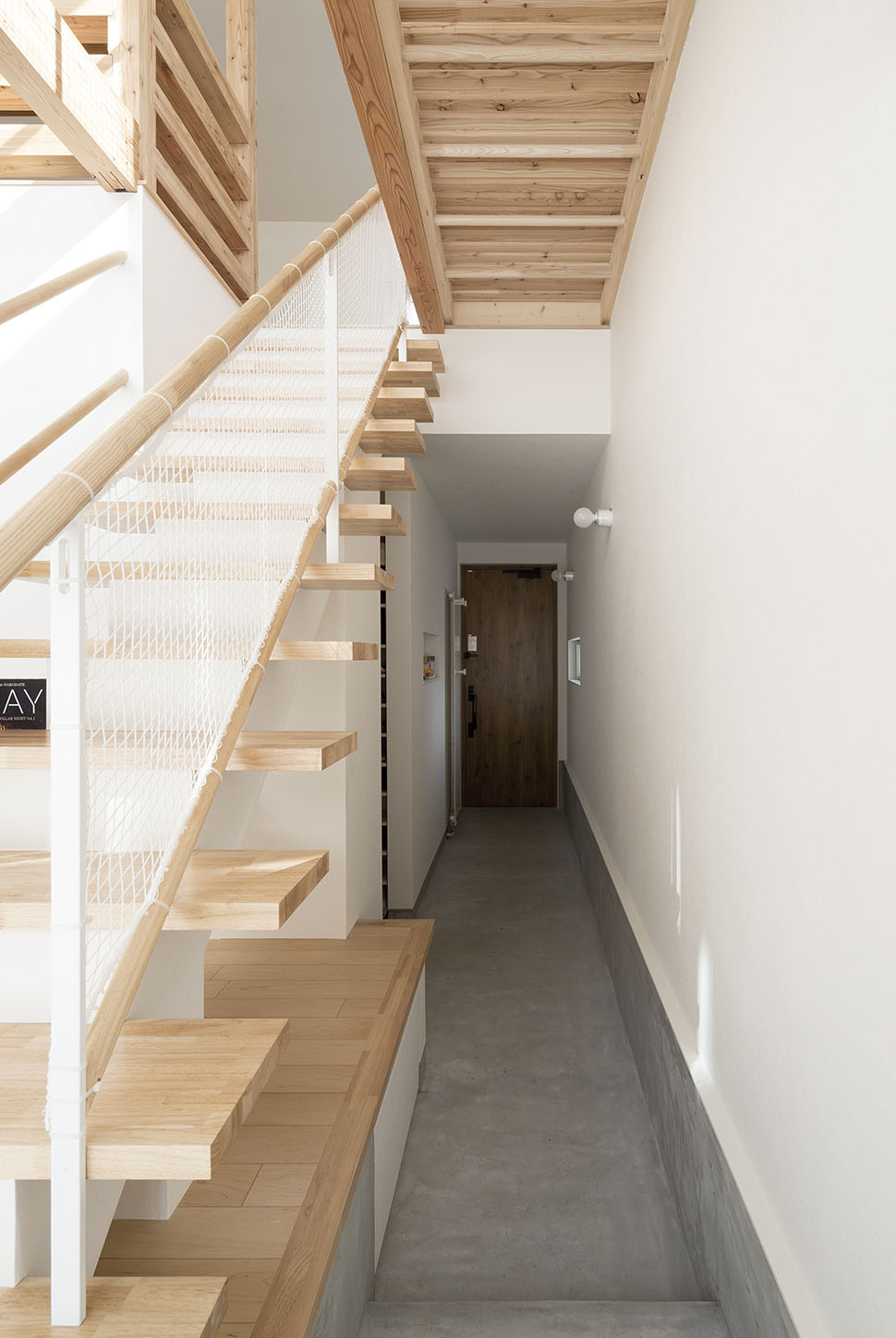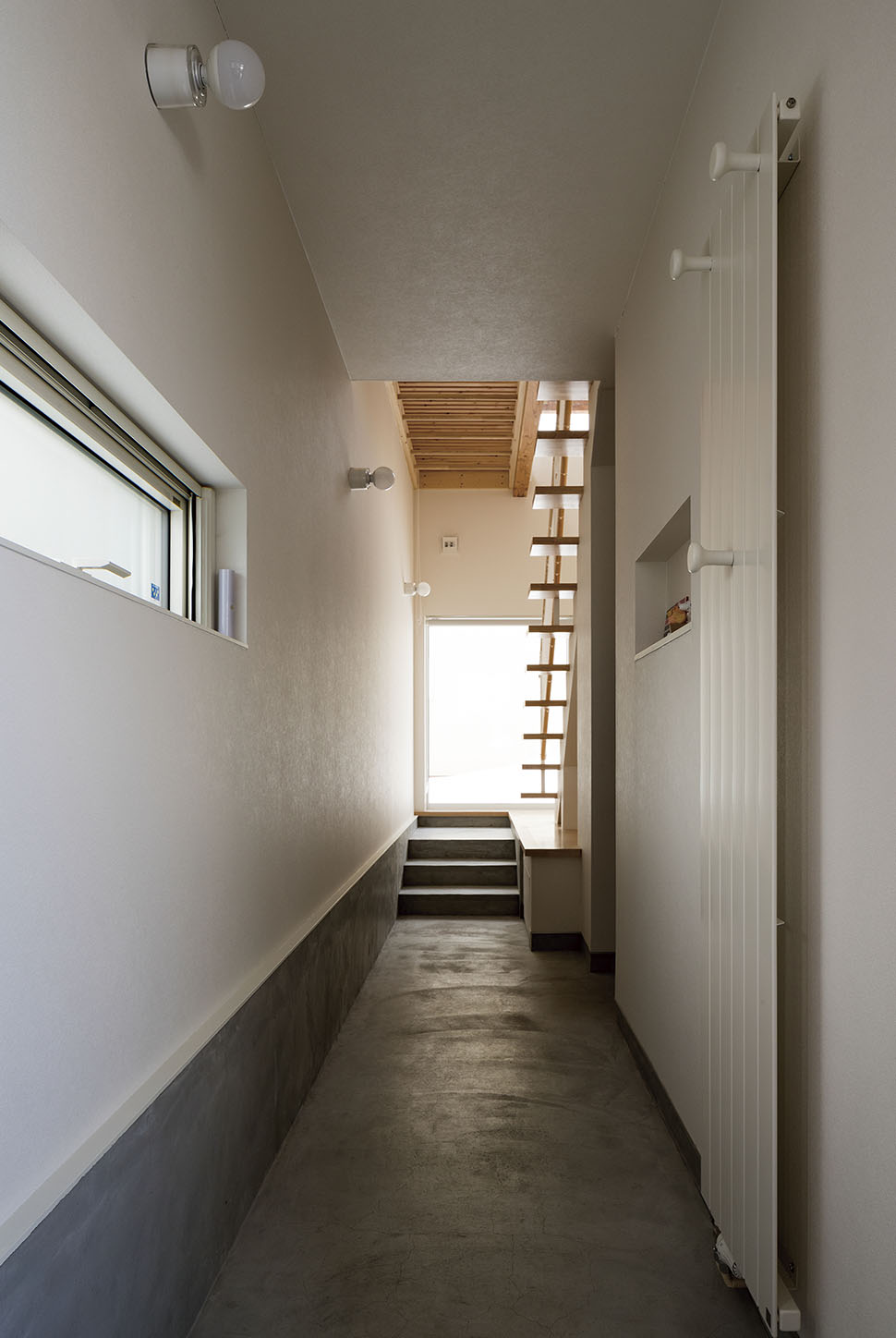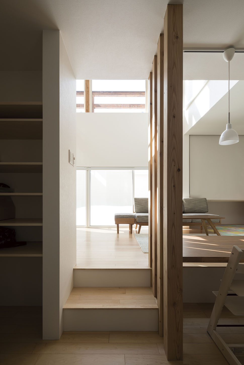 段差のついた敷地形状を利用して、ご主人の希望であった「掘りごたつのようなダイニング」は叶えられ、靴が汚れて帰宅するため、水で洗い流せる「土間」は光を吸収して印象的な玄関アプローチになっている。
